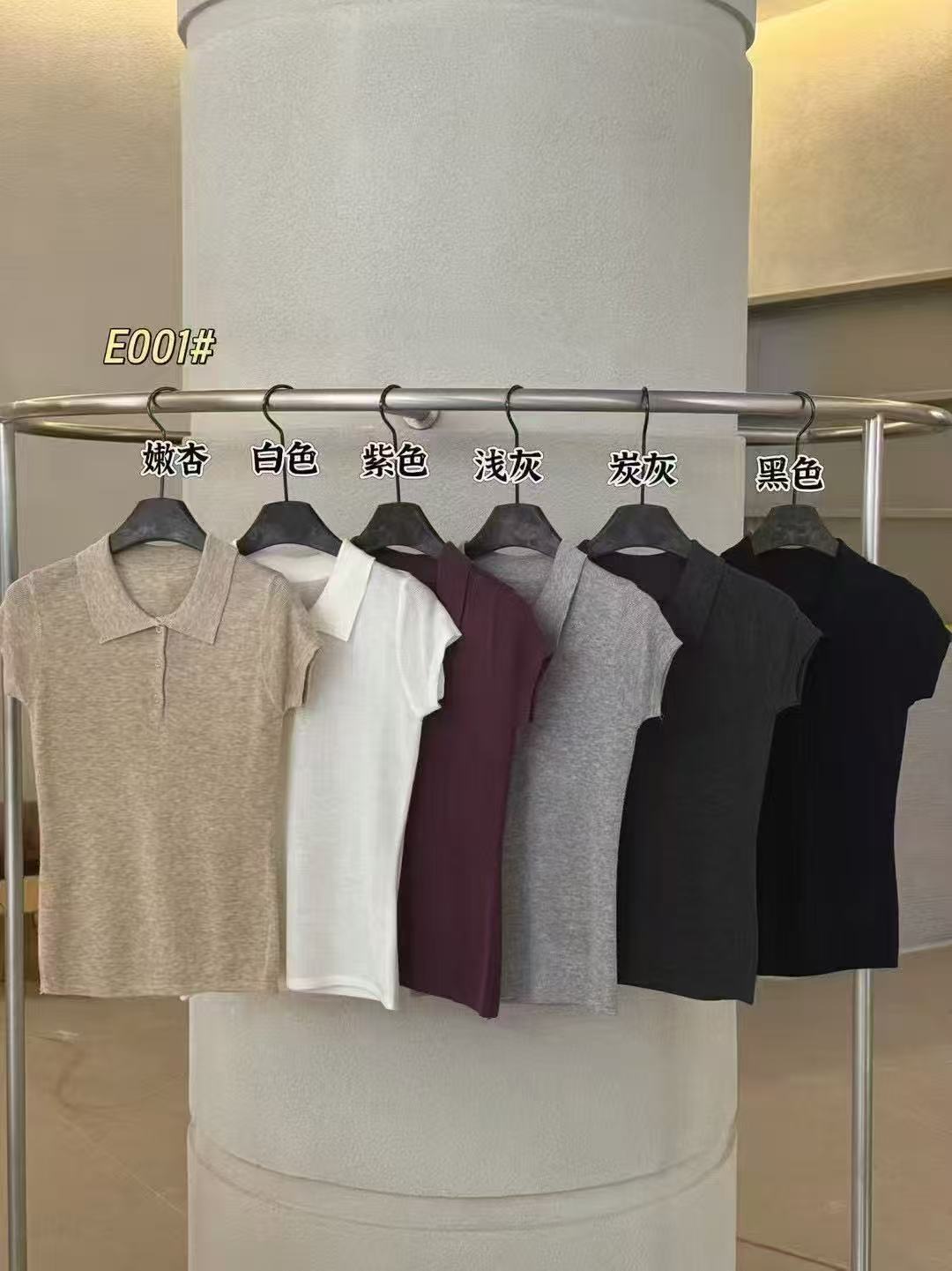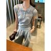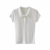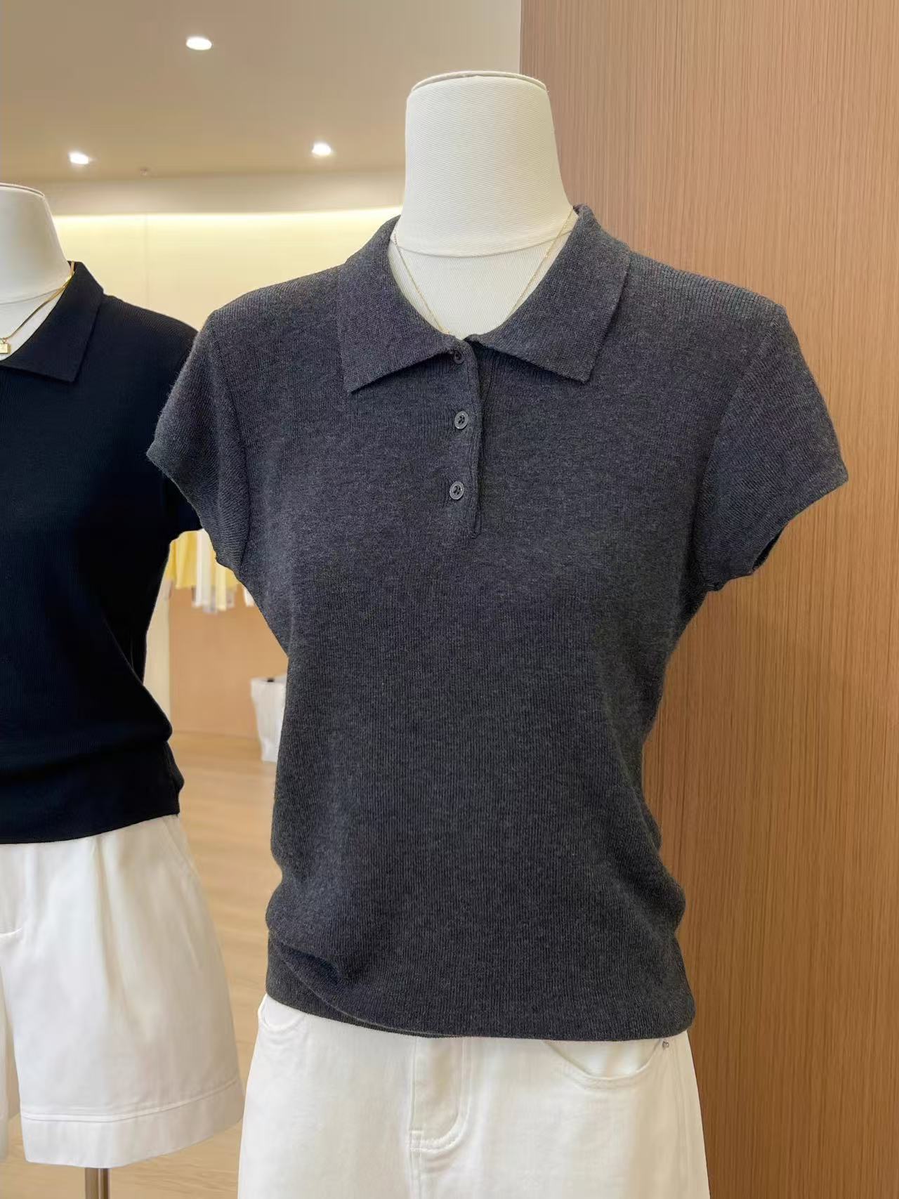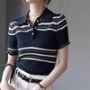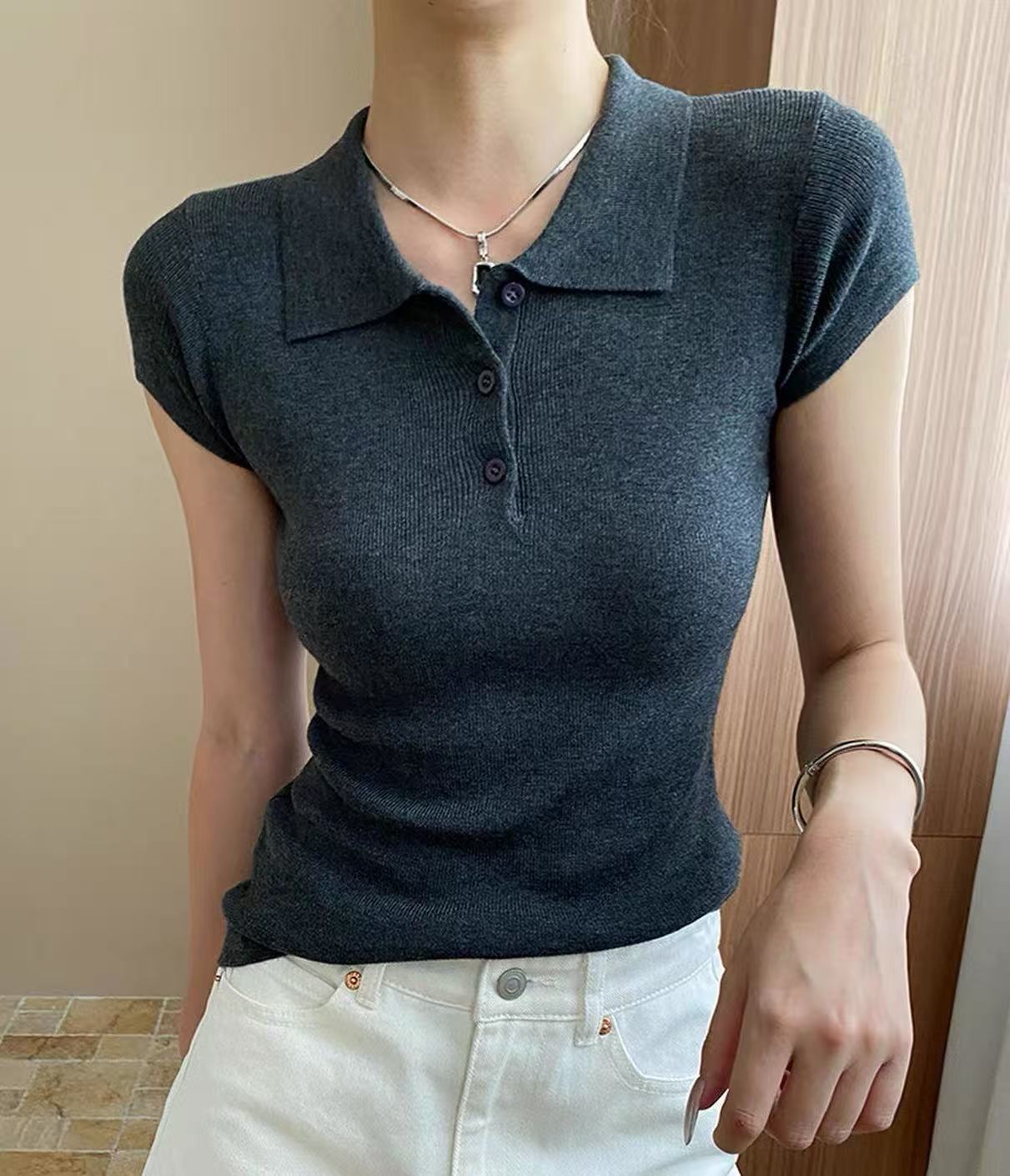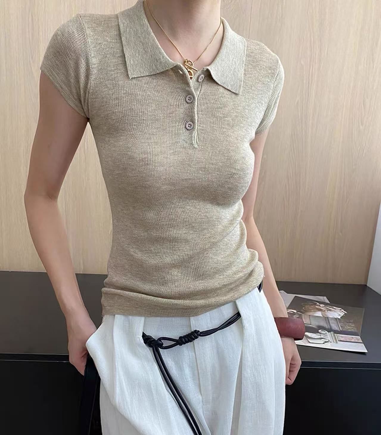 Temperamento francés polo cuello tejido camiseta de manga corta mujer 2025 nuevo verano alta gama delgada y adelgazante top de media manga