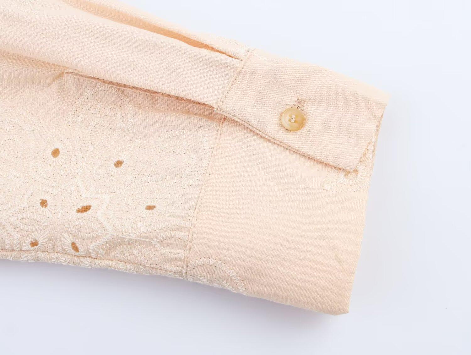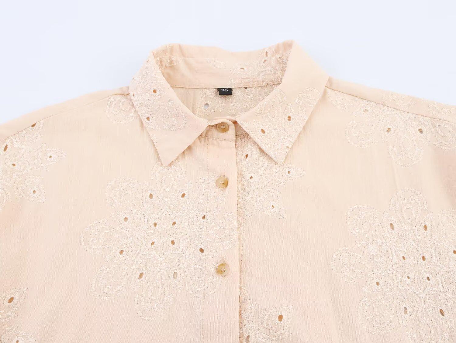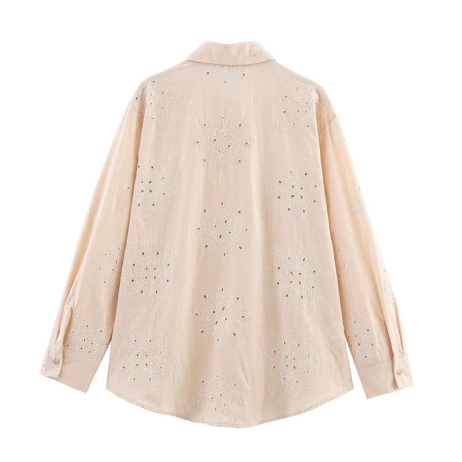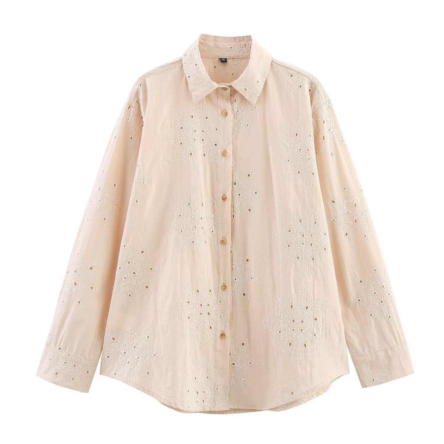 2025 Verano Nuevo Estilo Europeo y Americano Moda Versátil Casual Suelto Calado Bordado Manga Larga Camisa Top de un Solo Botón