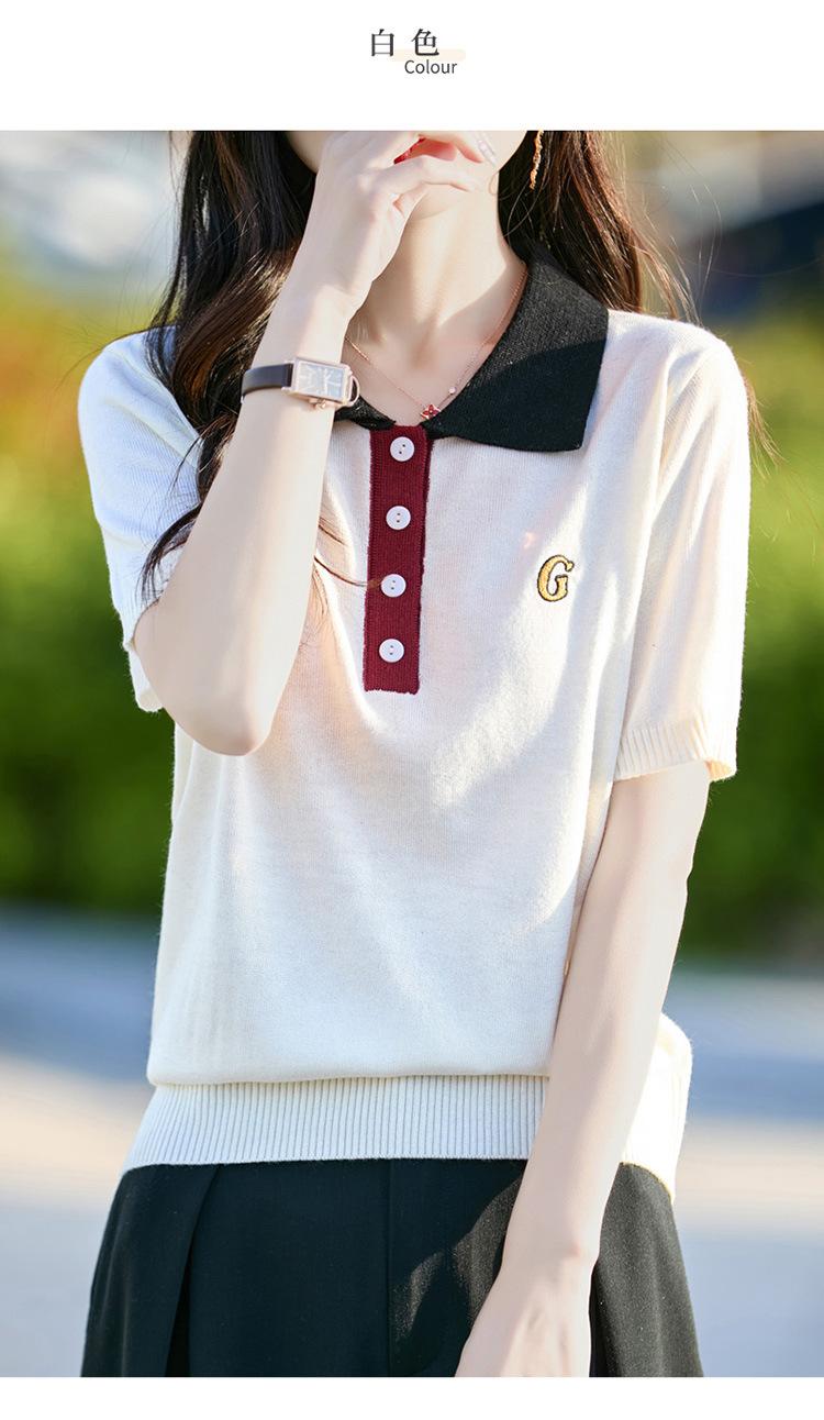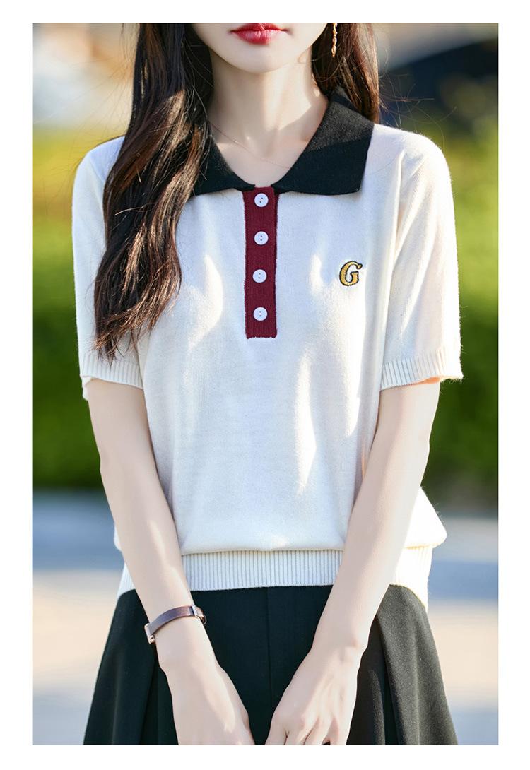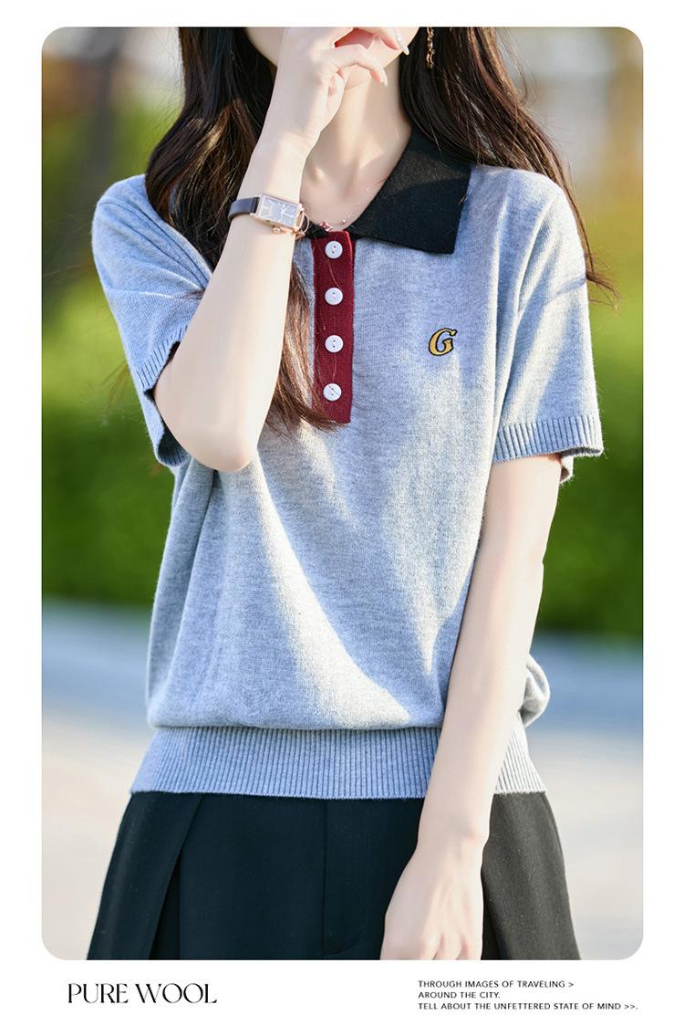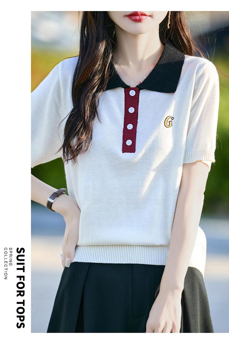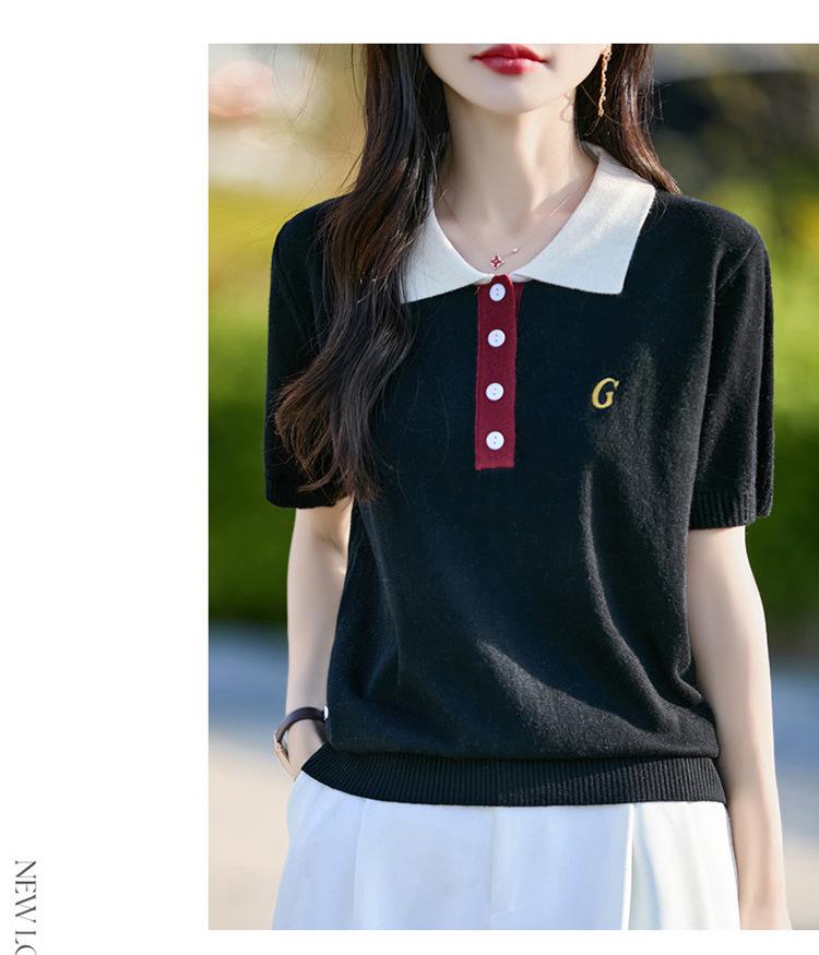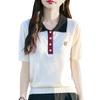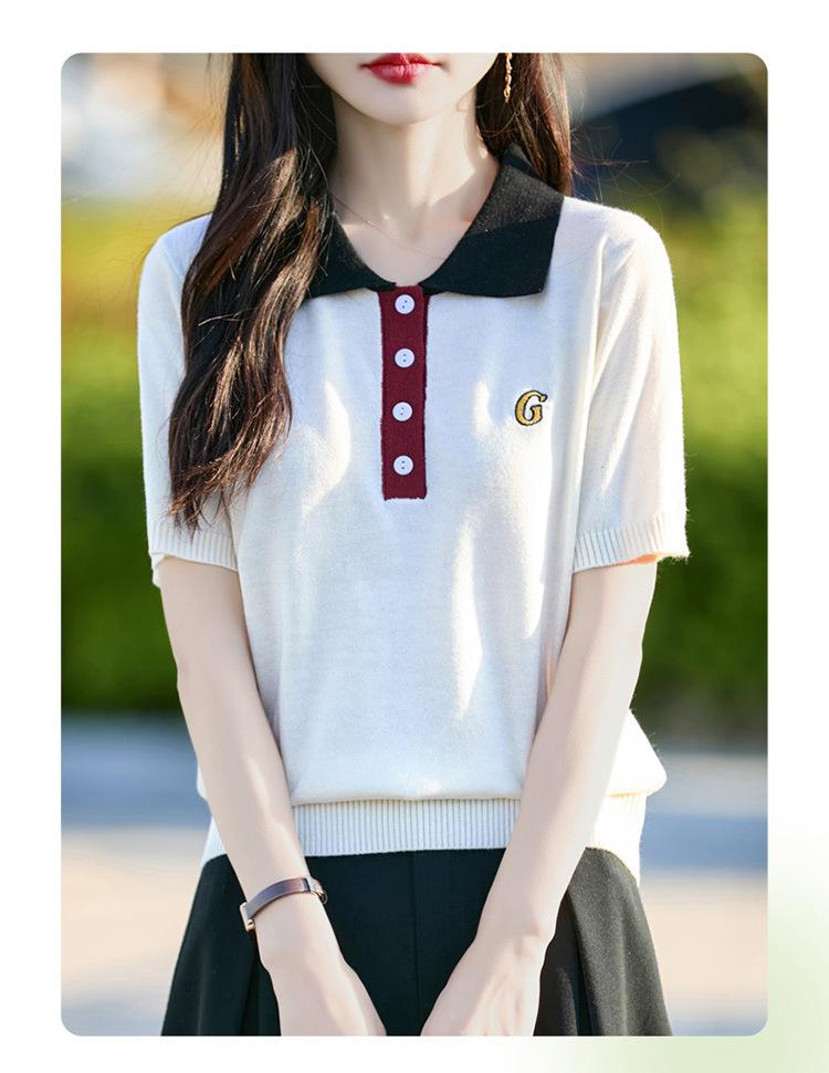 2025 Nuevo Verano Lana Peinada Polo Cuello Tejido Camiseta de Manga Corta para Mujer Color Bloqueado Bordado Letra Top