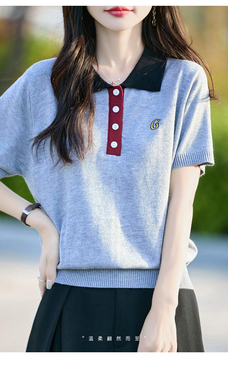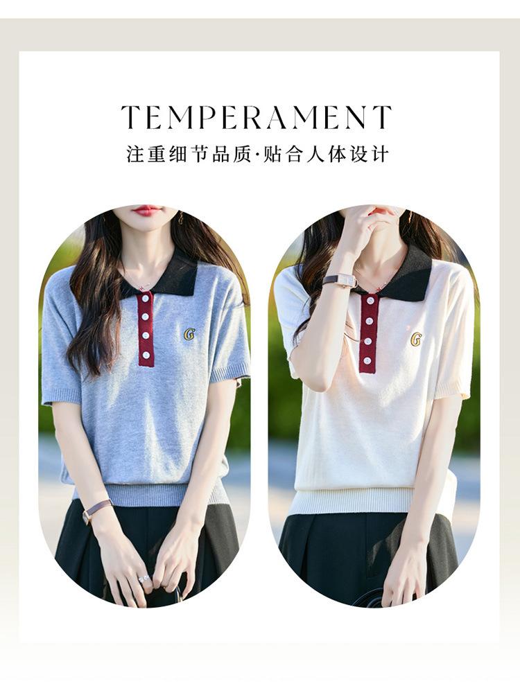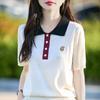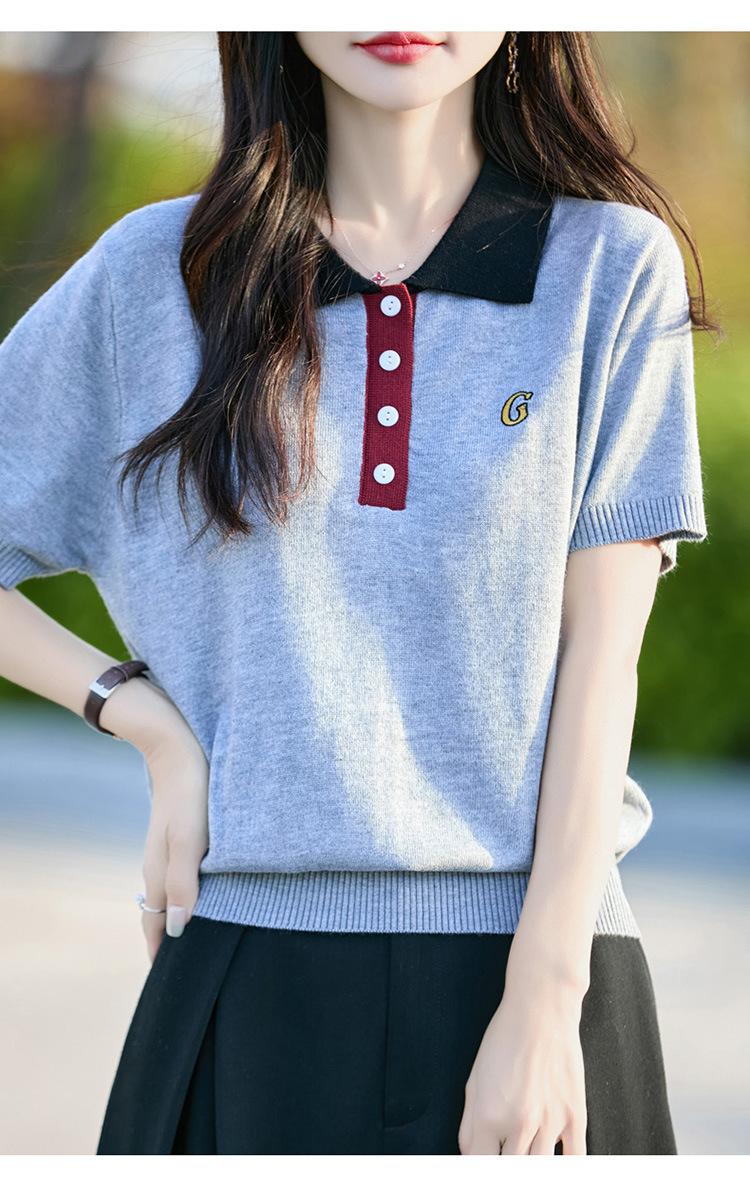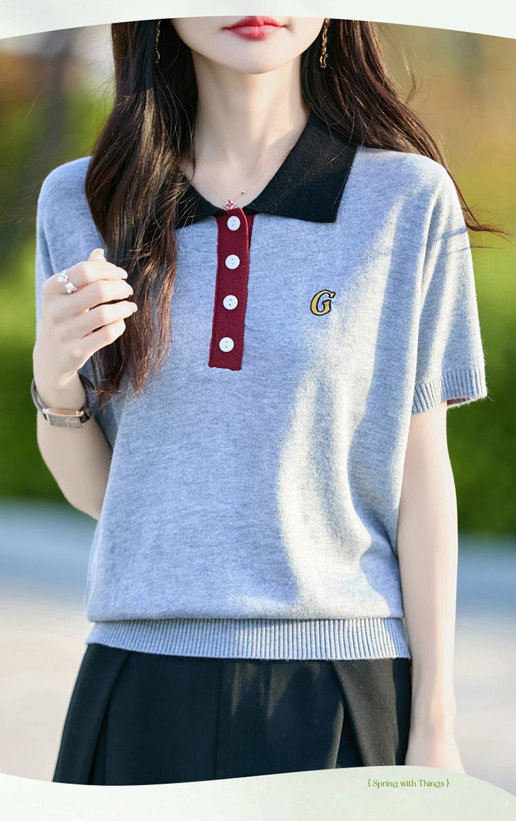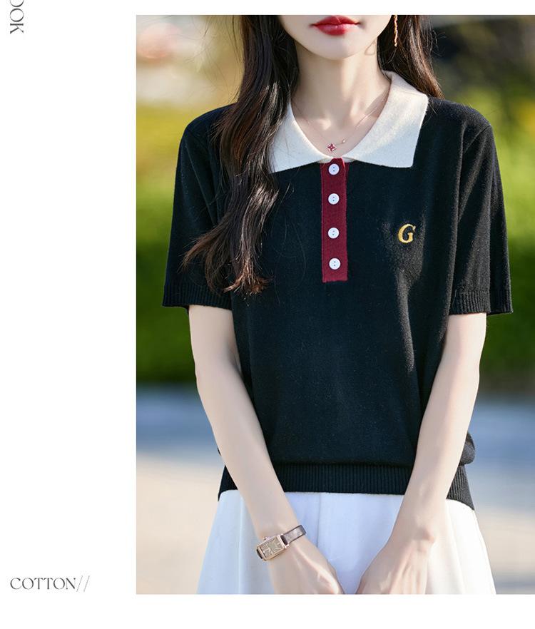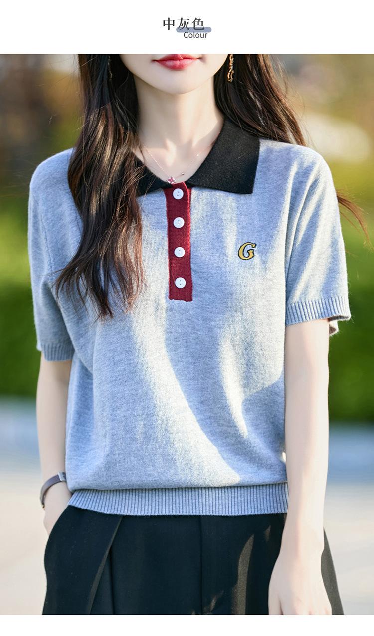 2025 Nuevo Verano Lana Peinada Polo Cuello Tejido Camiseta de Manga Corta para Mujer Color Bloqueado Bordado Letra Top
