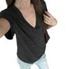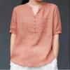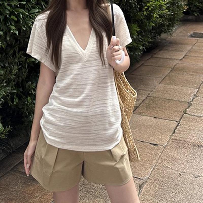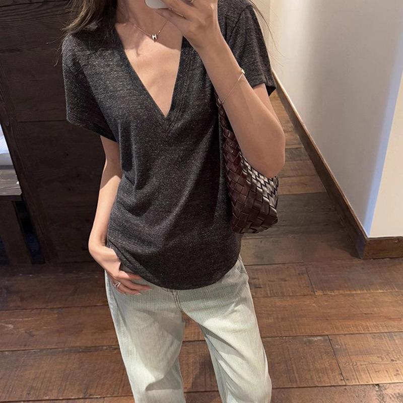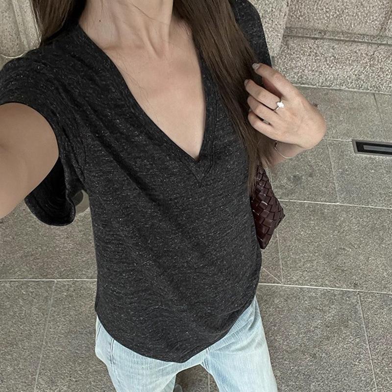 Camiseta de nicho de lino de alta calidad con cuello en V profundo de tono perezoso para mujer, verano, holgada, adelgazante, versátil, manga corta 2025