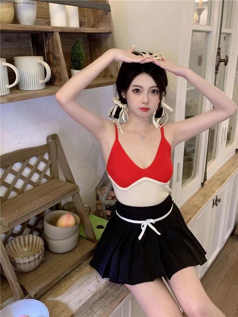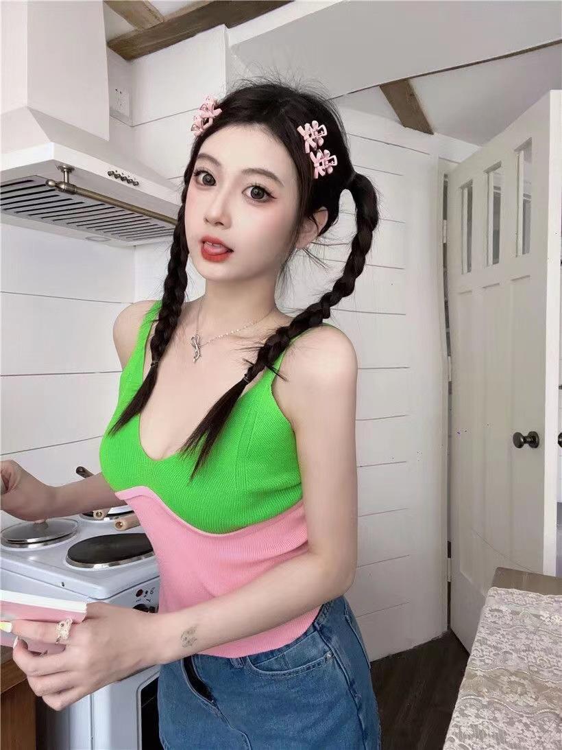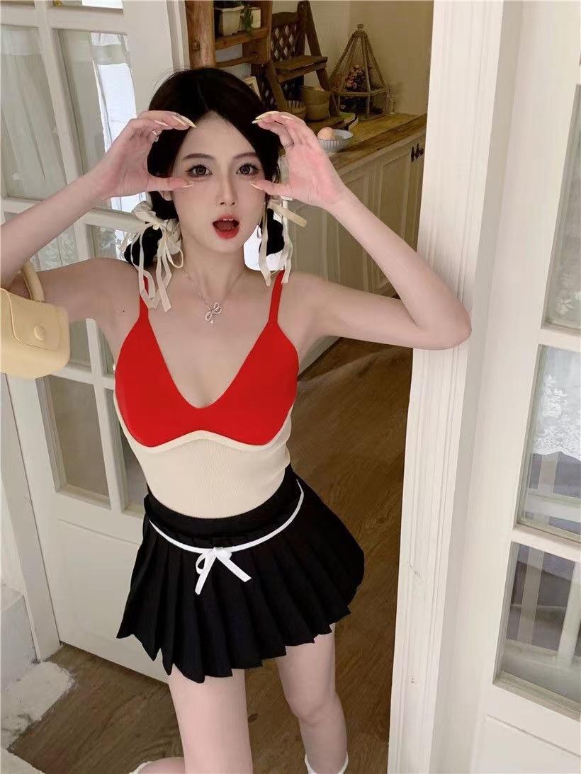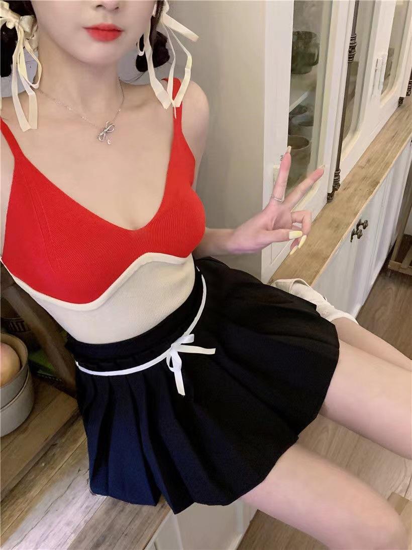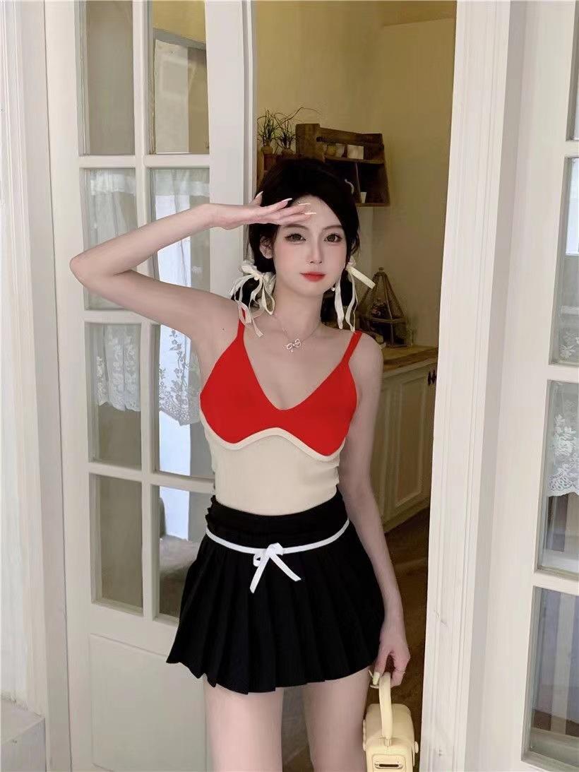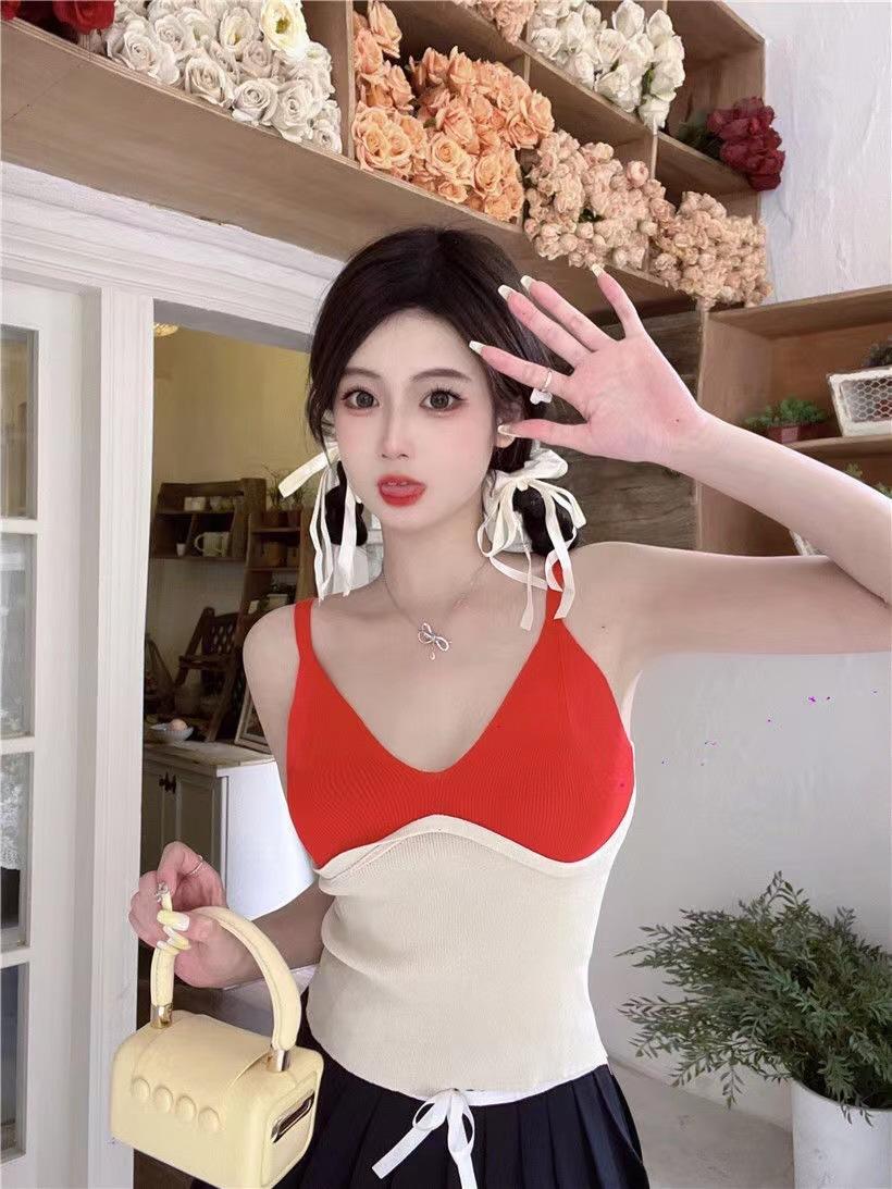 Retro Rojo Sexy Sling para Mujer Verano Nuevo Chaleco Seda de Hielo Look Adelgazante Cuello V Top Corto sin Mangas Trendy