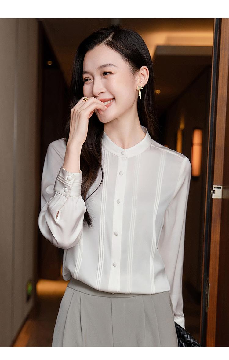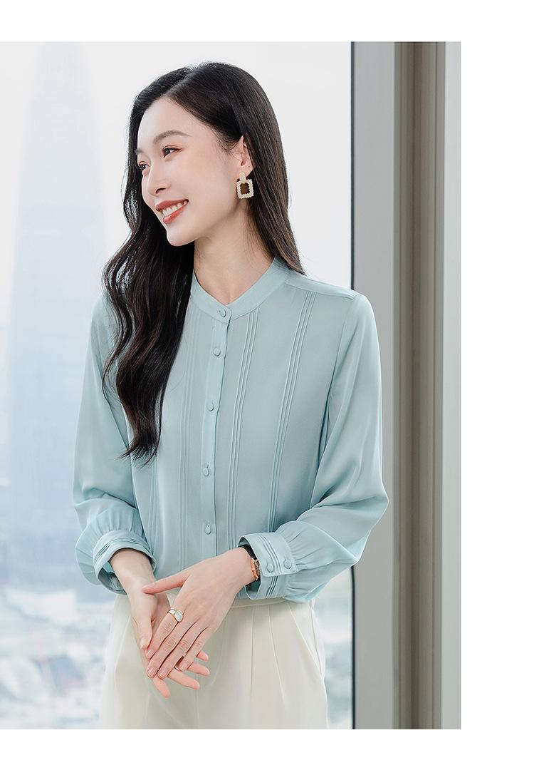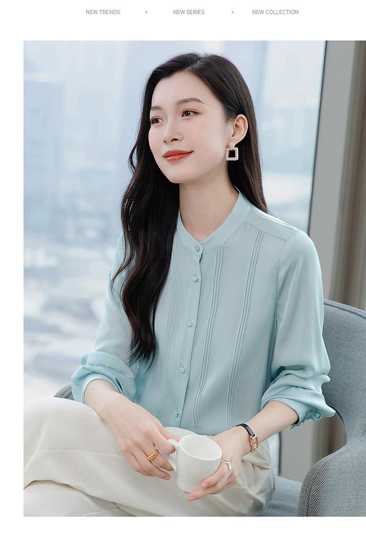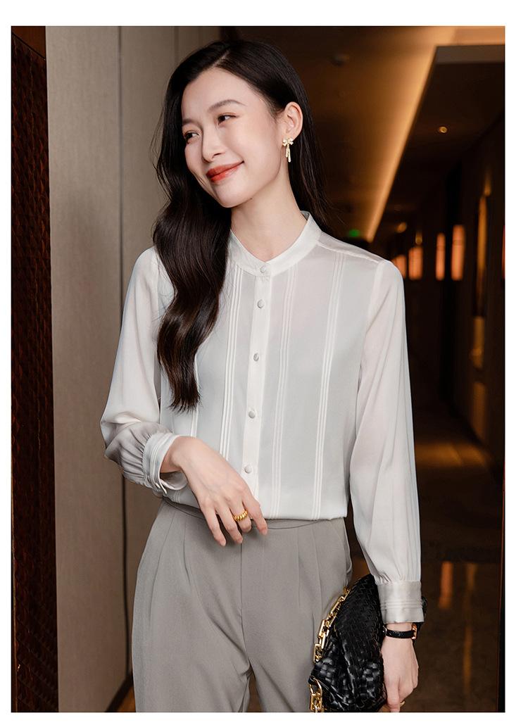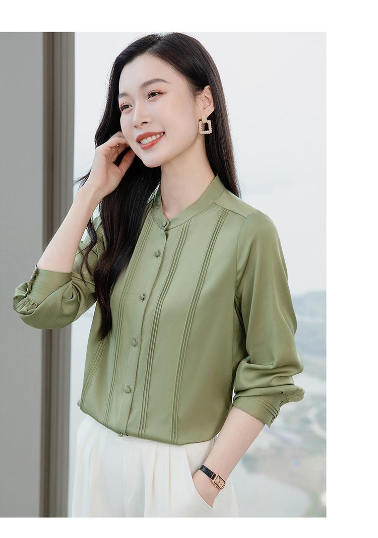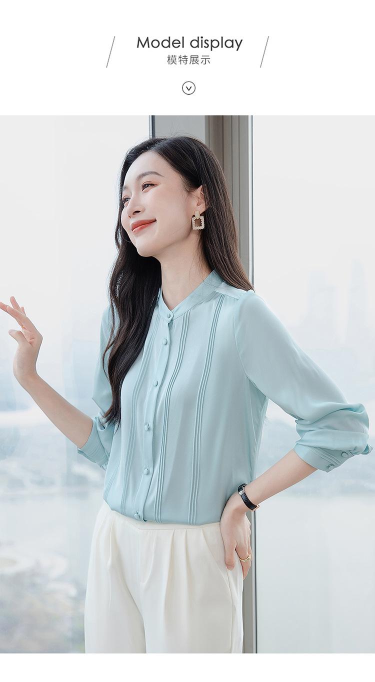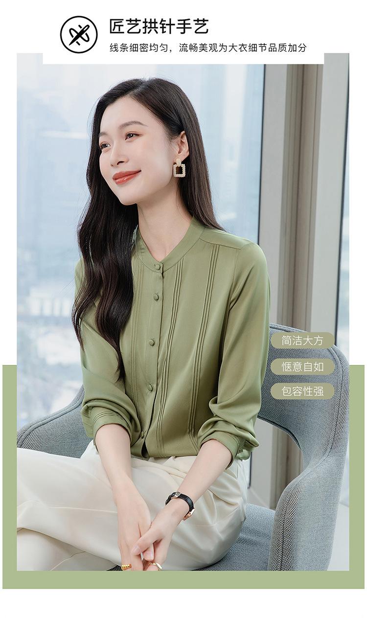 Primavera y Otoño Nuevo Estilo Color Sólido Diseño Plisado Cuello Redondo Camisa de Seda, Top Versátil y Elegante para Mujer