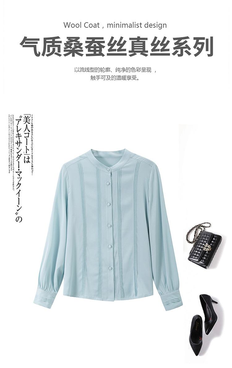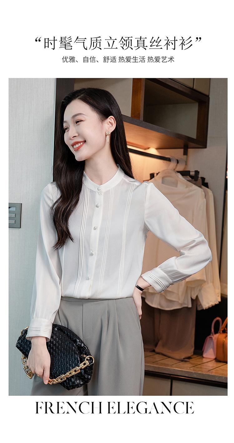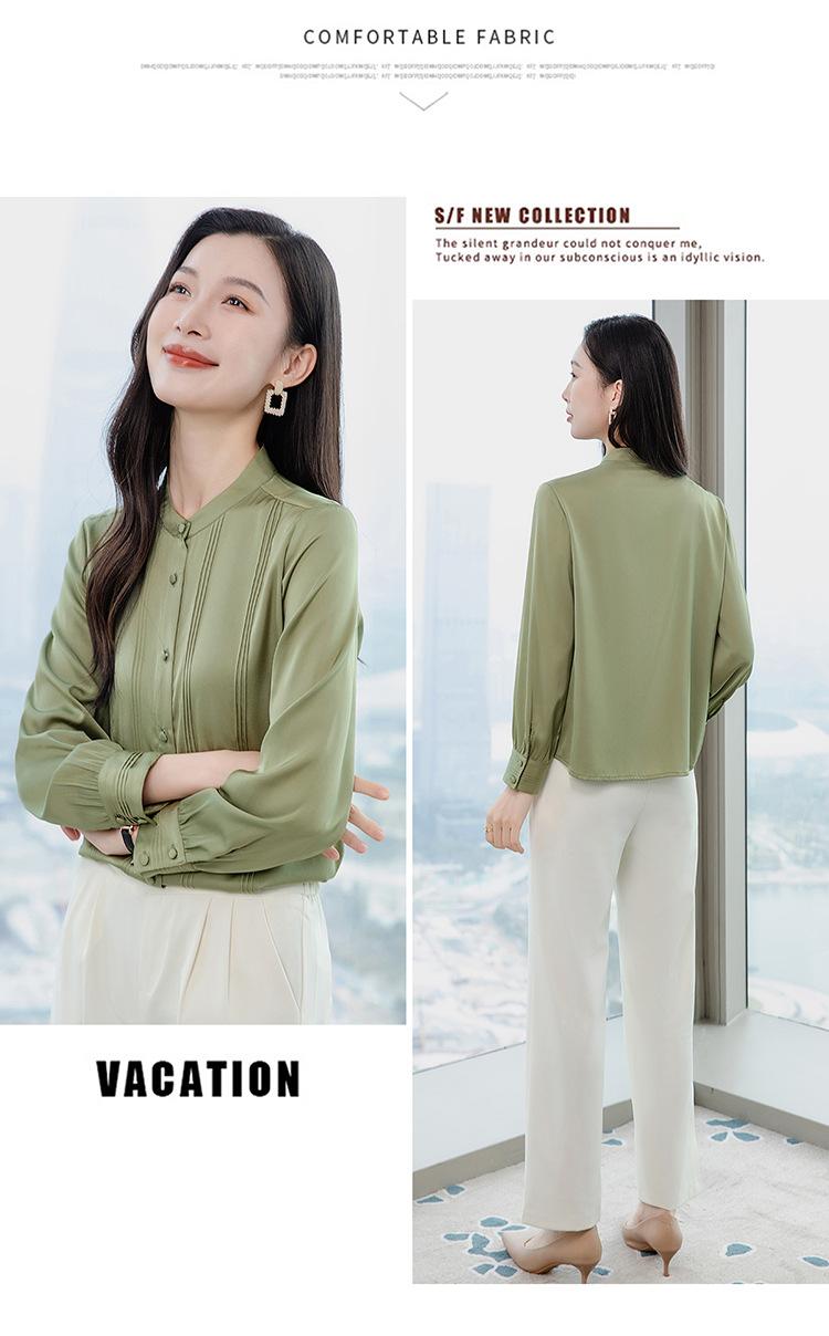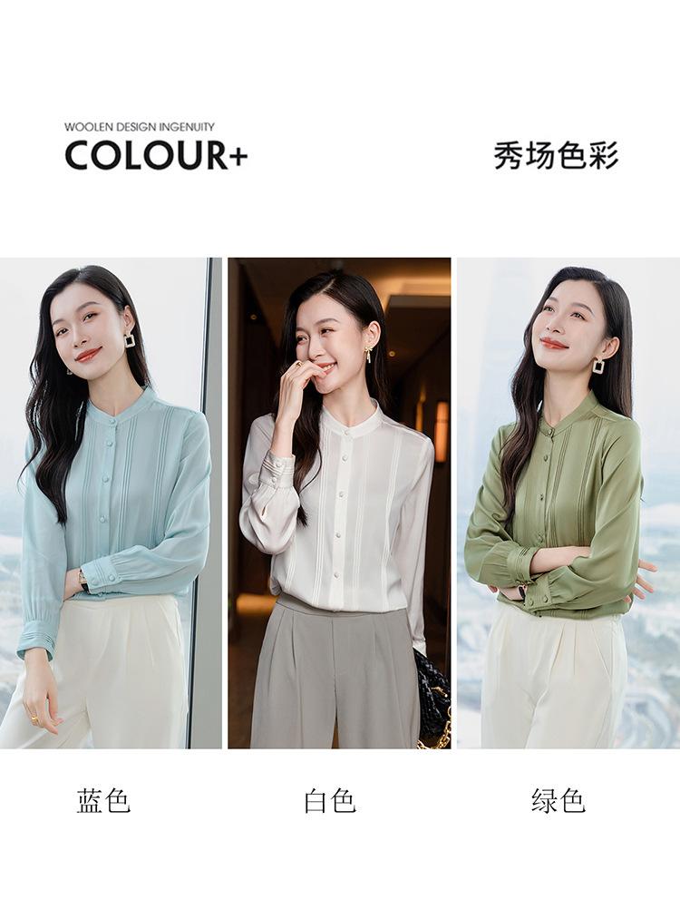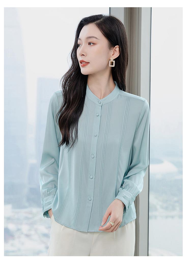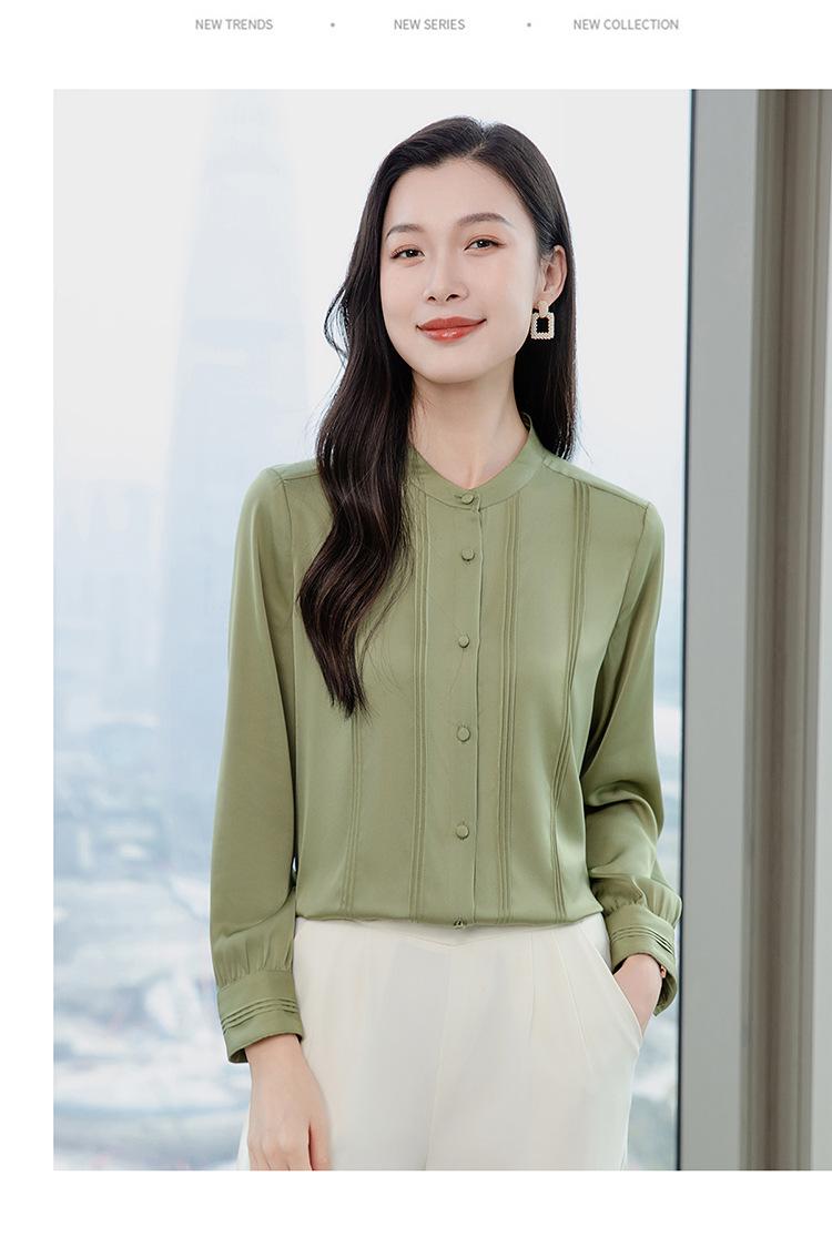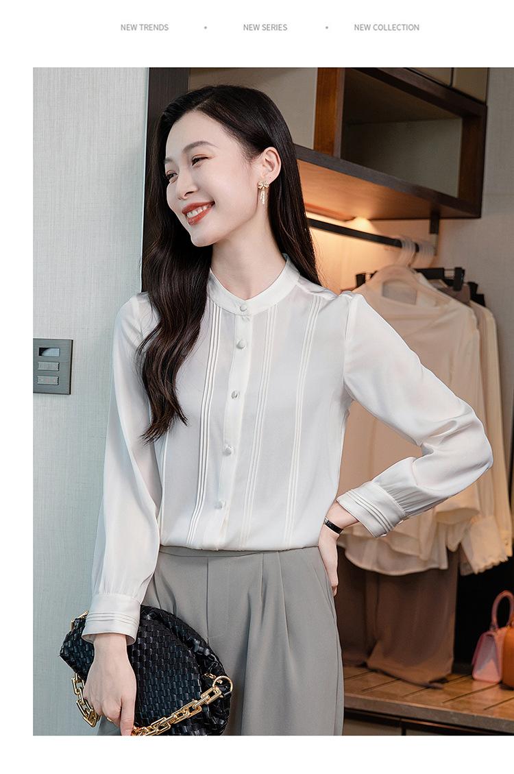 Primavera y Otoño Nuevo Estilo Color Sólido Diseño Plisado Cuello Redondo Camisa de Seda, Top Versátil y Elegante para Mujer