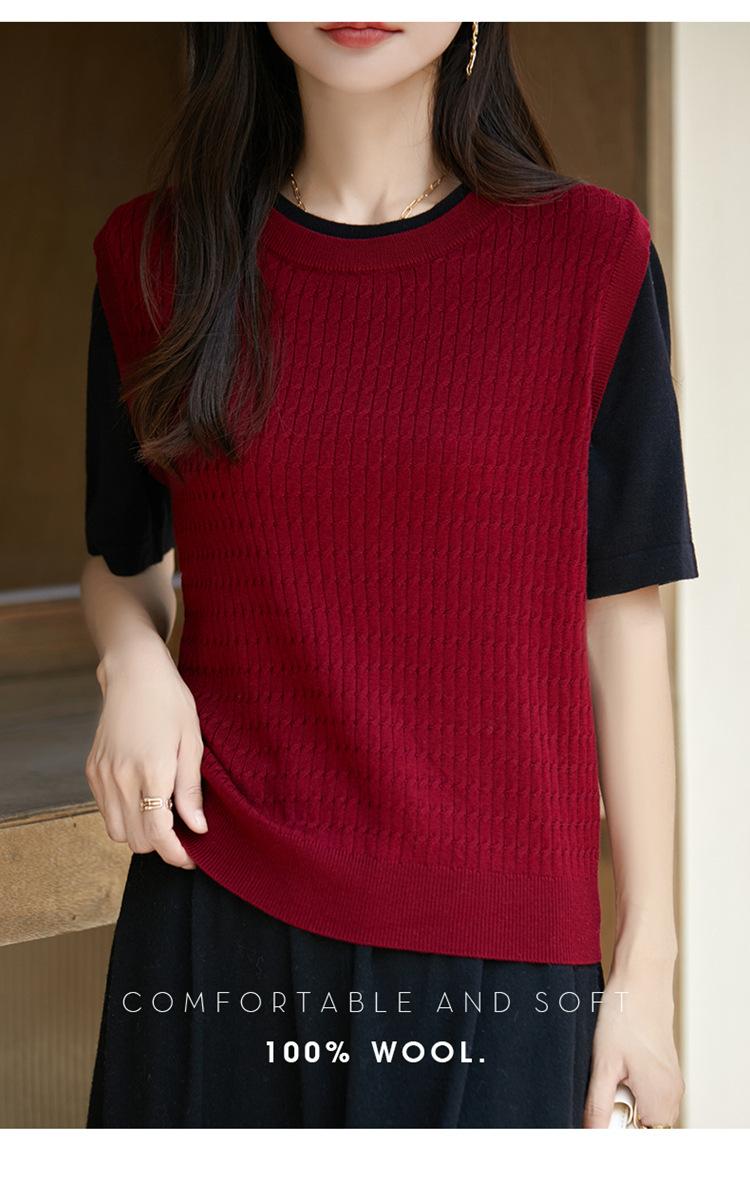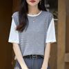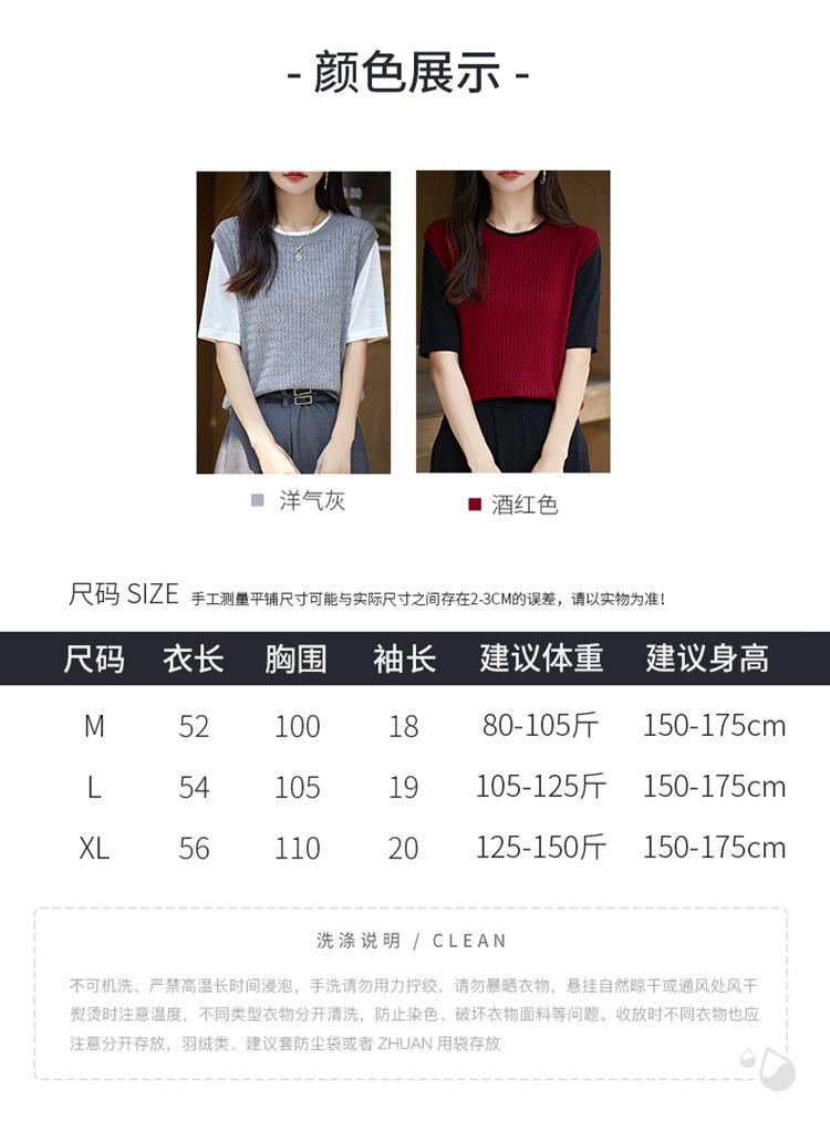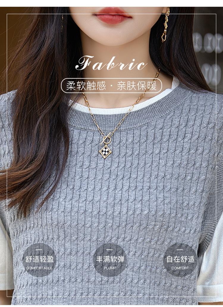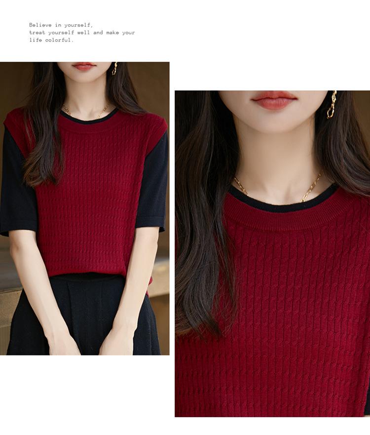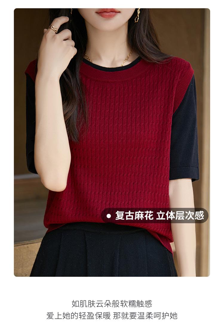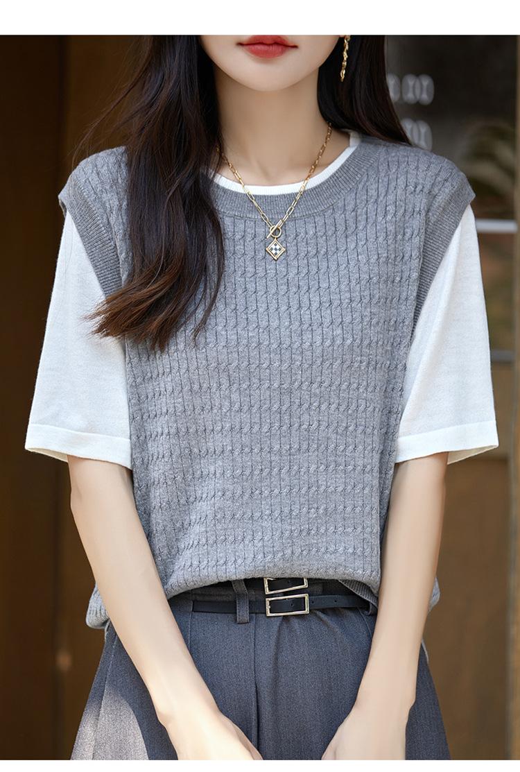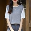 2025 Nuevo Otoño e Invierno Lana Peinada Cuello Redondo Tejido de Punto Manga Corta para Mujer Twist Contrastante Versátil Top Falso de Dos Piezas