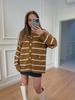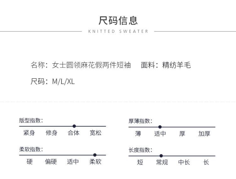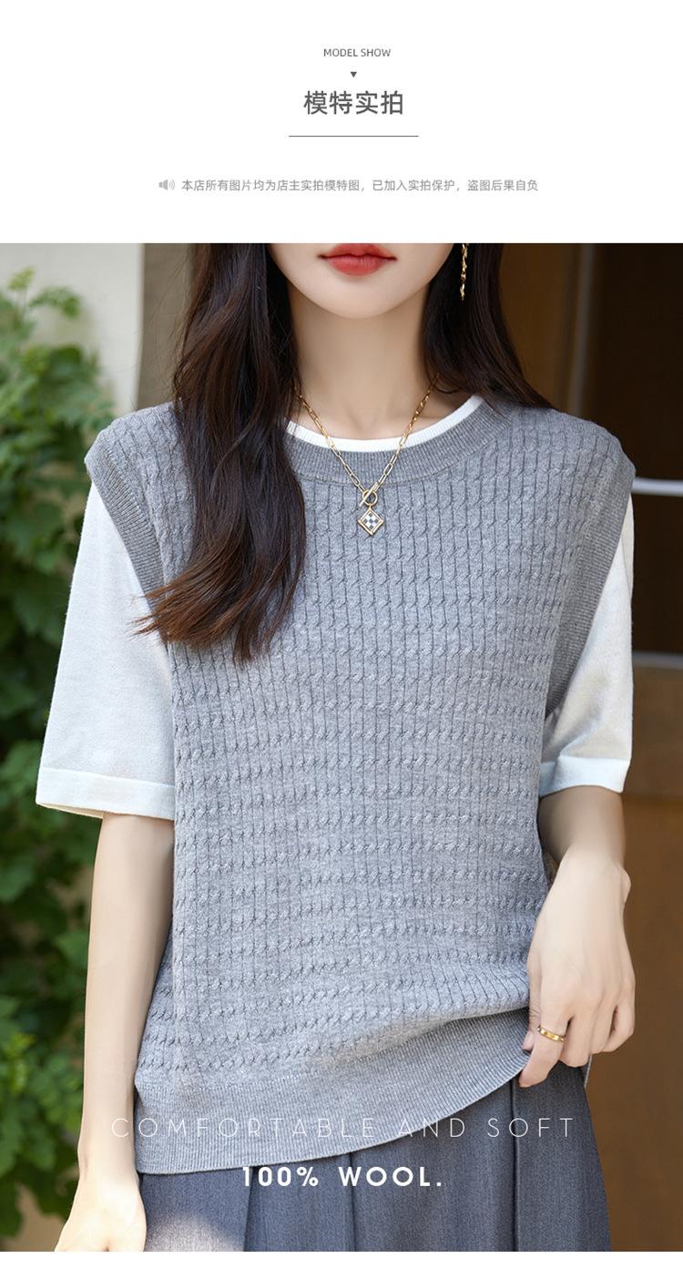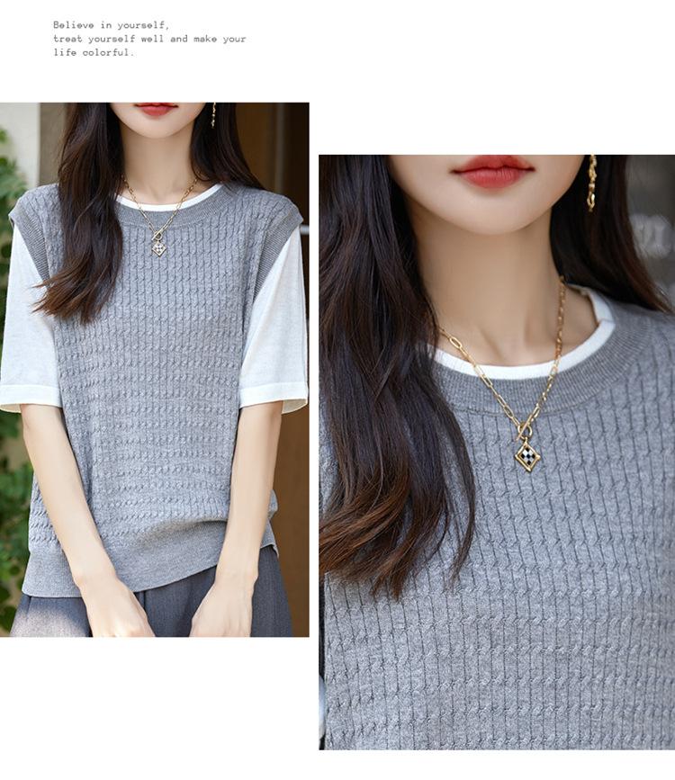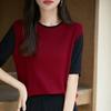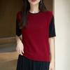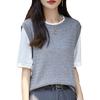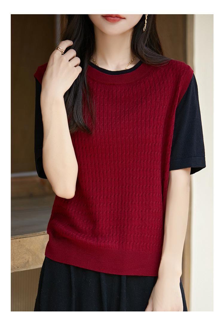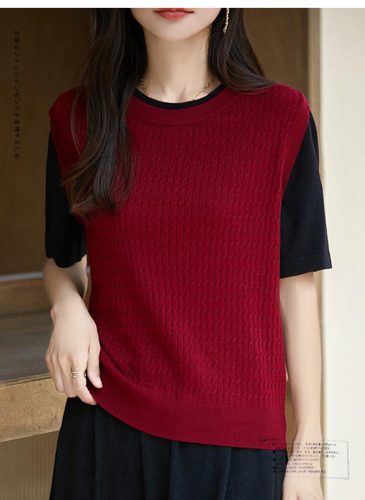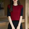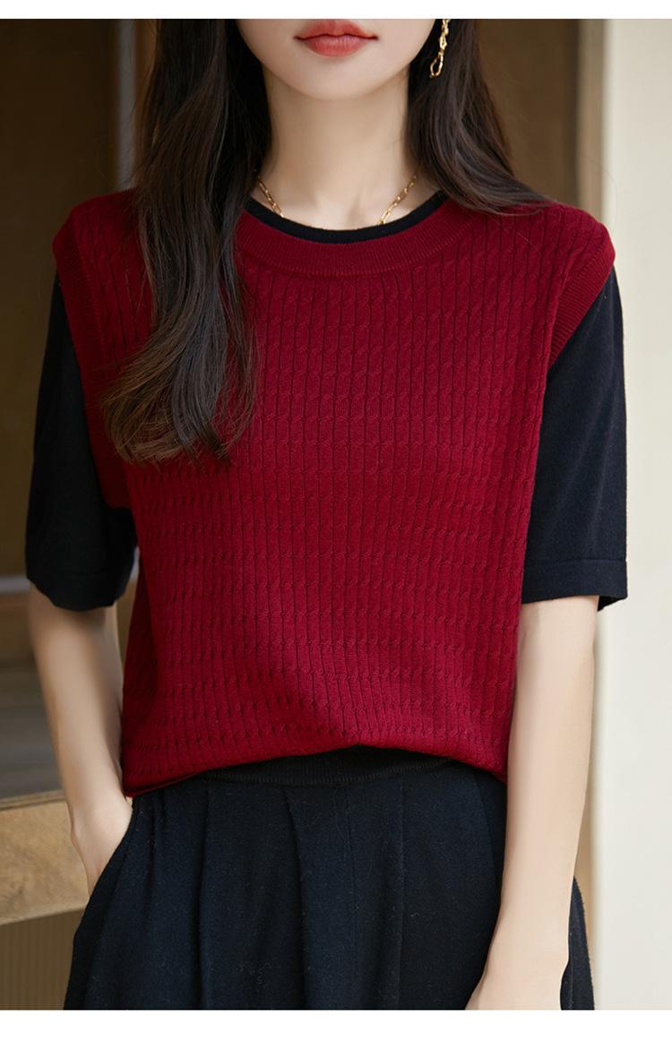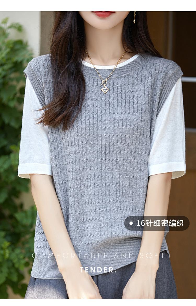 2025 Nuevo Otoño e Invierno Lana Peinada Cuello Redondo Tejido de Punto Manga Corta para Mujer Twist Contrastante Versátil Top Falso de Dos Piezas