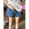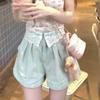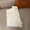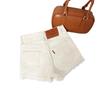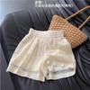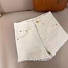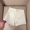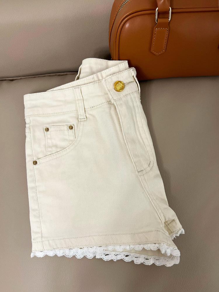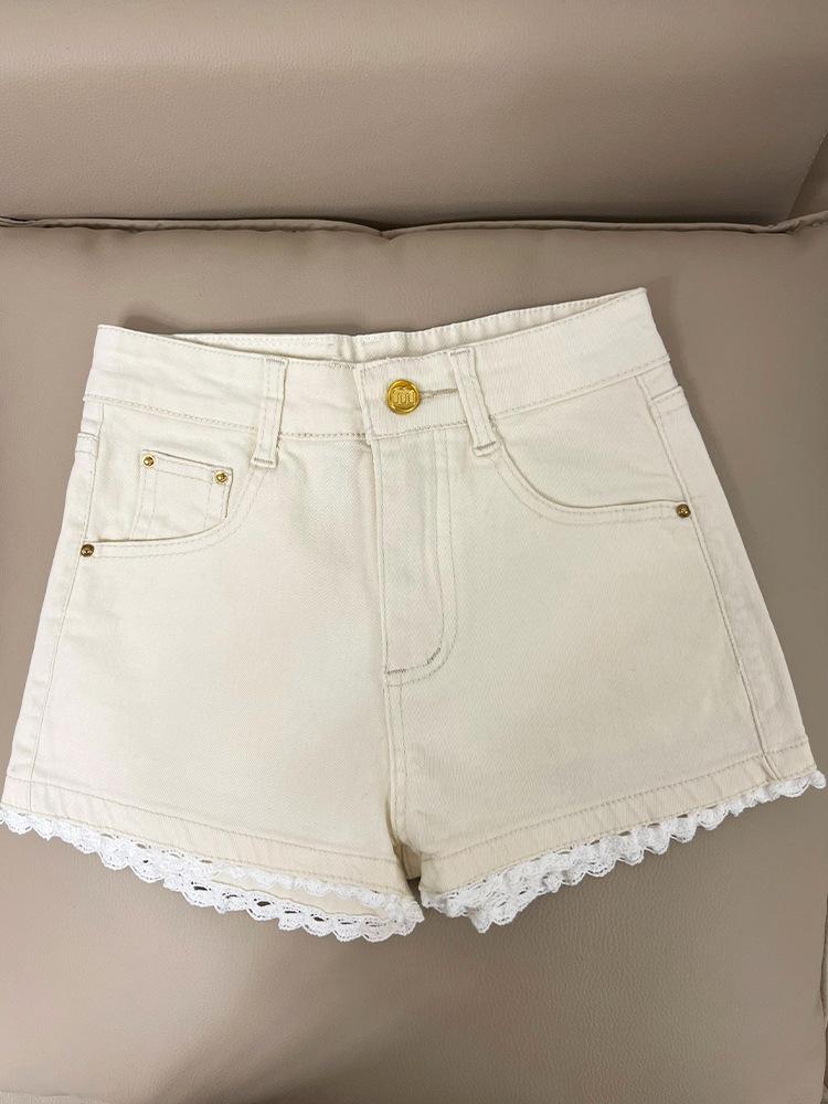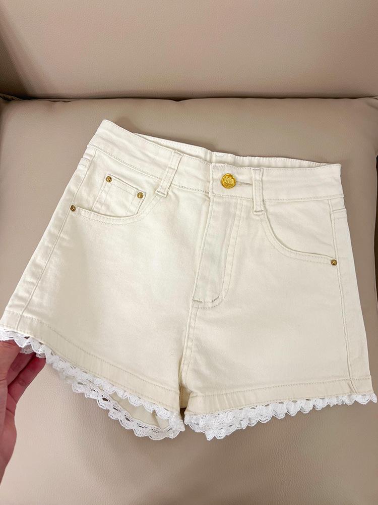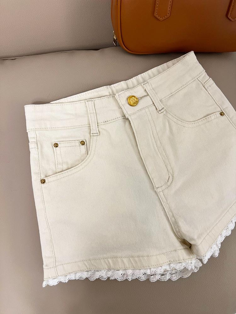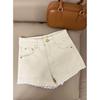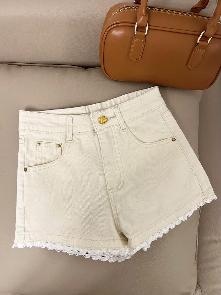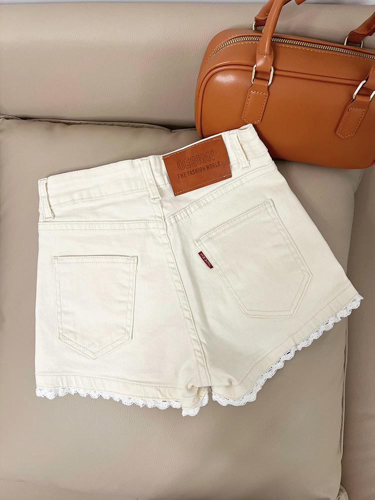 Shorts de mezclilla blanco hueso que reducen la edad para mujer verano delgados encaje patchwork cintura alta elásticos línea A pierna recta súper cortos hot pants
