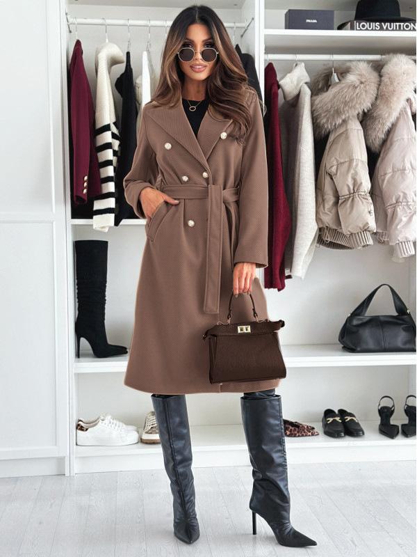 2024 Amazon AliExpress Nuevo Otoño e Invierno Moda Simple Color Sólido Abrigo de Lana con Correa de Doble Botonadura Ropa de Mujer