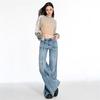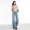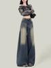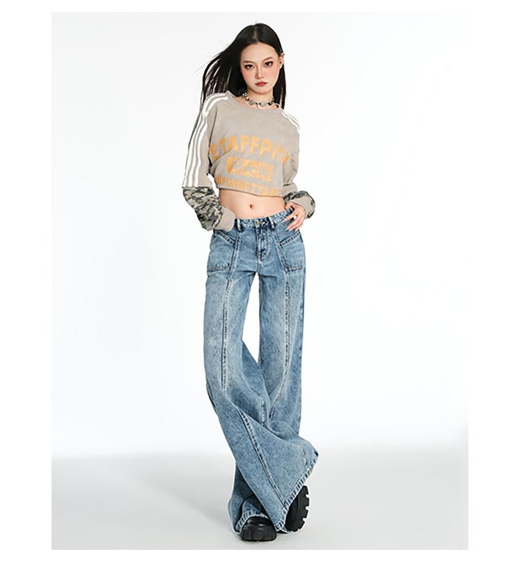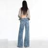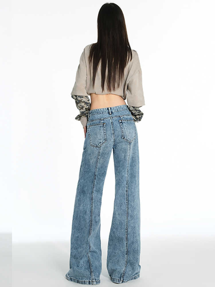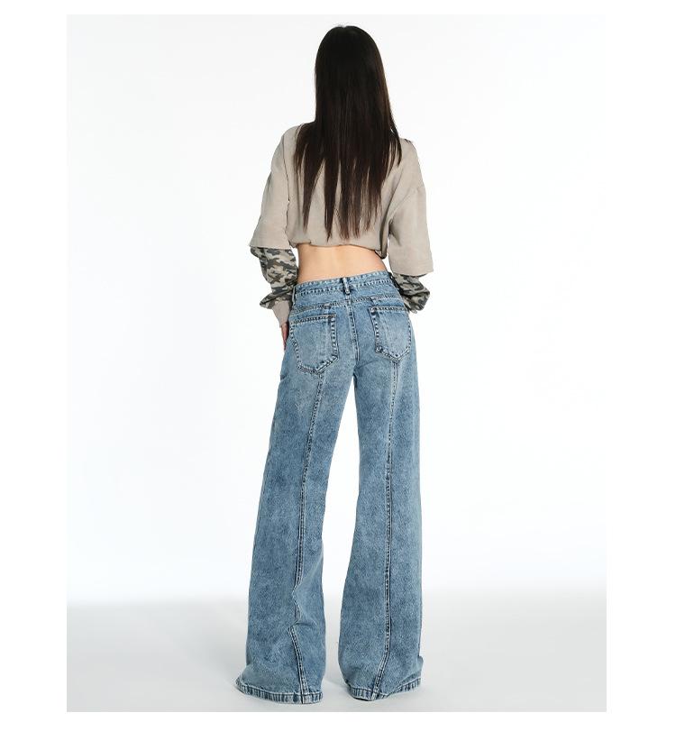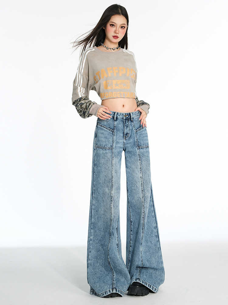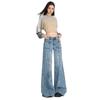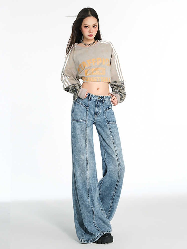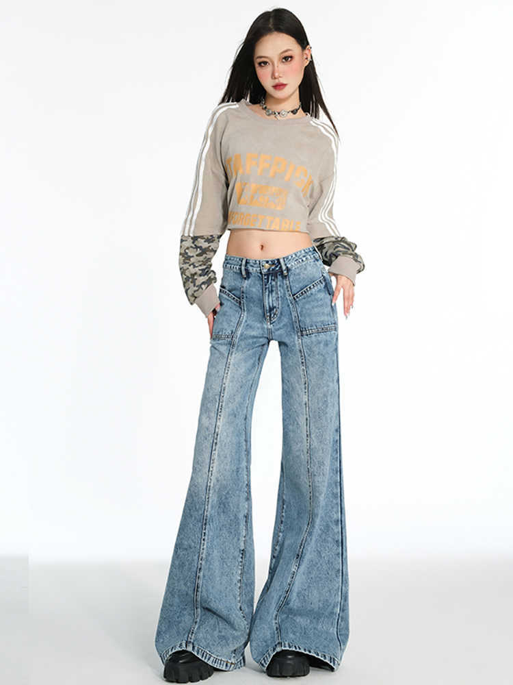Jeans Retro Lavado Azul Tiro Medio Pierna Ancha para Mujer Primavera 2025 Nuevo Estilo Diseño Empalmado Pantalones Sueltos Micro Acampanados