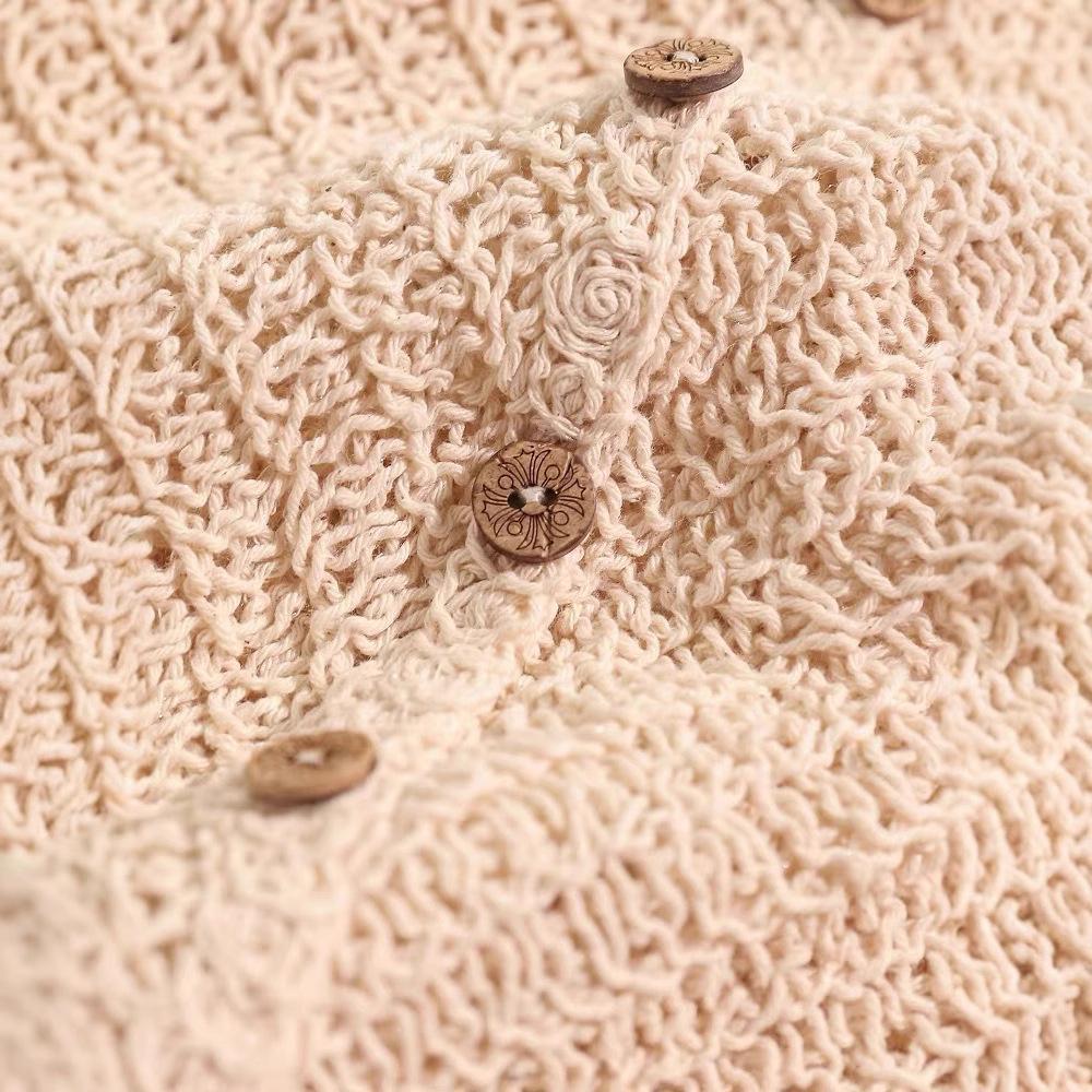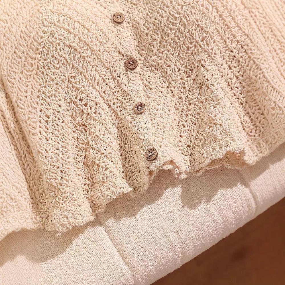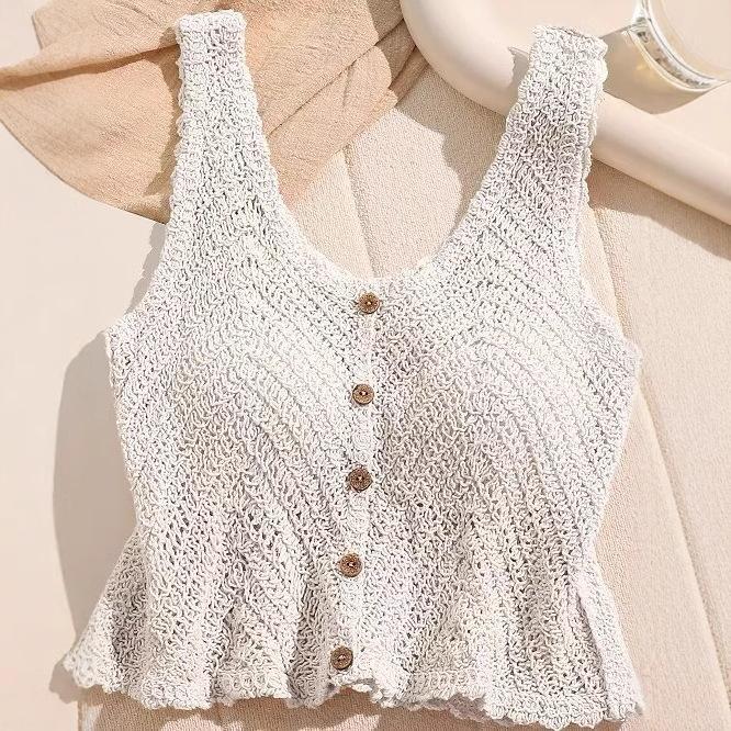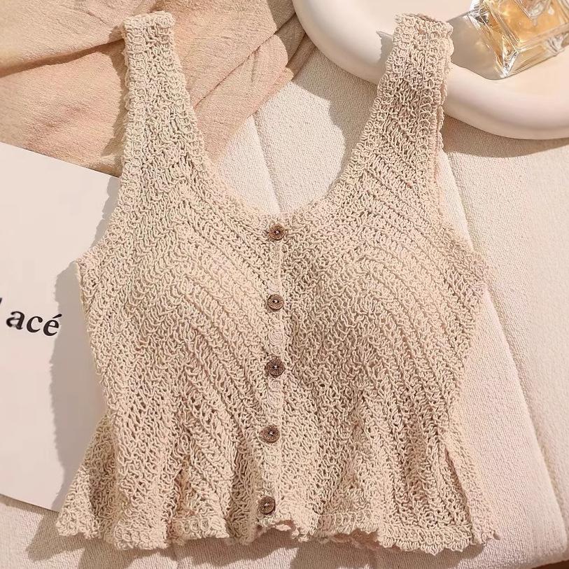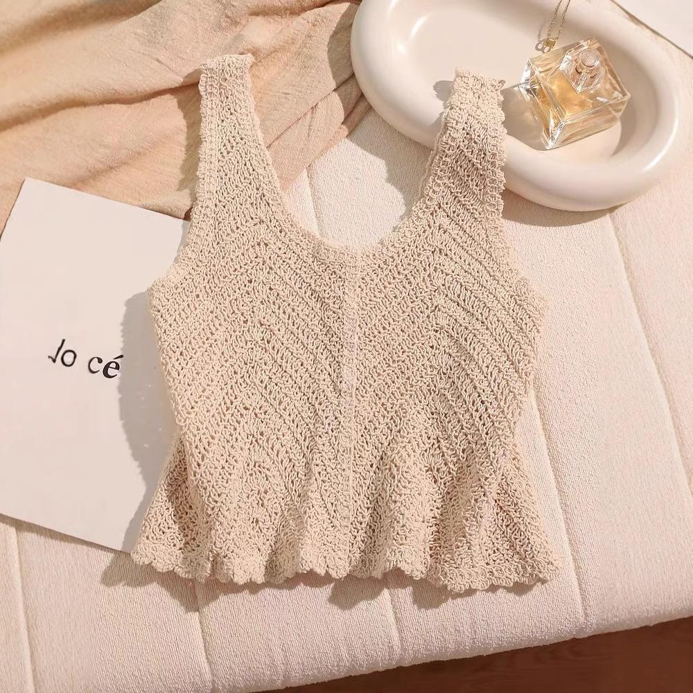 Camisola corta ajustada hueca francesa personalizada de fábrica para mujer, verano, ropa exterior, top de punto chic y super bonito
