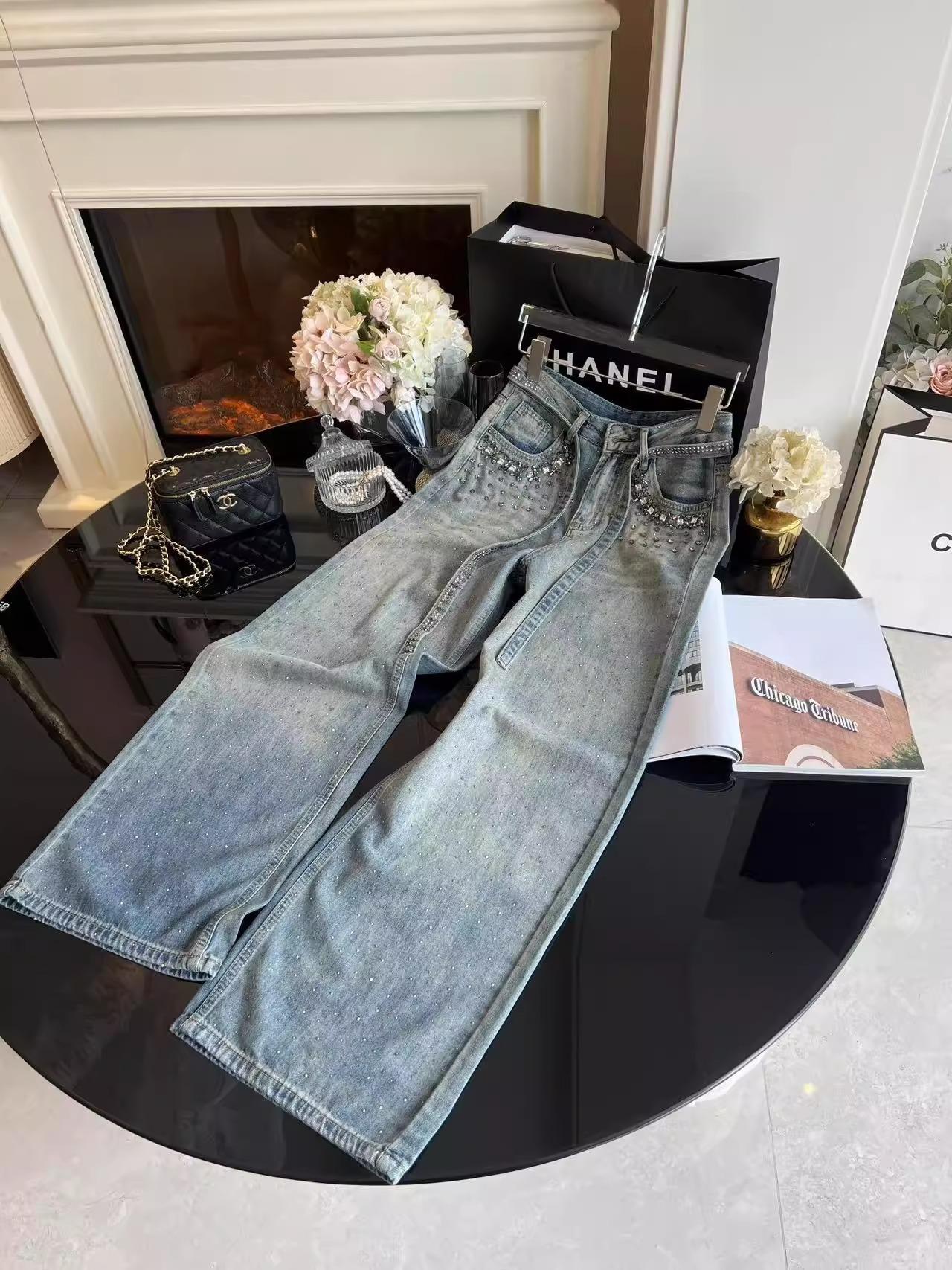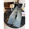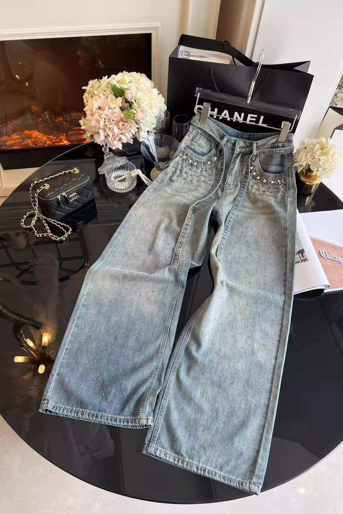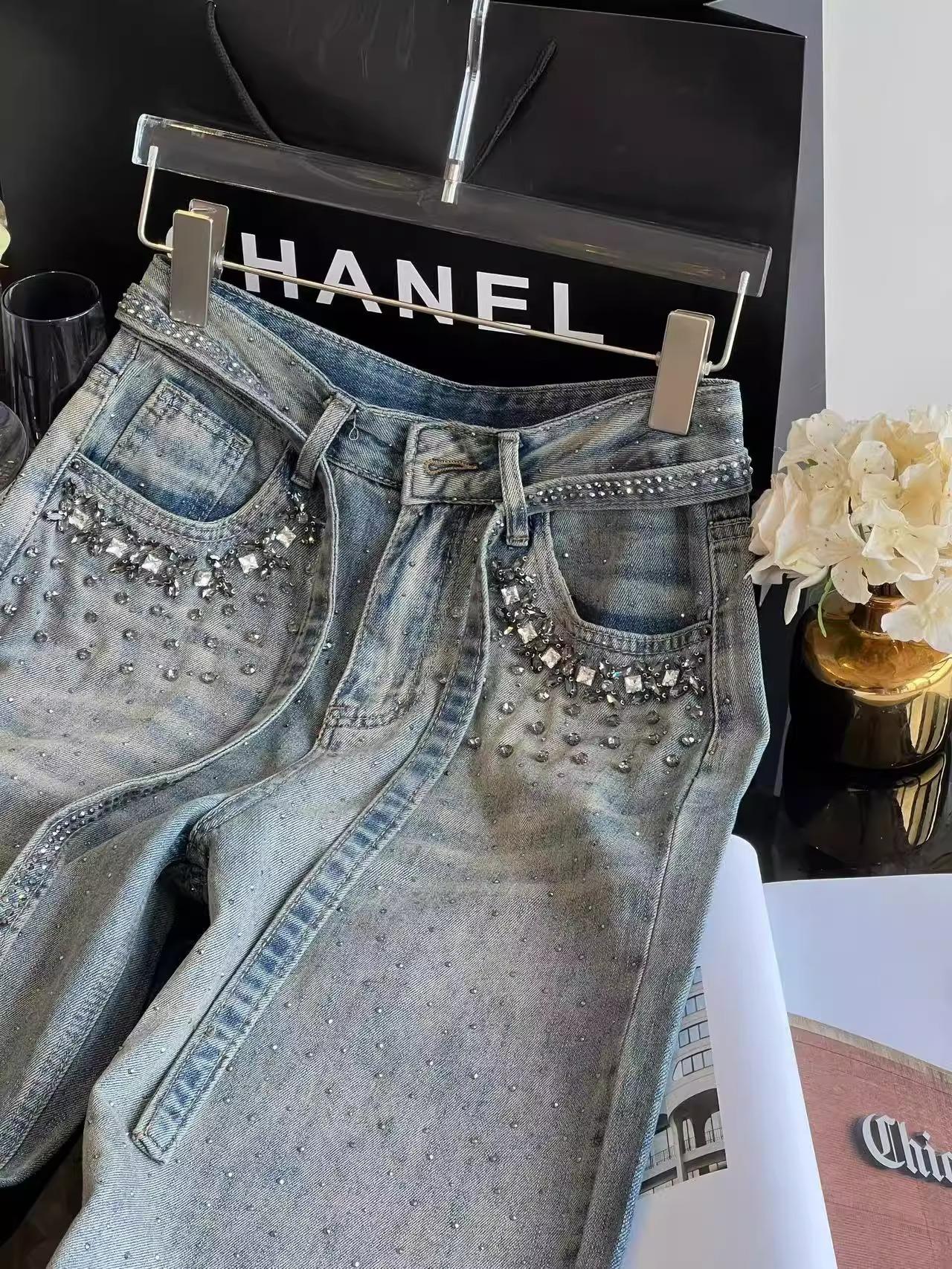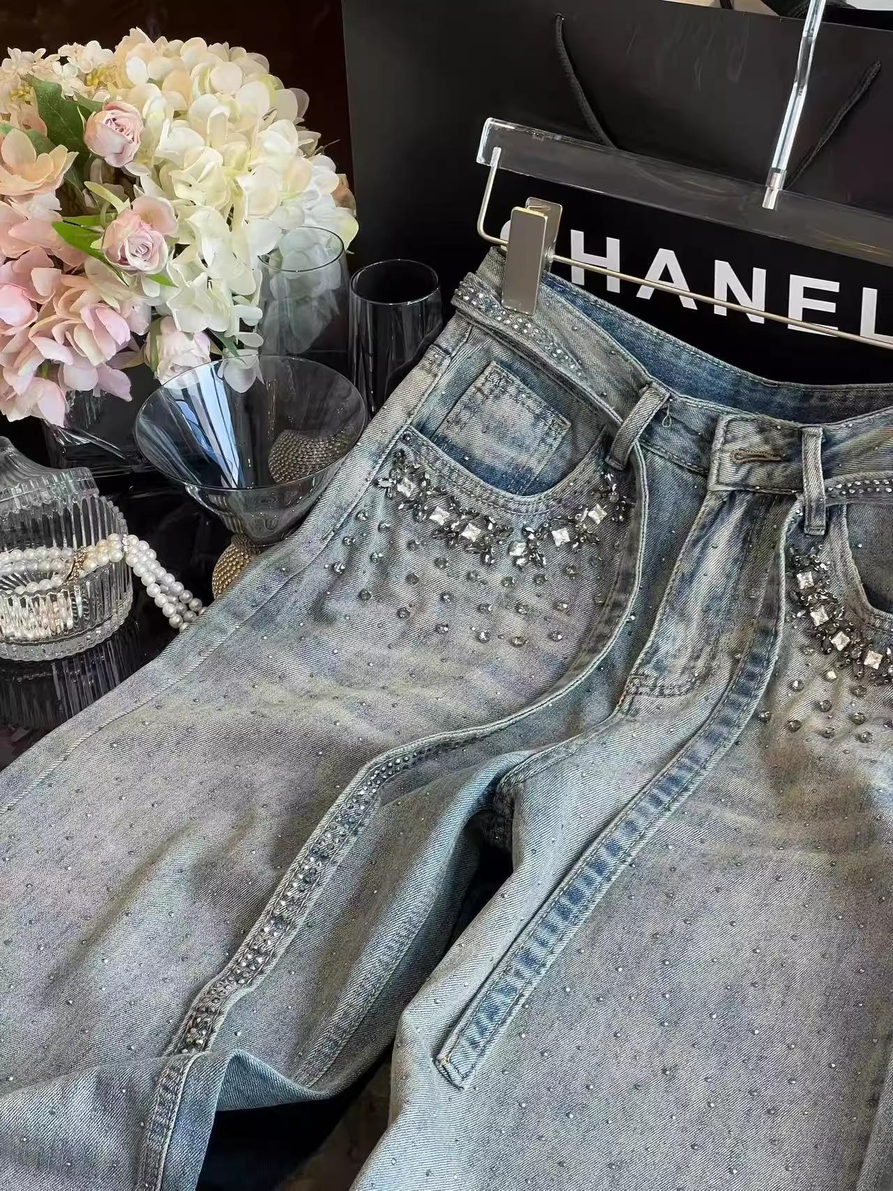Jeans de Mujer de Moda Vintage con Pedrería de Alta Resistencia Diseño Primavera/Verano 2025 Cintura Alta Adelgazantes Casuales Rectos