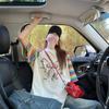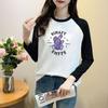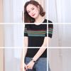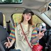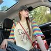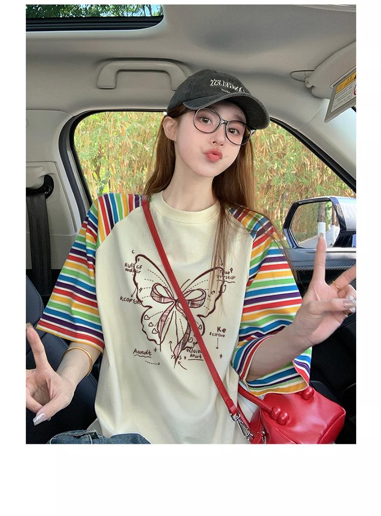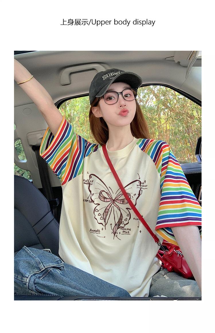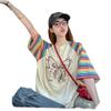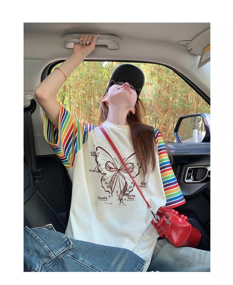 Camiseta de Manga Parcheada Suelta de Algodón Puro a Rayas Arcoíris para Mujer, Dulce Ins Lazo Graffiti Top Adelgazante Medio Trendy