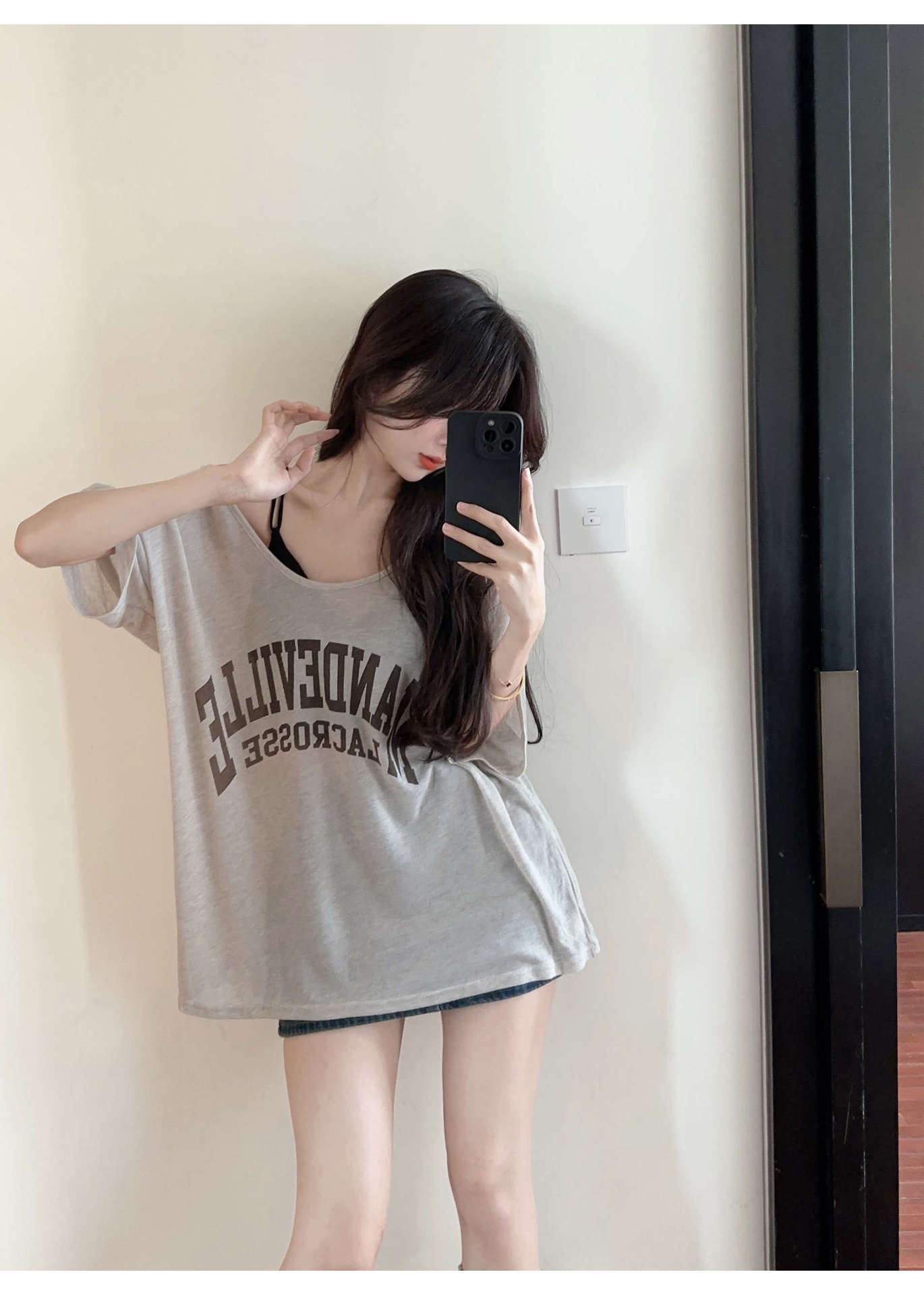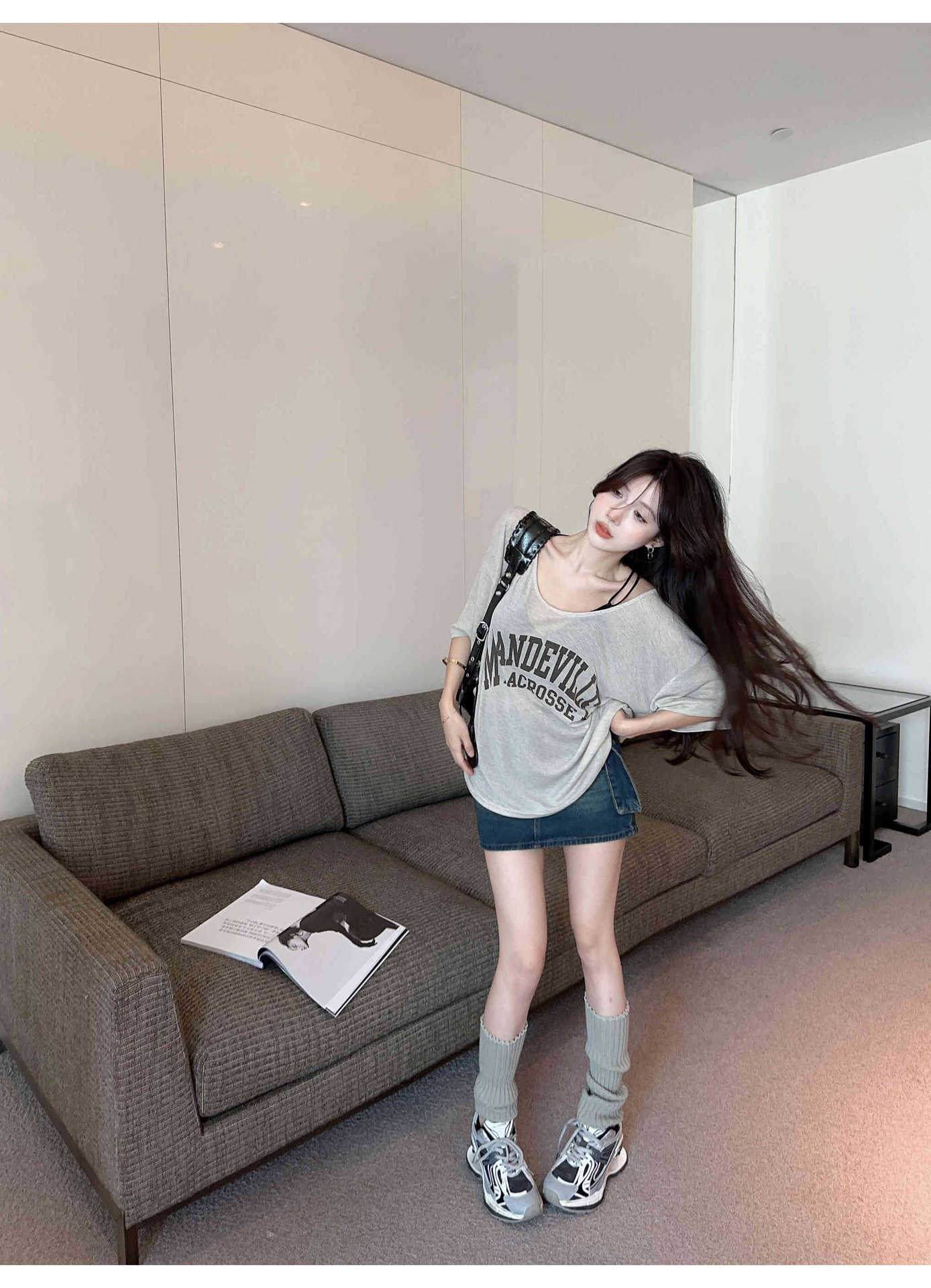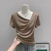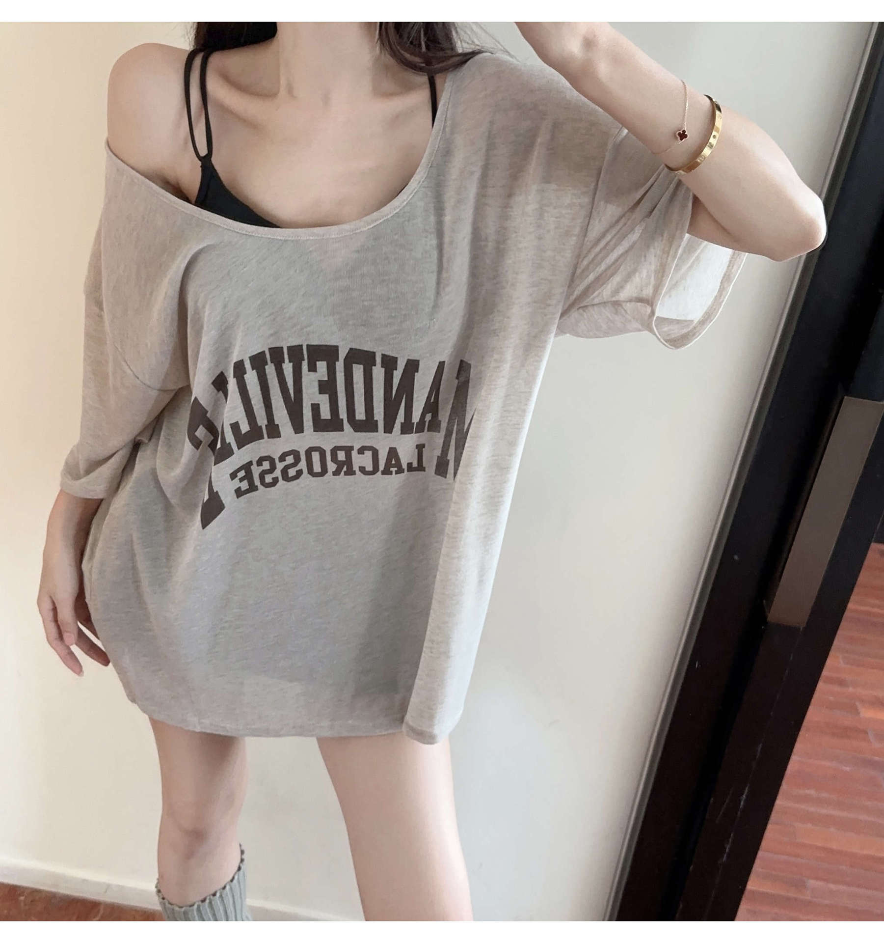 Playera de manga corta de dos formas con un hombro descubierto para mujer, estilo coreano, estampada, para cubrirse, verano, nicho, holgada, adelgazante, top de chica hot