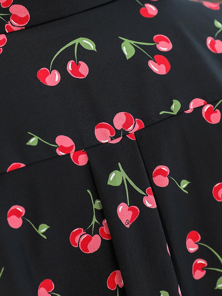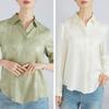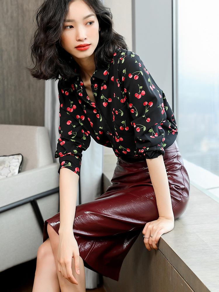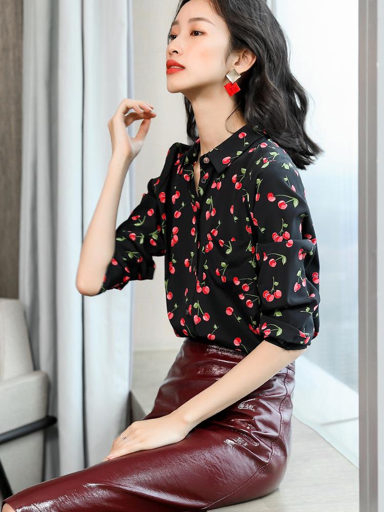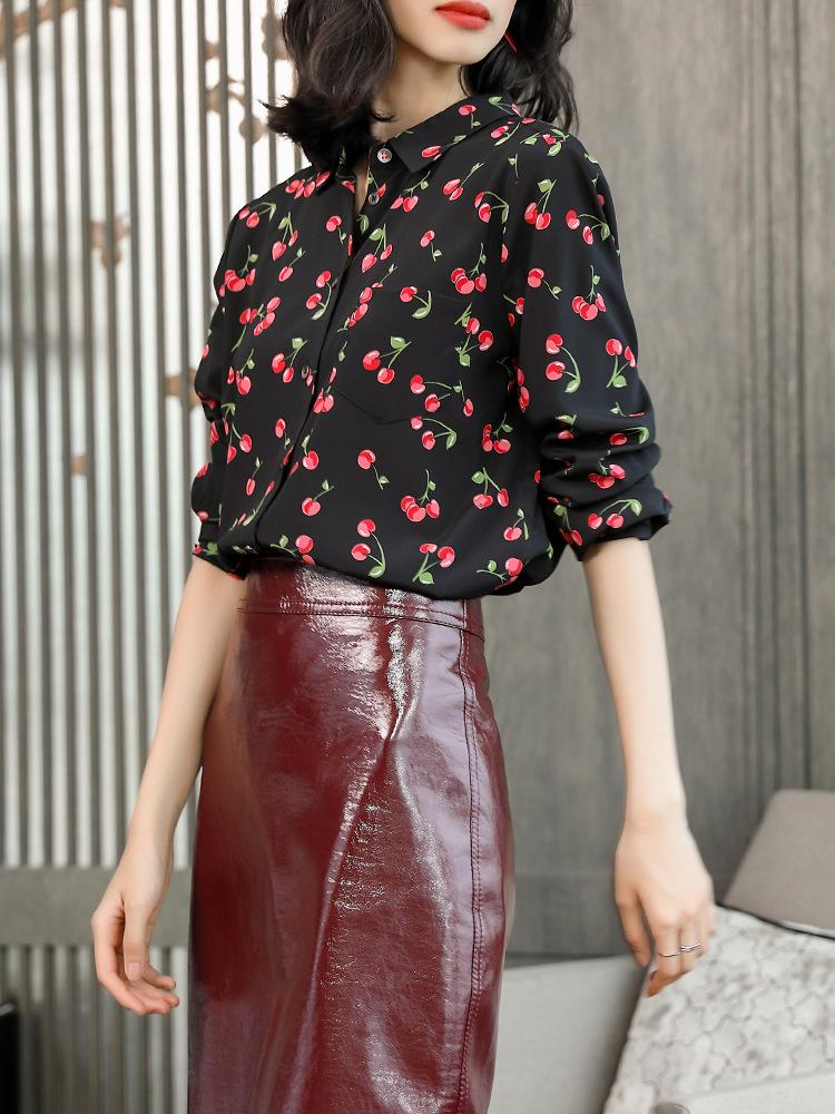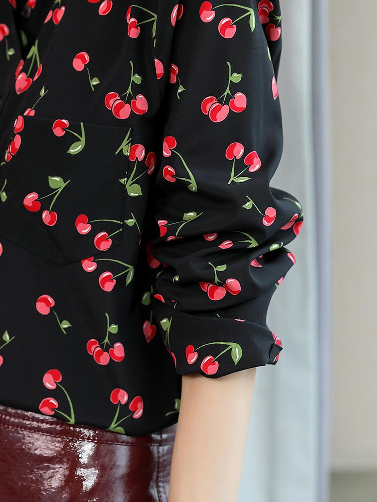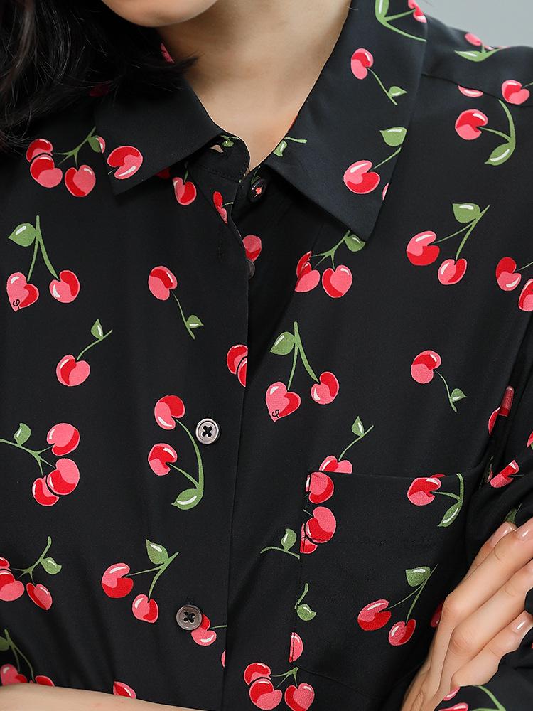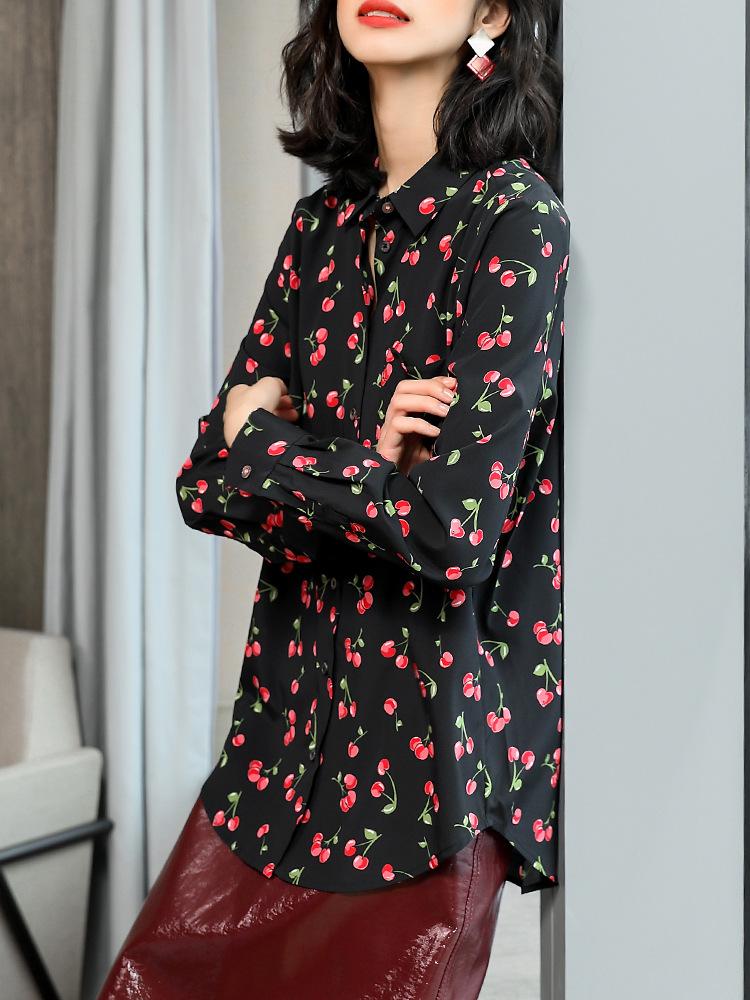Camisa de Seda con Estampado de Cerezas para Mujer 2025 Primavera Nueva Manga Larga Holgada Estilizada Moda Seda de Morera Elegante Camisa