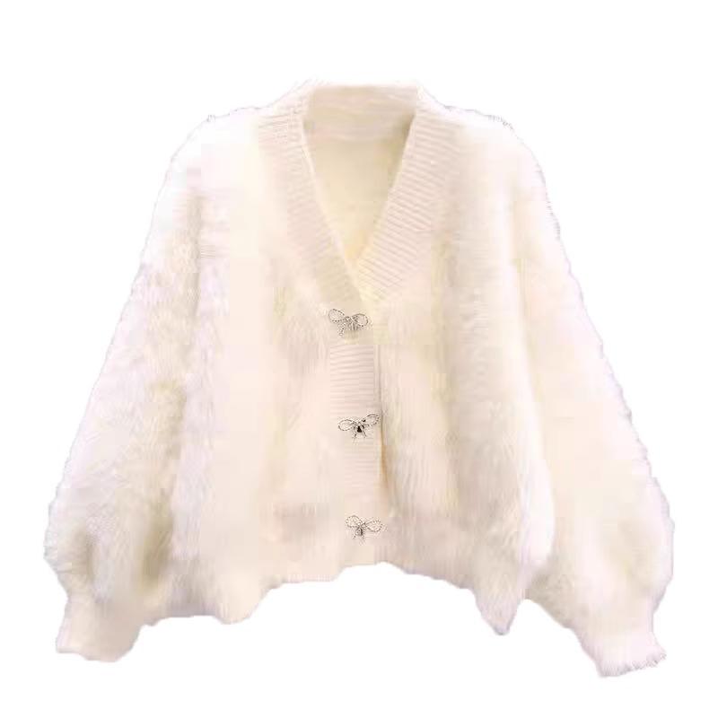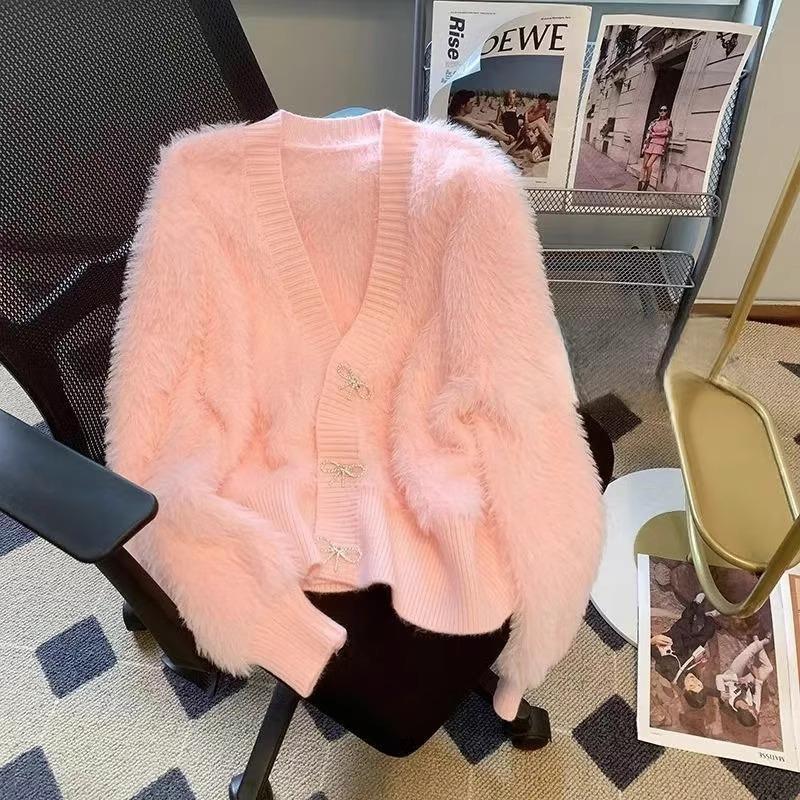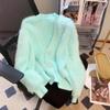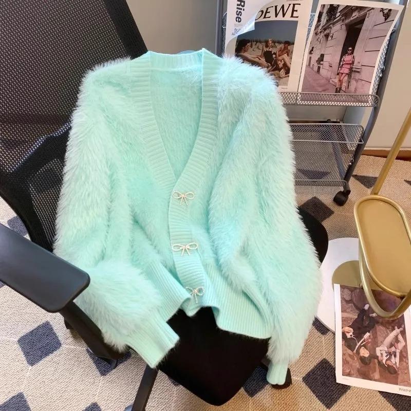Cárdigan Suéter Chaqueta Tejida de Terciopelo Visón Imitación de Color Sólido para Mujer Otoño e Invierno Nuevo Cuello en V Holgado a la Moda Manga Larga Top