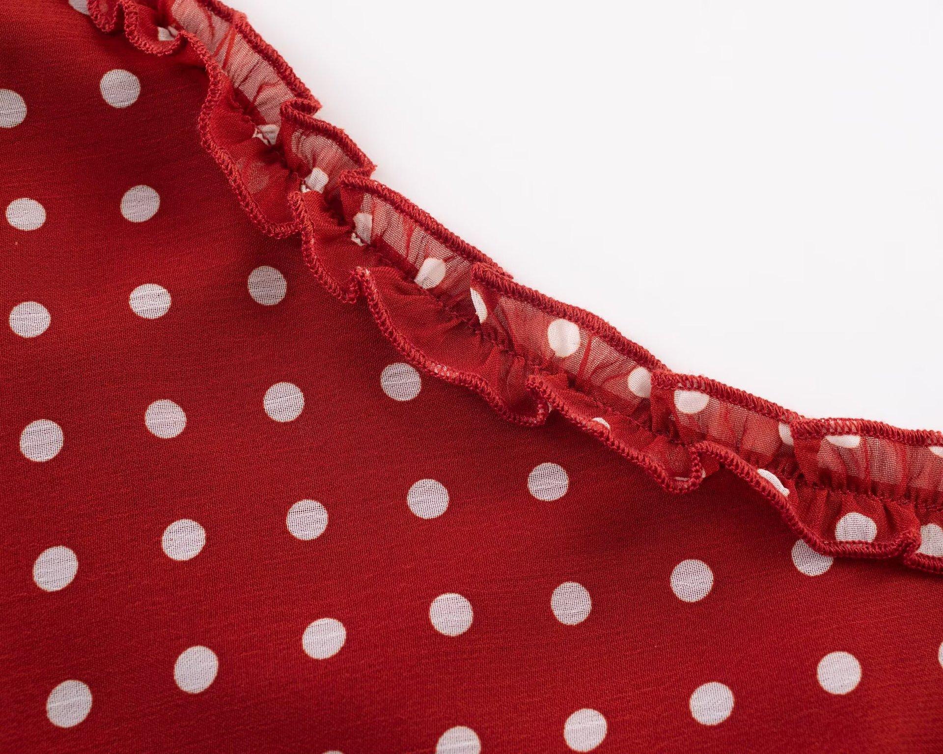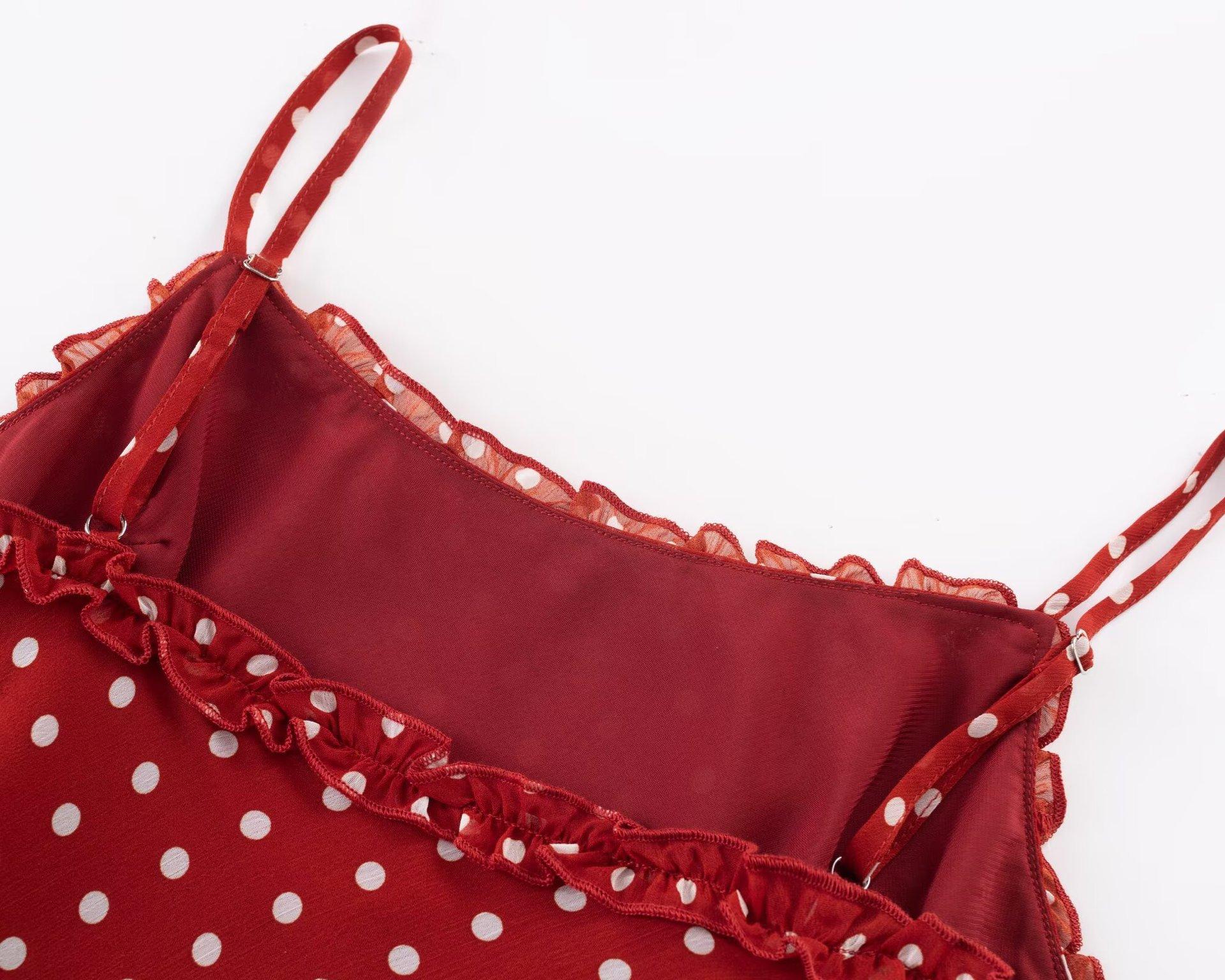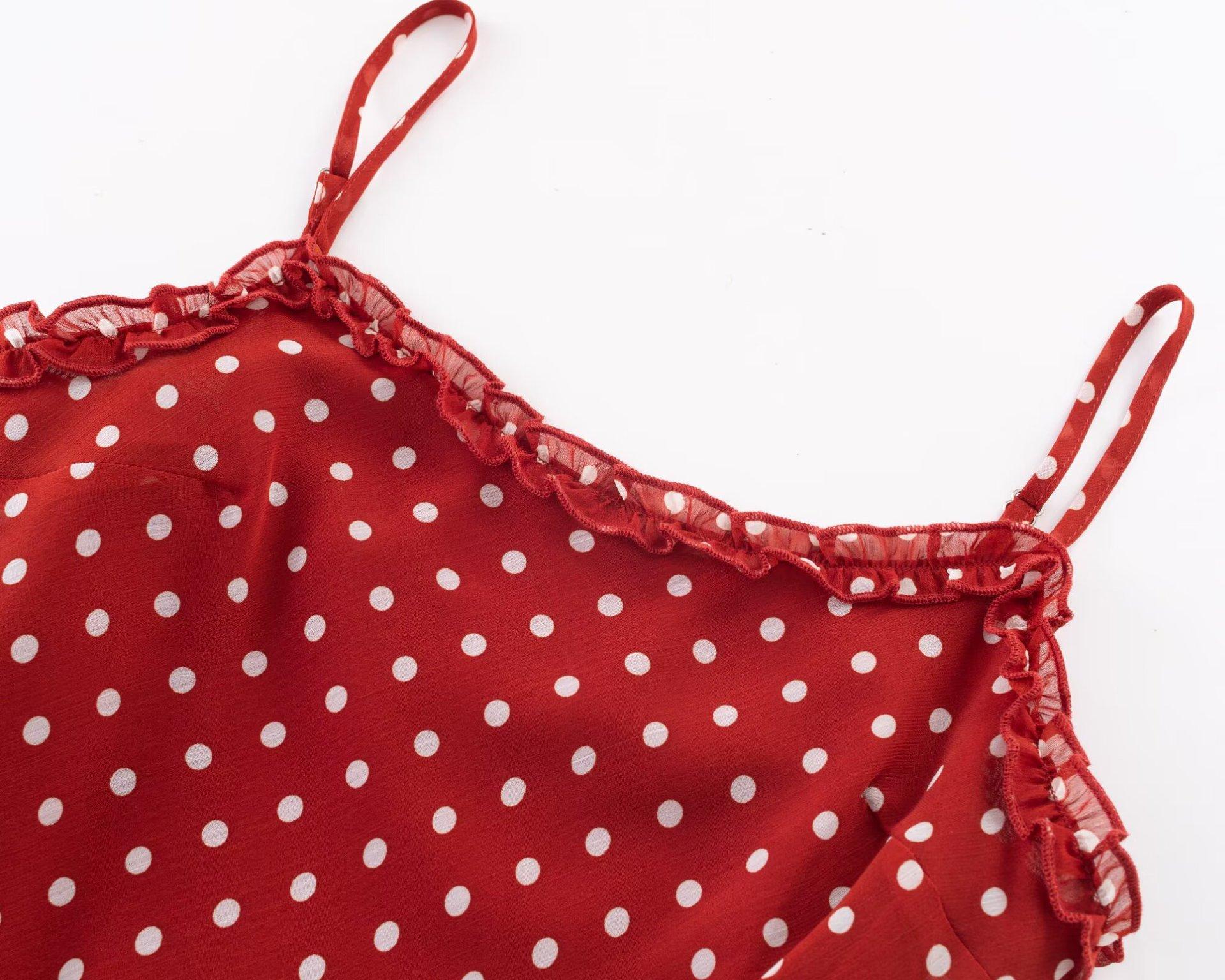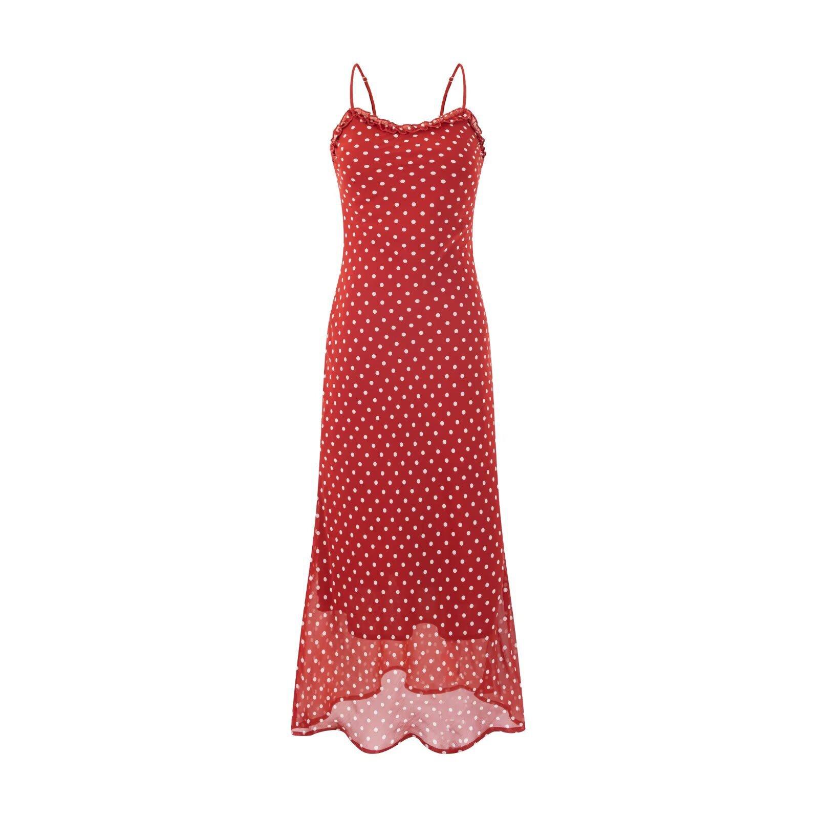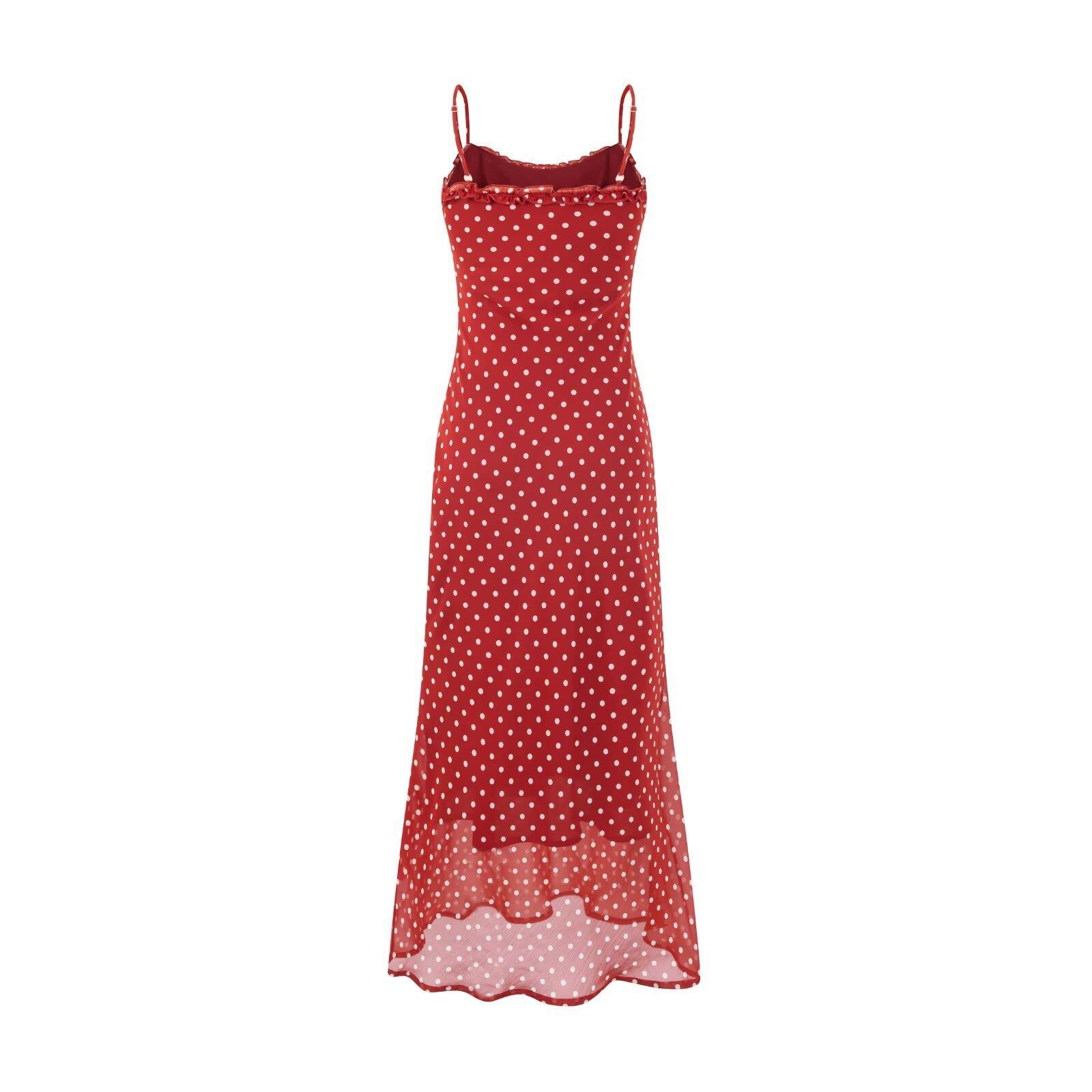 Vestido Largo de Verano para Mujer con Lunares de Onda Roja Retro Francés Sexy Encantador de Oreja de Madera Vacaciones Junto al Mar Europeo y Americano Vestido de Tirantes