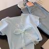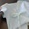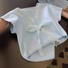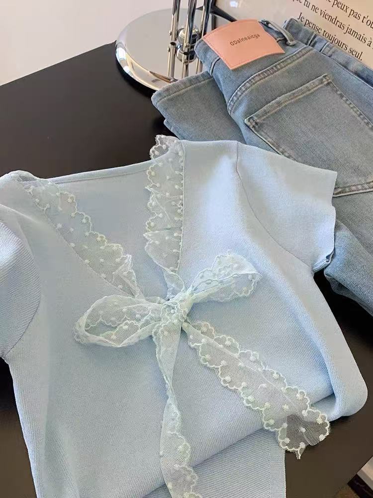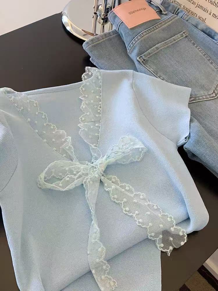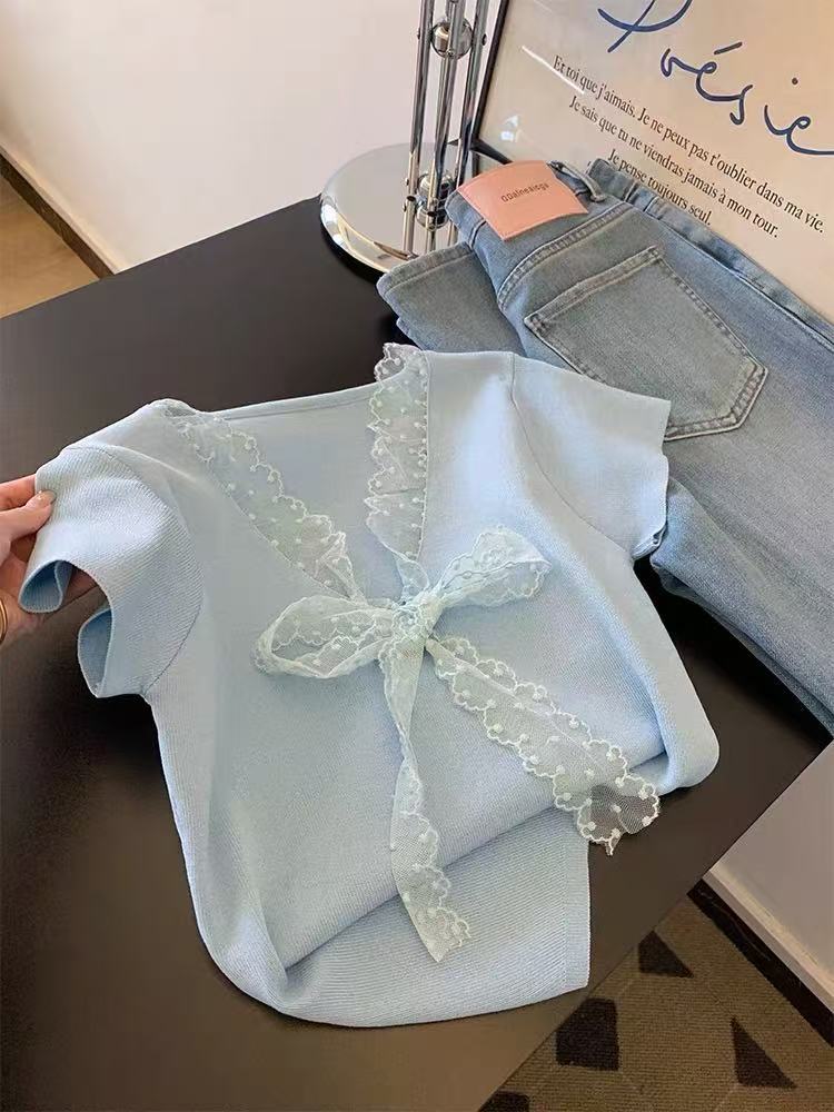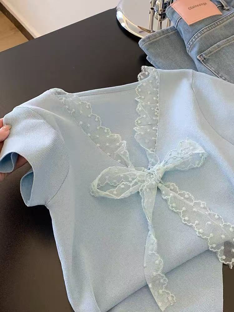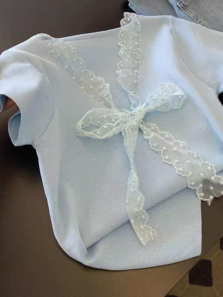 Camiseta de Punto de Manga Corta con Encaje y Lazo con Cuello en V para Mujer, Top de Diseño Recto de Hombro Corto Ins