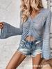 Europea y Americana Transfronteriza Sexy para Mujer Manga Larga Tejida Cut Out Blusa Tejida Cuello V Cordón Protección Solar Corta Ropa de Playa