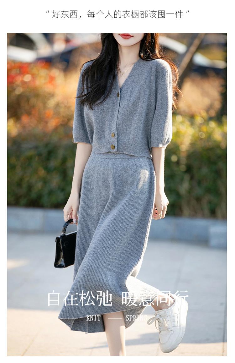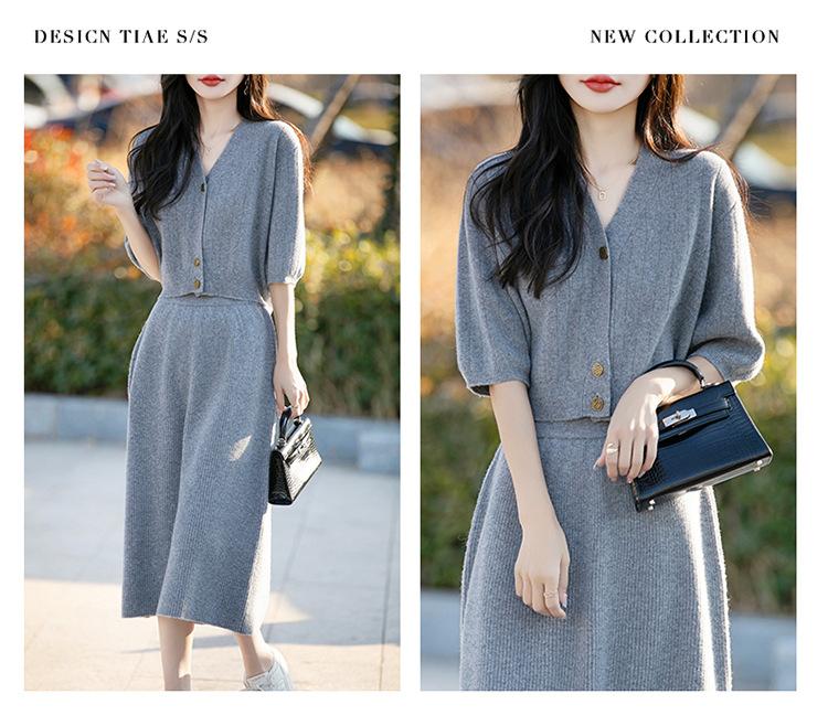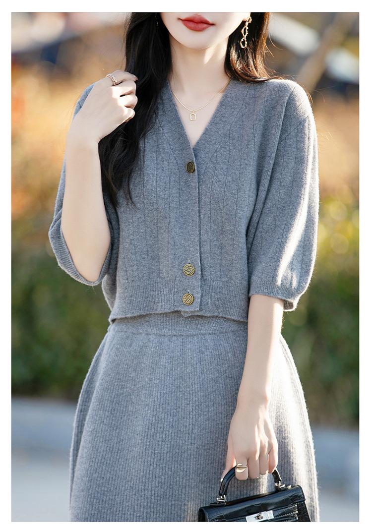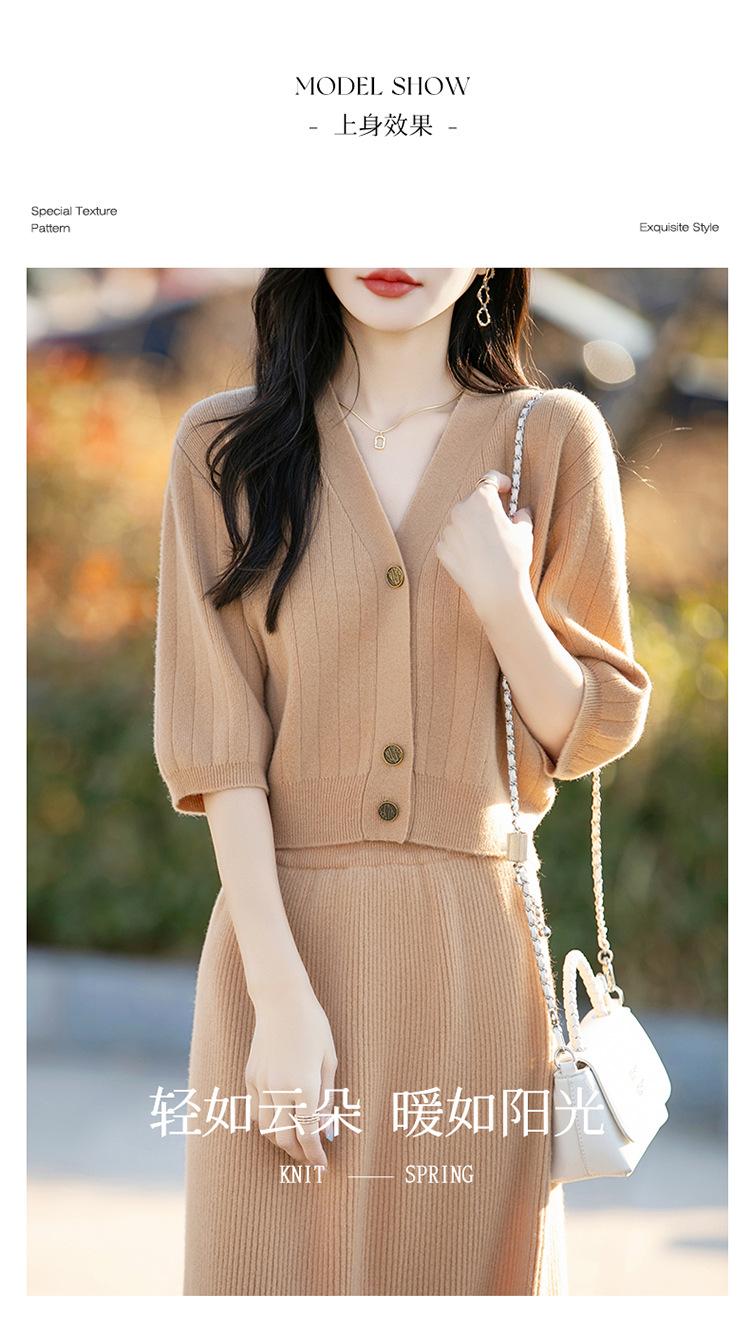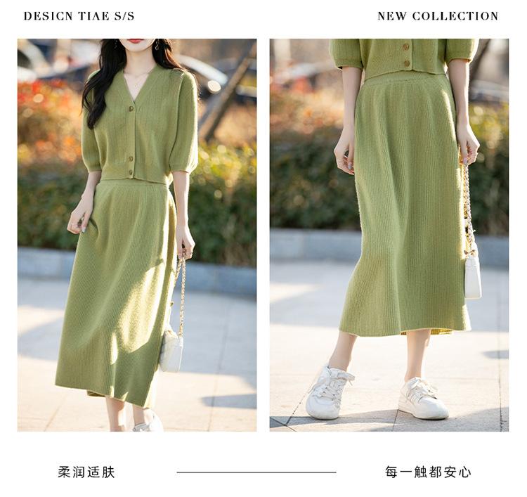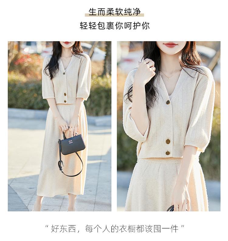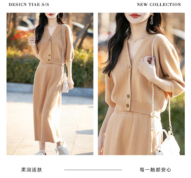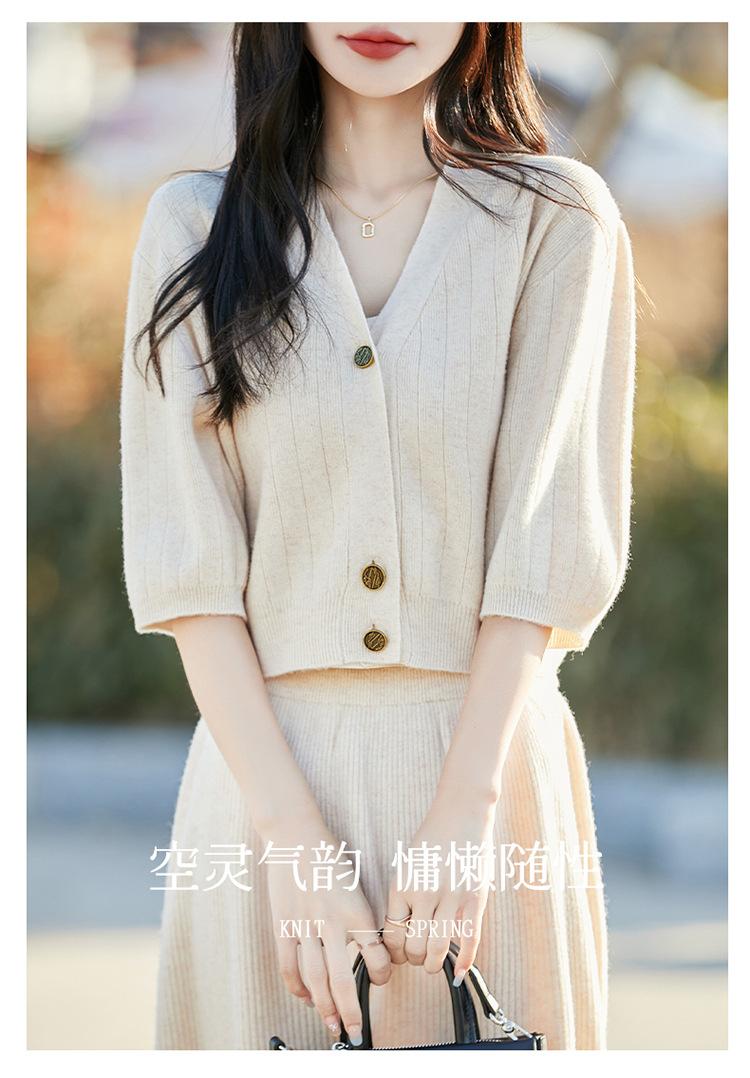 Cárdigan de Punto de Lana Pura con Cuello en V de Primavera 2025, Manga Media, Color Sólido, Falda de Cintura Alta, Conjunto de Dos Piezas para Mujer
