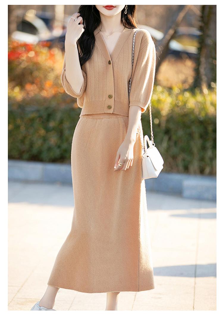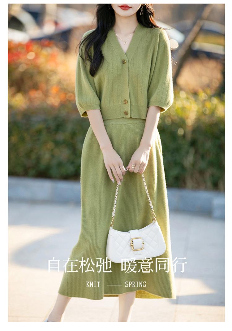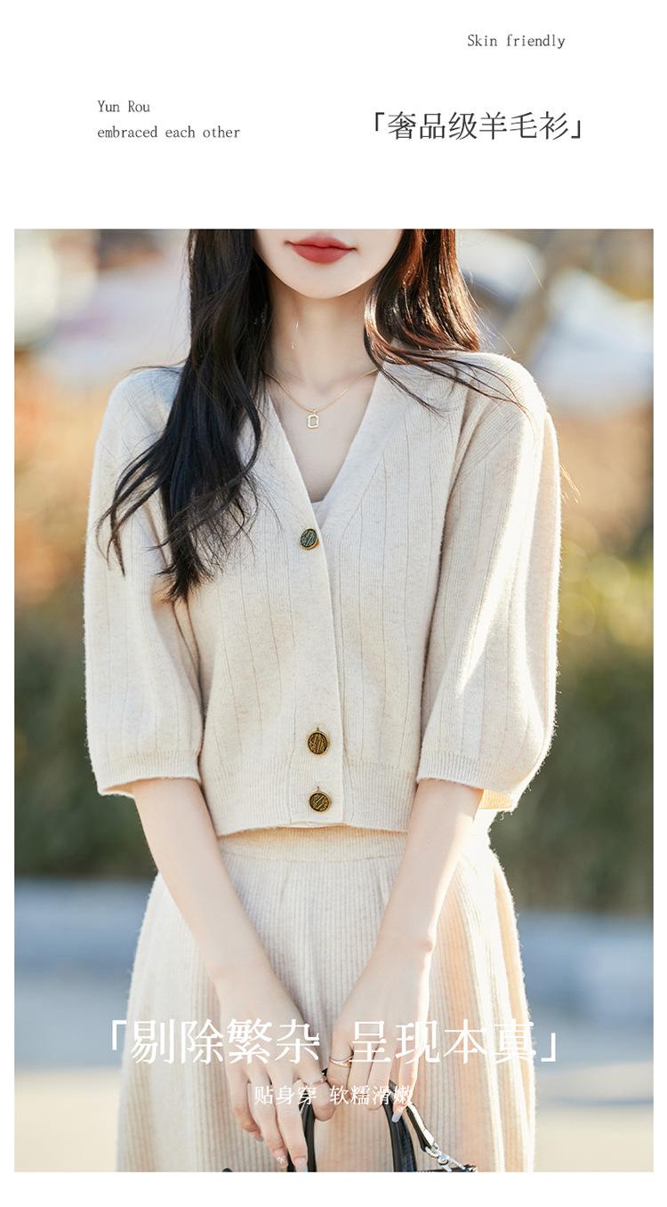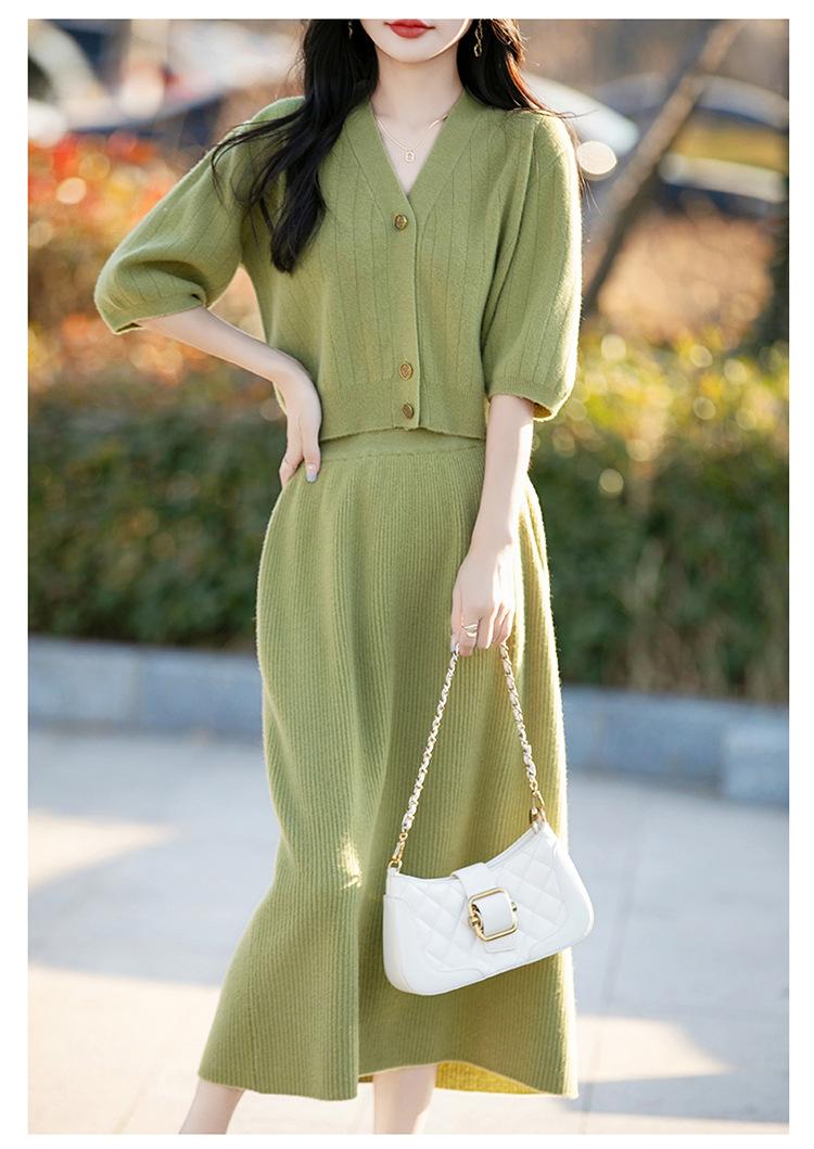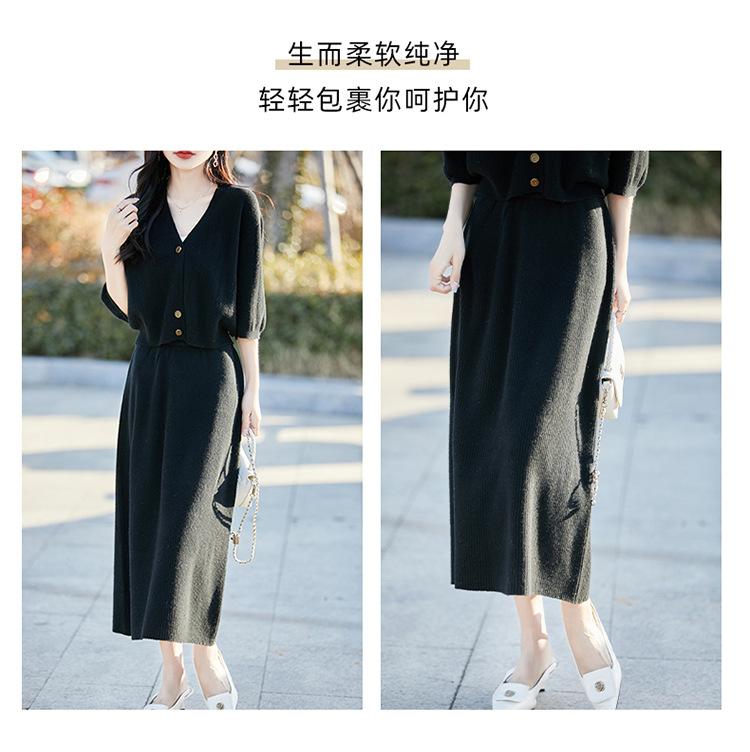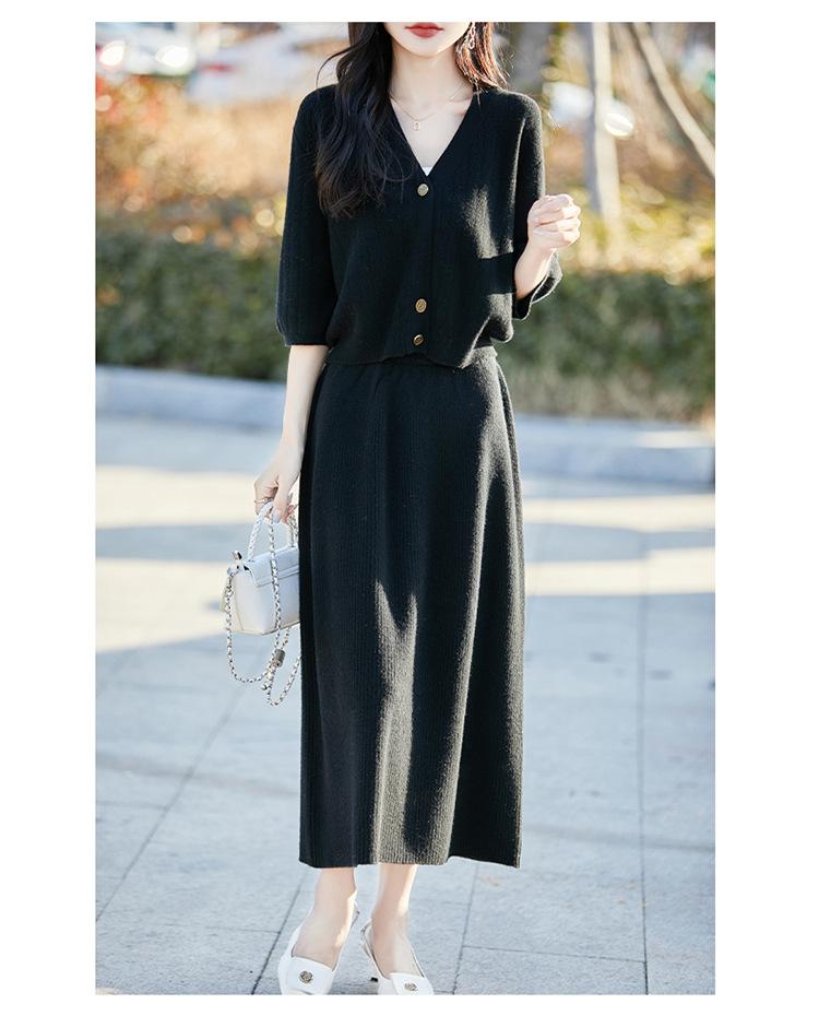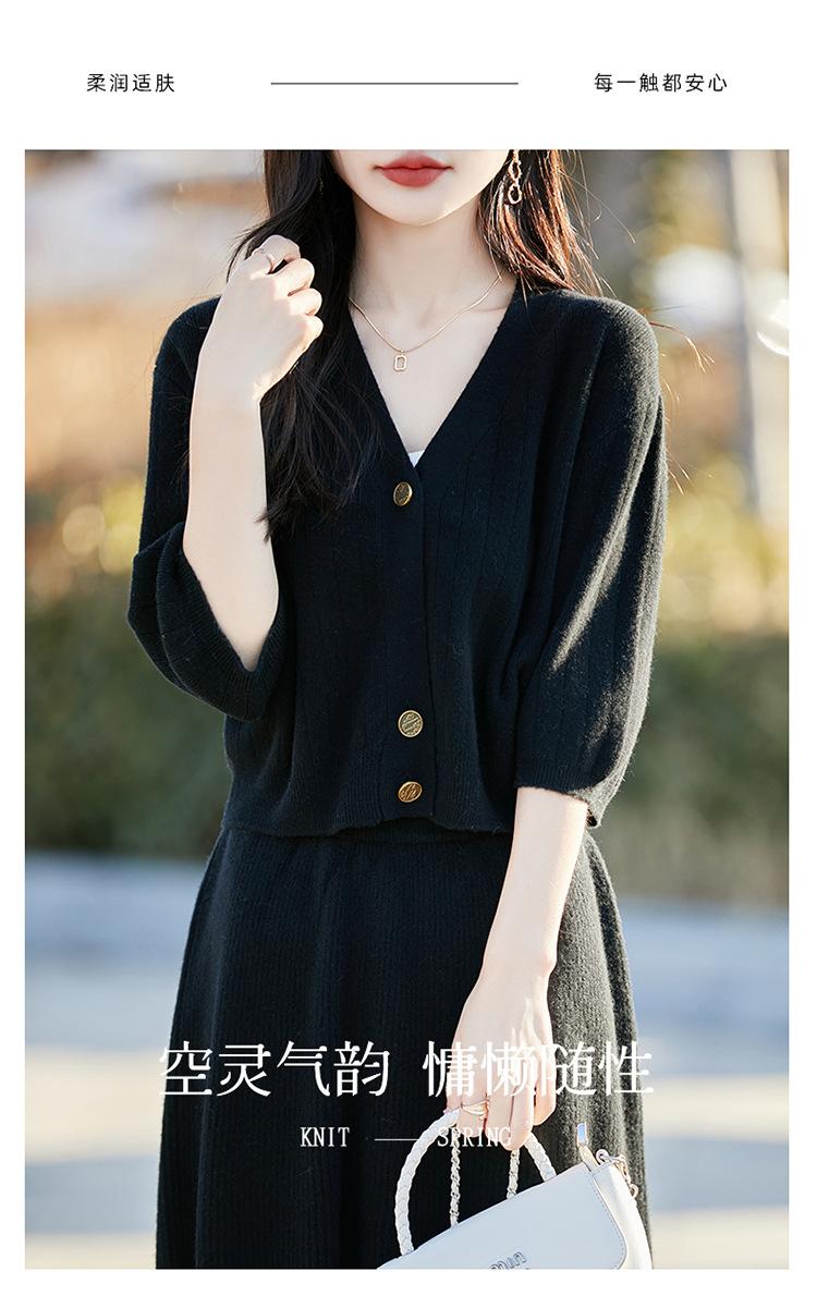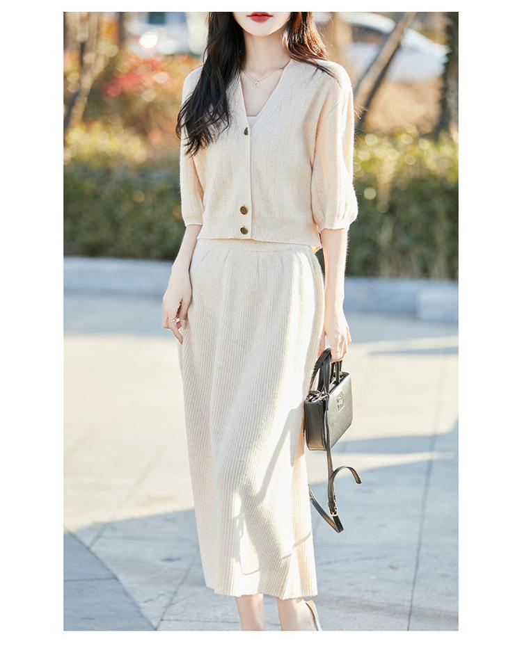 Cárdigan de Punto de Lana Pura con Cuello en V de Primavera 2025, Manga Media, Color Sólido, Falda de Cintura Alta, Conjunto de Dos Piezas para Mujer
