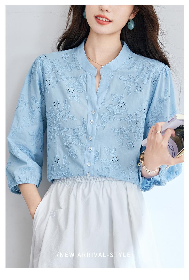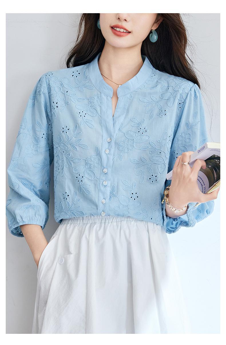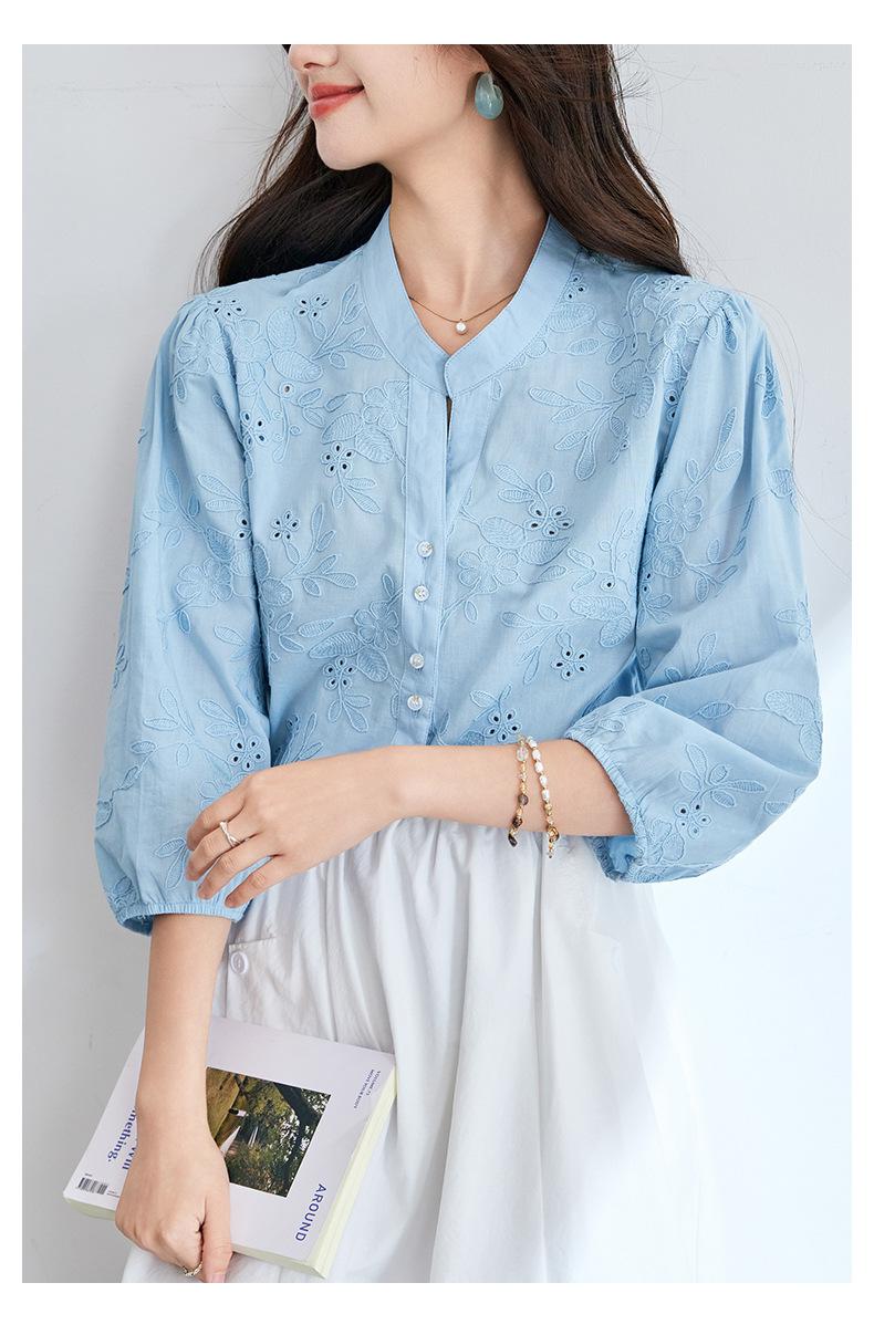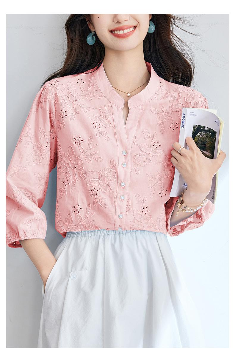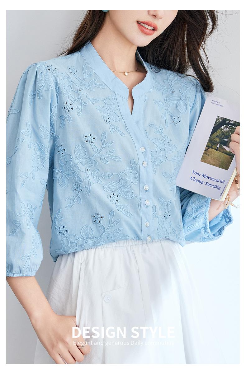 [Personalizado] Camisa de Manga Tres Cuartos con Cuello en V Bordada con Recortes para Mujer Primavera y Verano Nueva Algodón Puro Elegante Sencilla Camisa Top