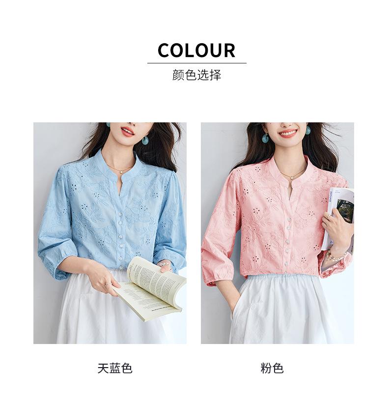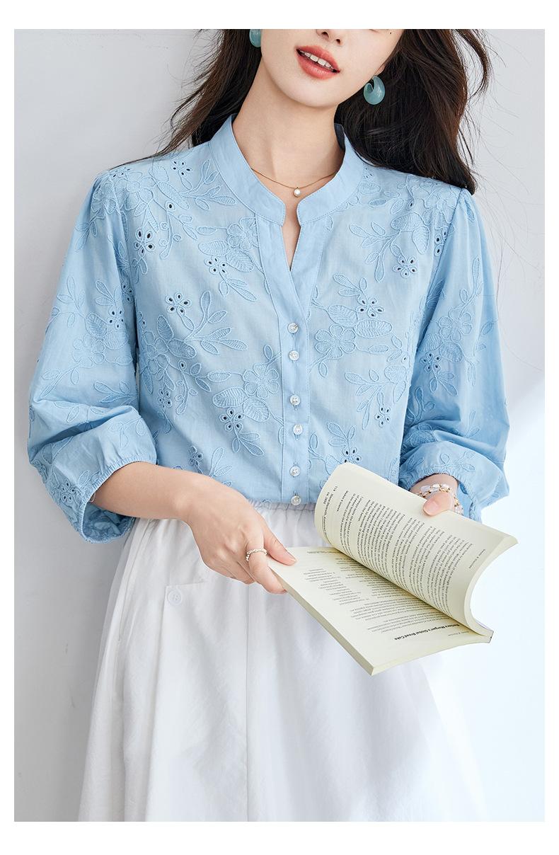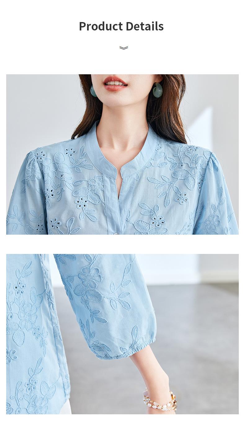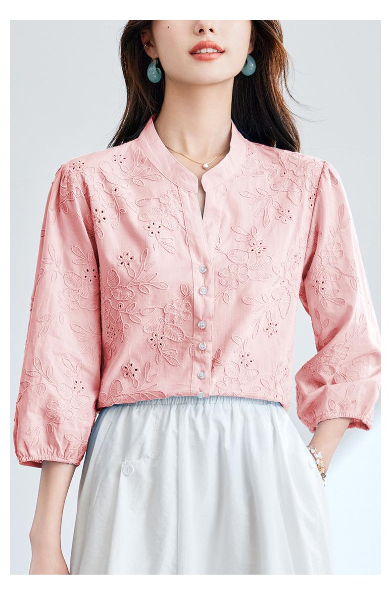 [Personalizado] Camisa de Manga Tres Cuartos con Cuello en V Bordada con Recortes para Mujer Primavera y Verano Nueva Algodón Puro Elegante Sencilla Camisa Top