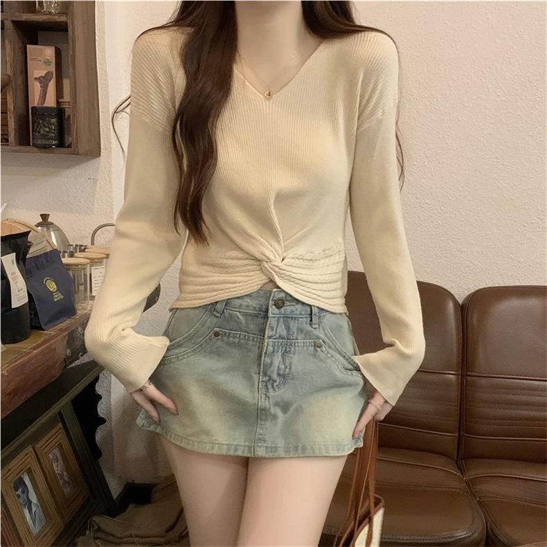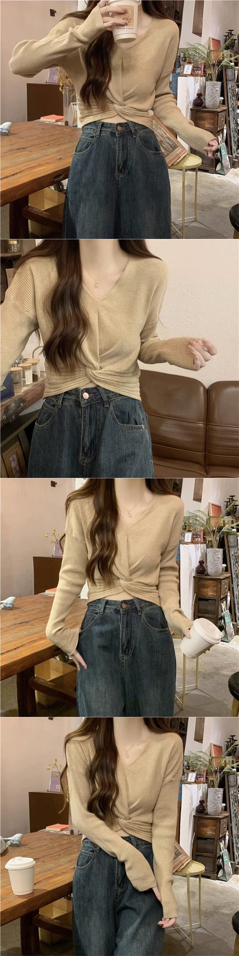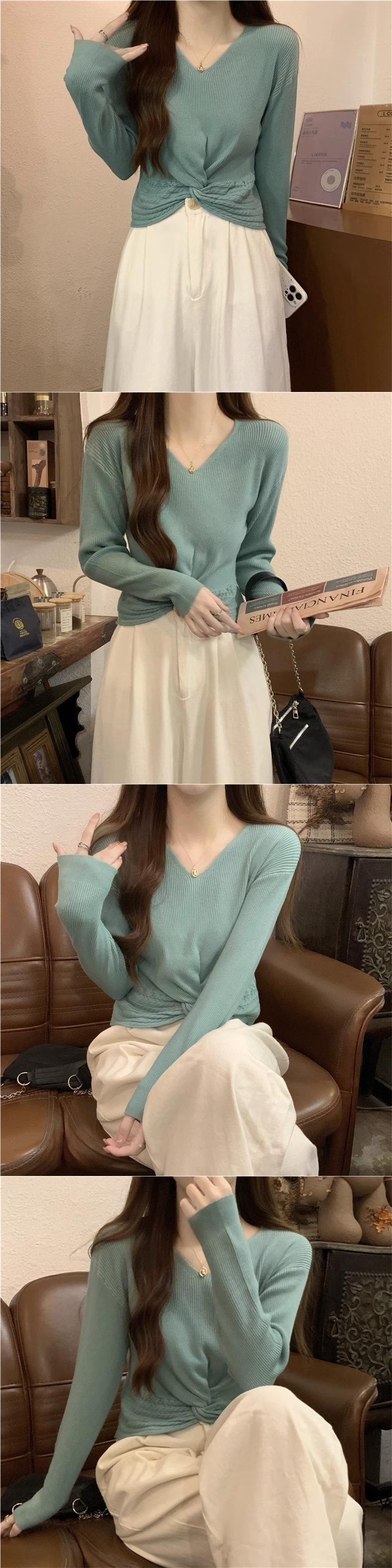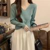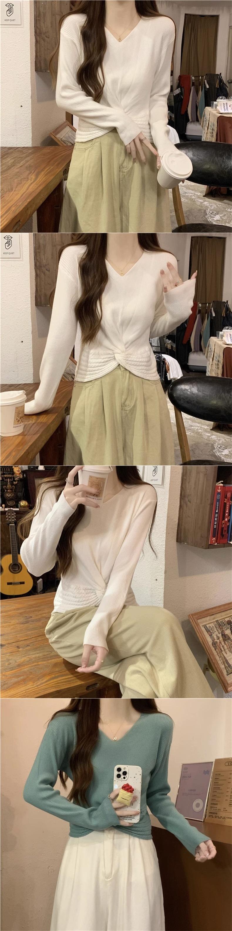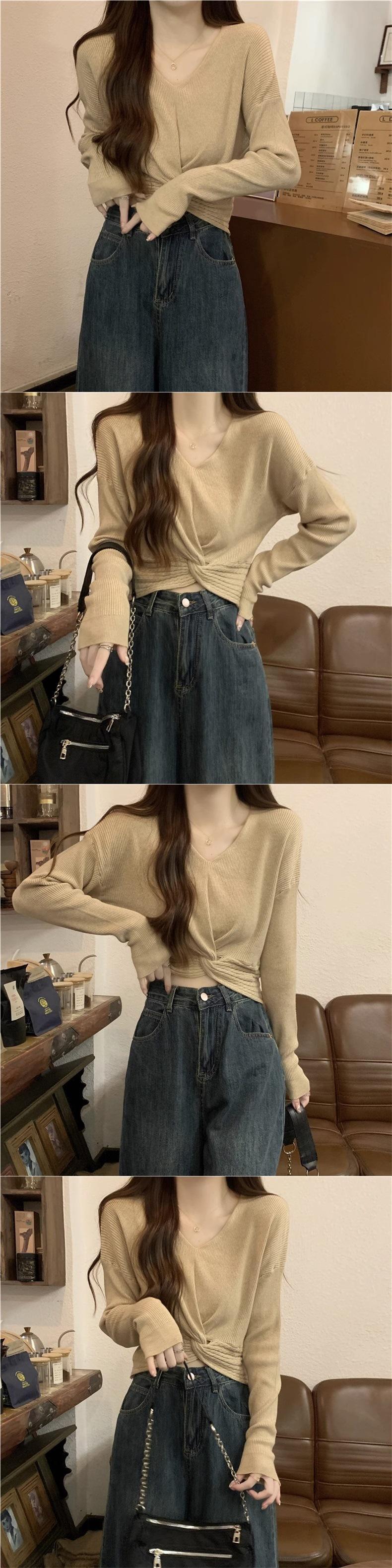 Nuevo top básico de punto de manga larga con cuello en V para otoño e invierno, ajustado, corto, petite, moderno, elegante, suéter para mujer