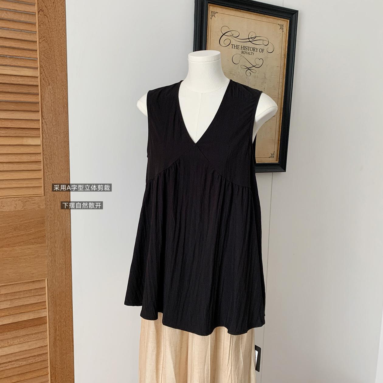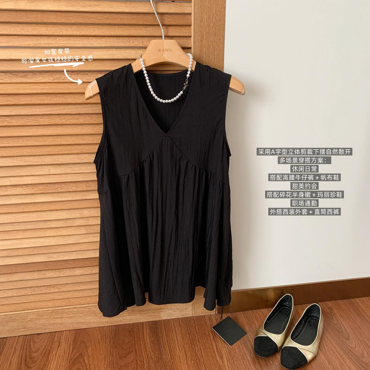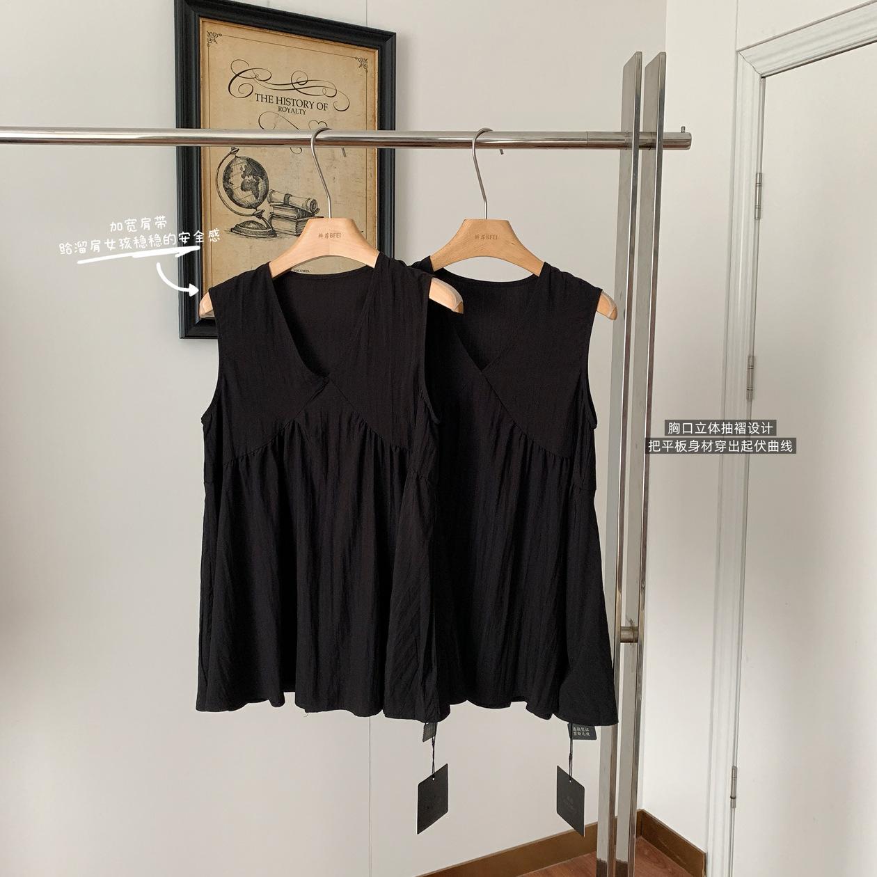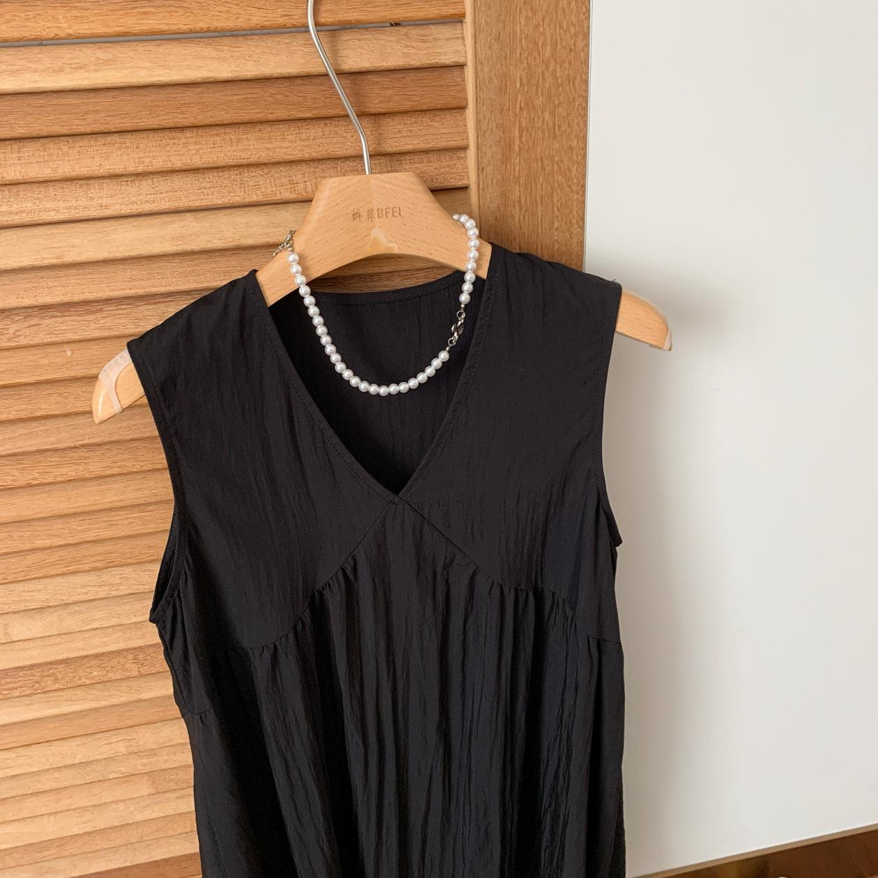 Chaleco Camiseta Negra de Cuello en V Sin Mangas para Mujer Verano Casual Suelto Entallado Plisado Babydoll