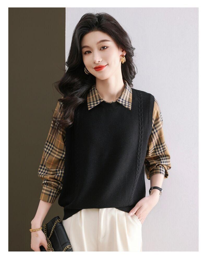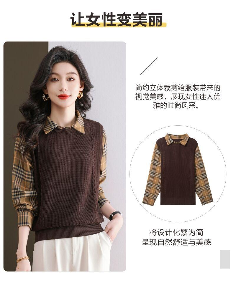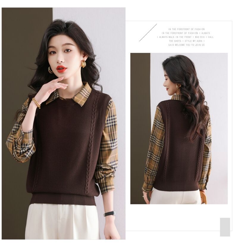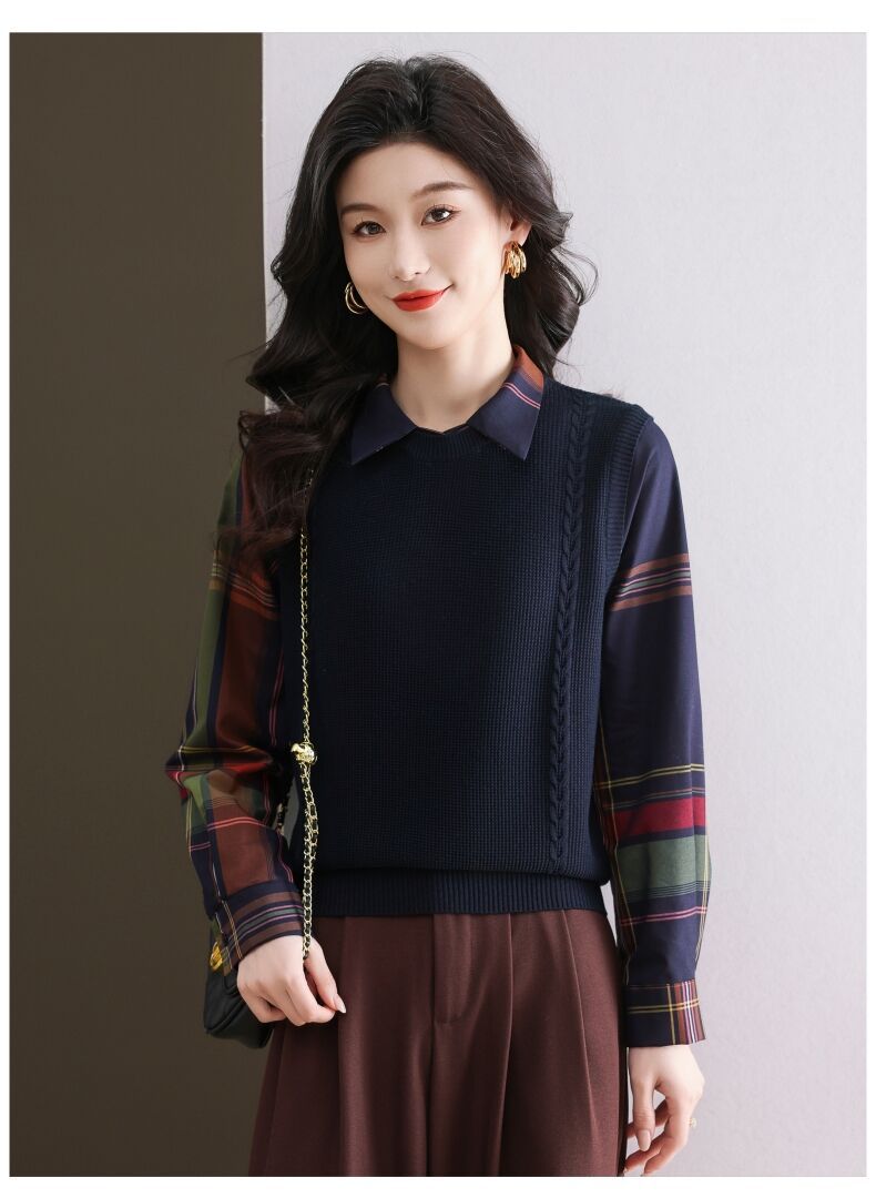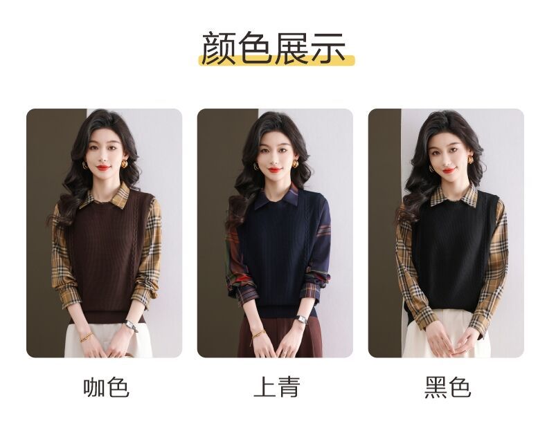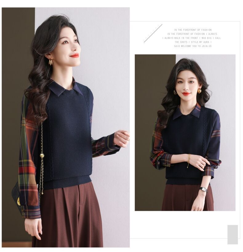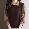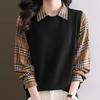 Suéter de Punto Falso de Dos Piezas para Mujer 2025 Otoño Nuevo Top de Solapa Diseño Nicho Bloque de Color a Cuadros Ropa Exterior Suéter