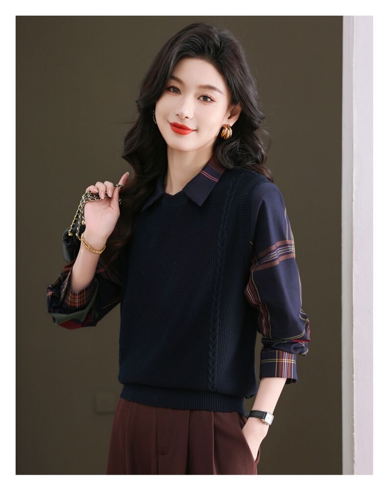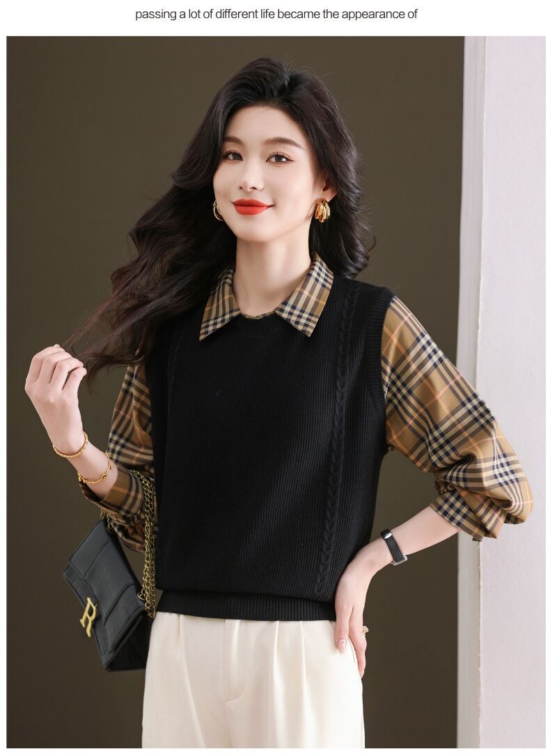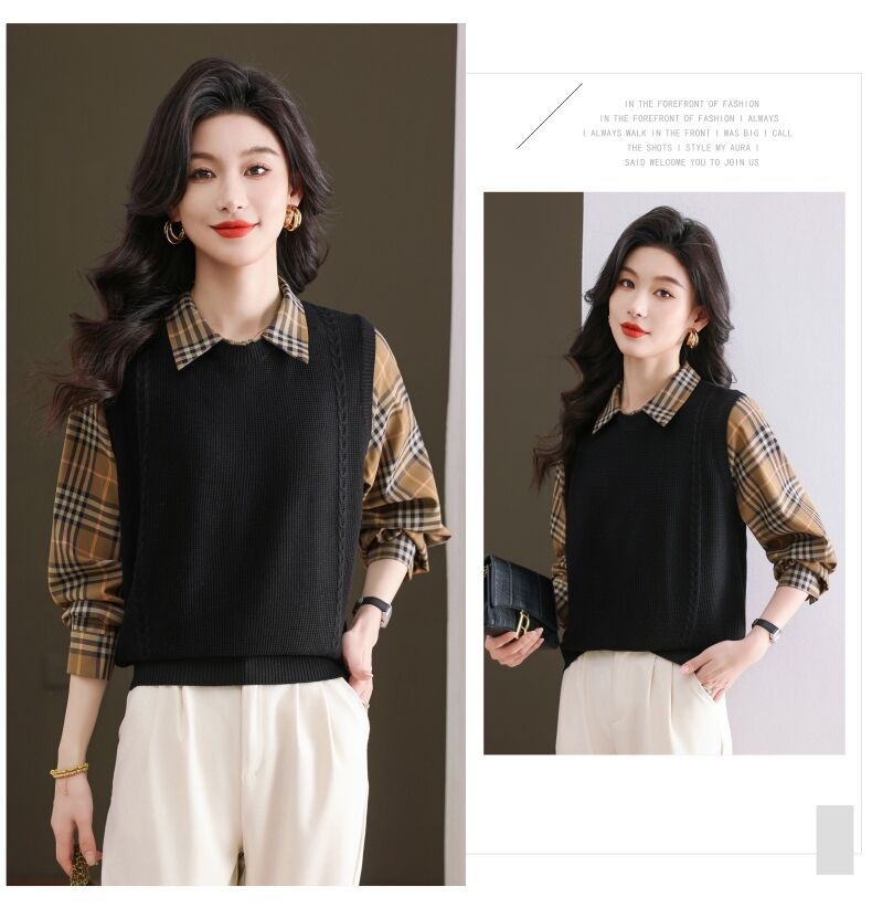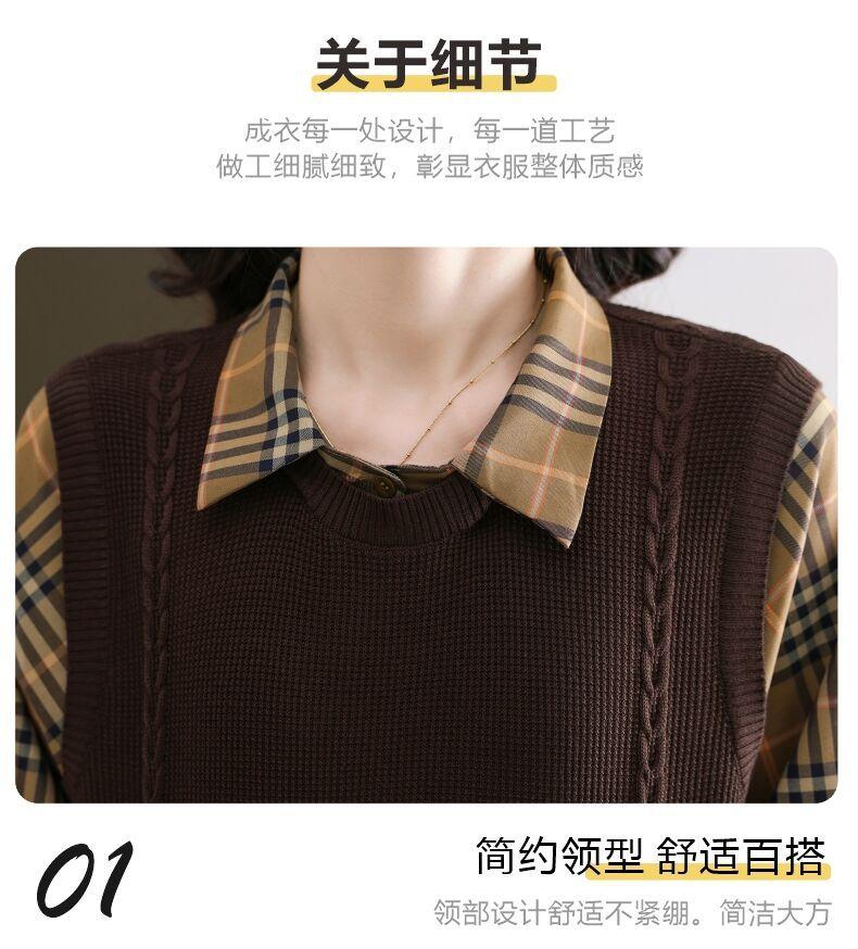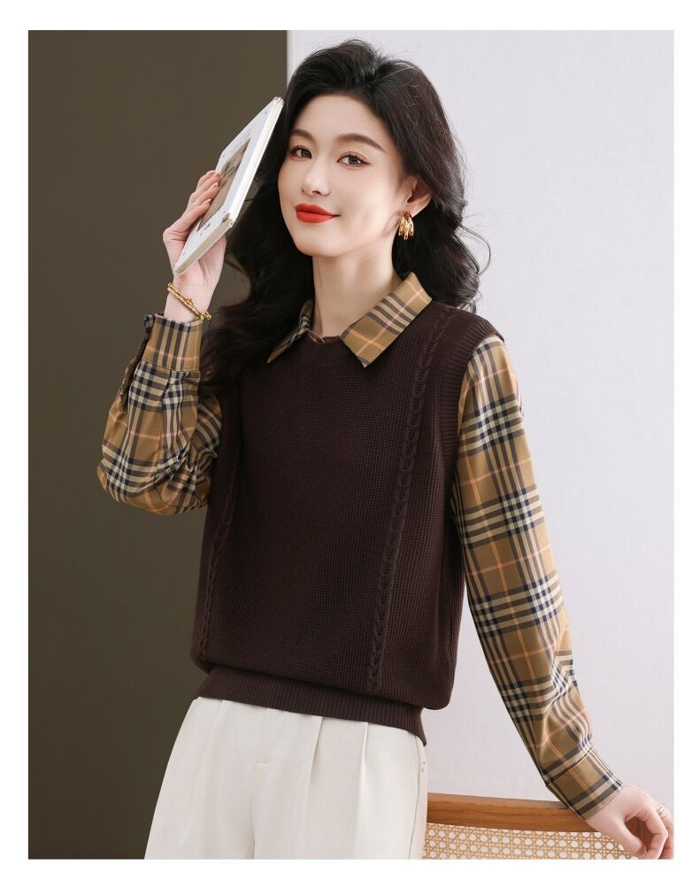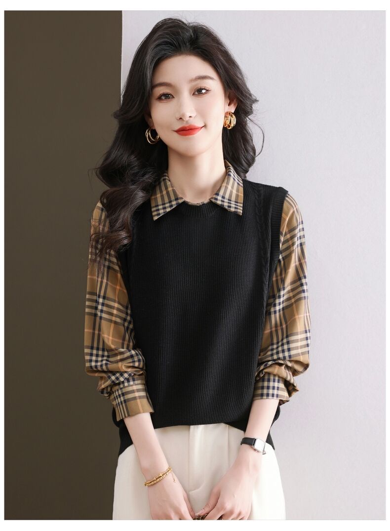 Suéter de Punto Falso de Dos Piezas para Mujer 2025 Otoño Nuevo Top de Solapa Diseño Nicho Bloque de Color a Cuadros Ropa Exterior Suéter