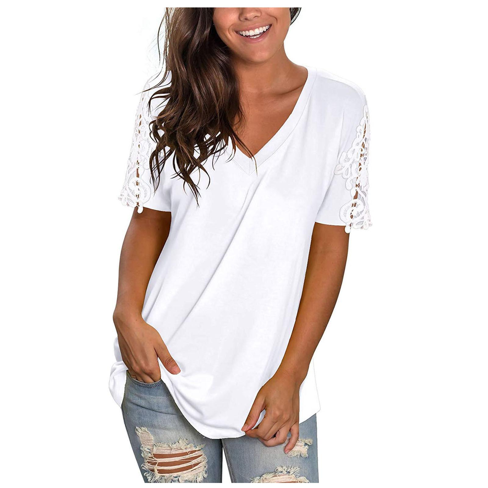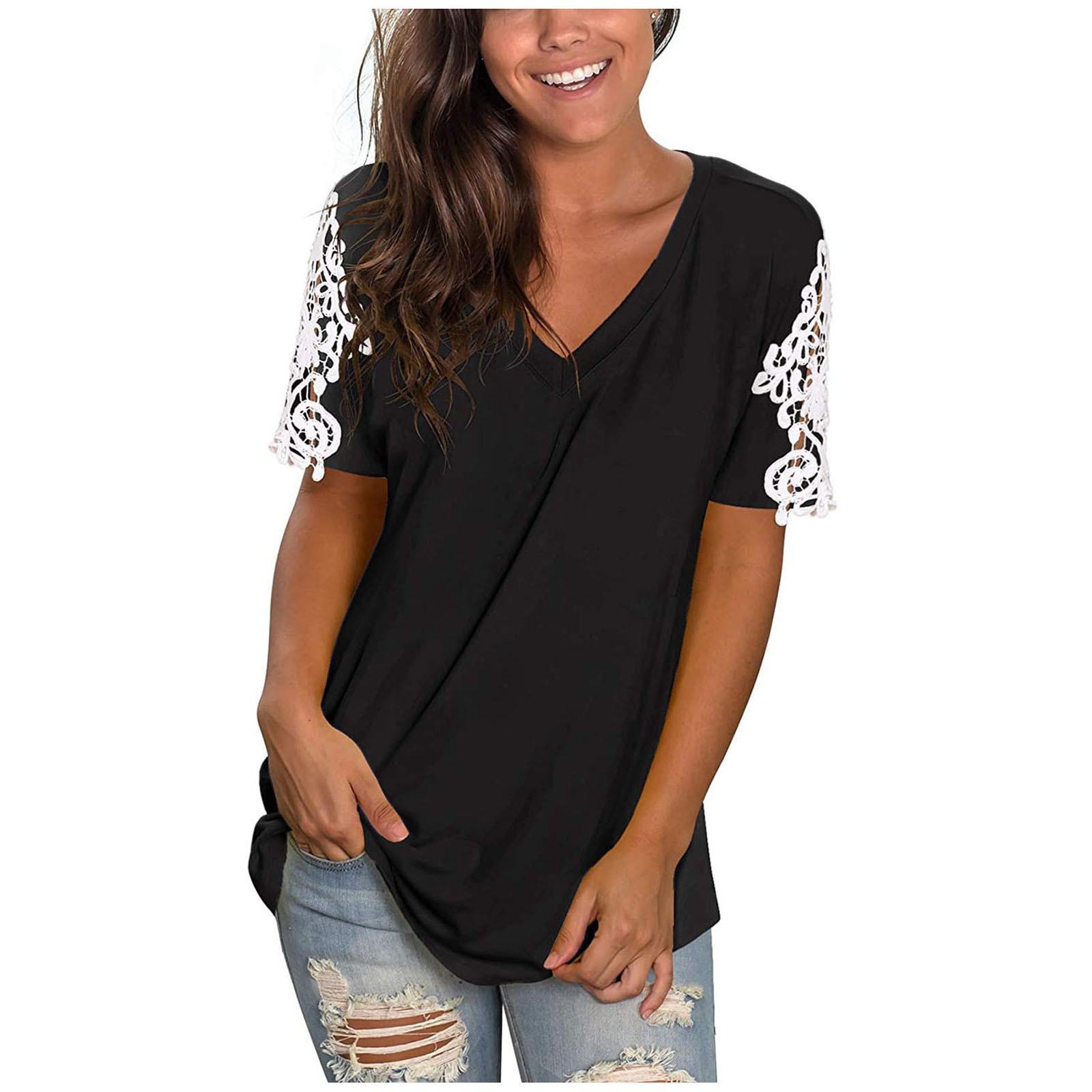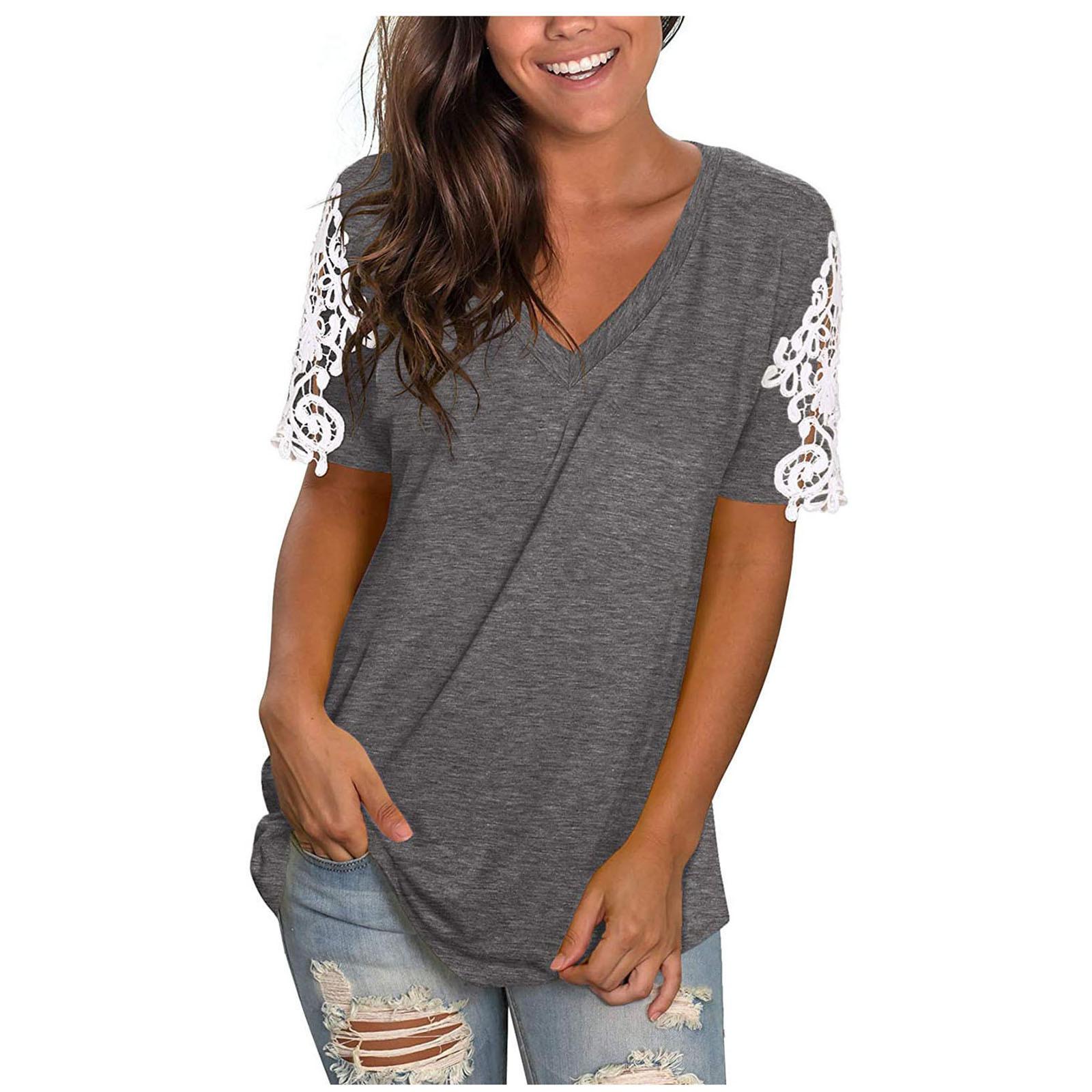 2025 Amazon Nueva Camiseta de Encaje de Manga Corta con Cuello en V para Mujer Top Holgado Casual para Mujer con Diseño de Parche