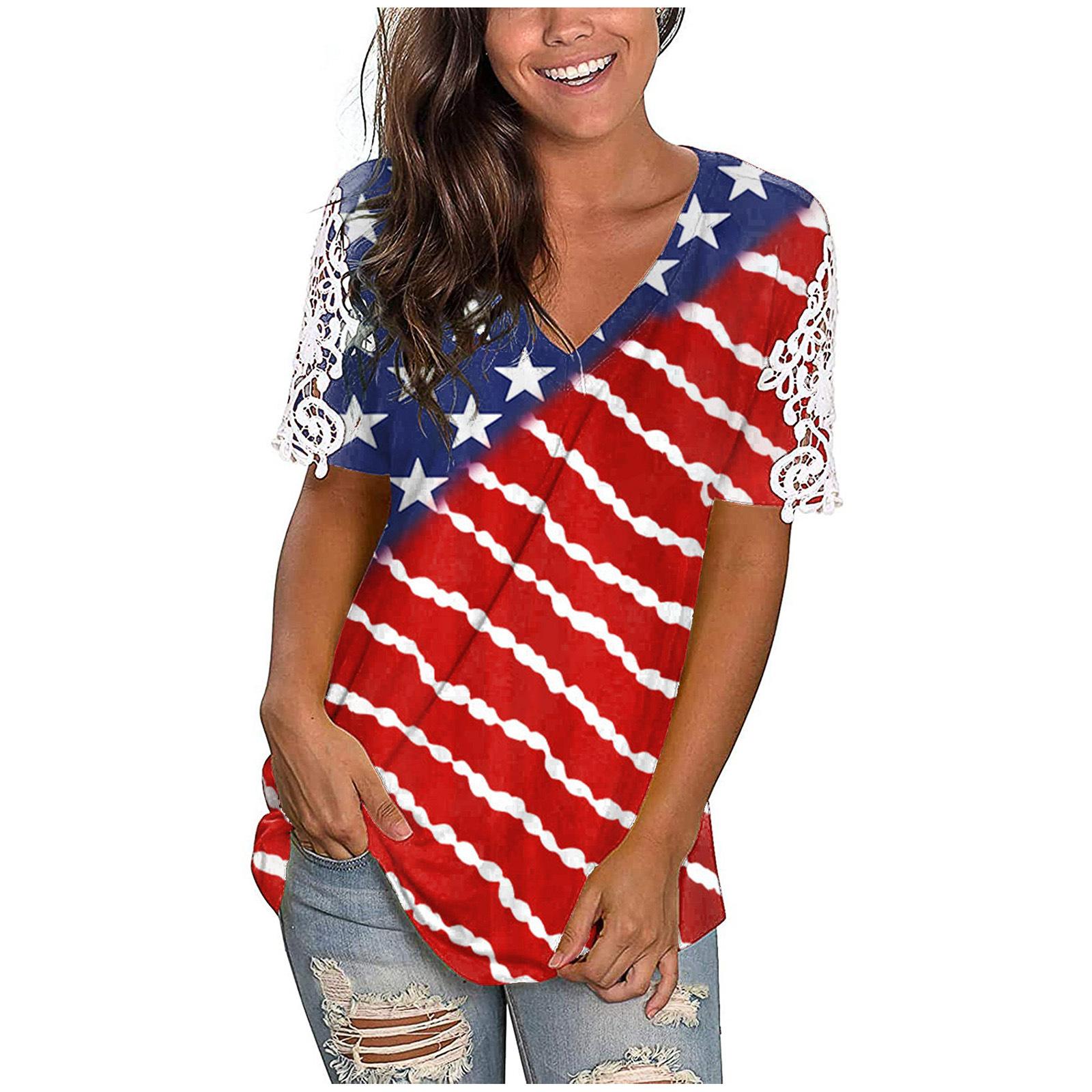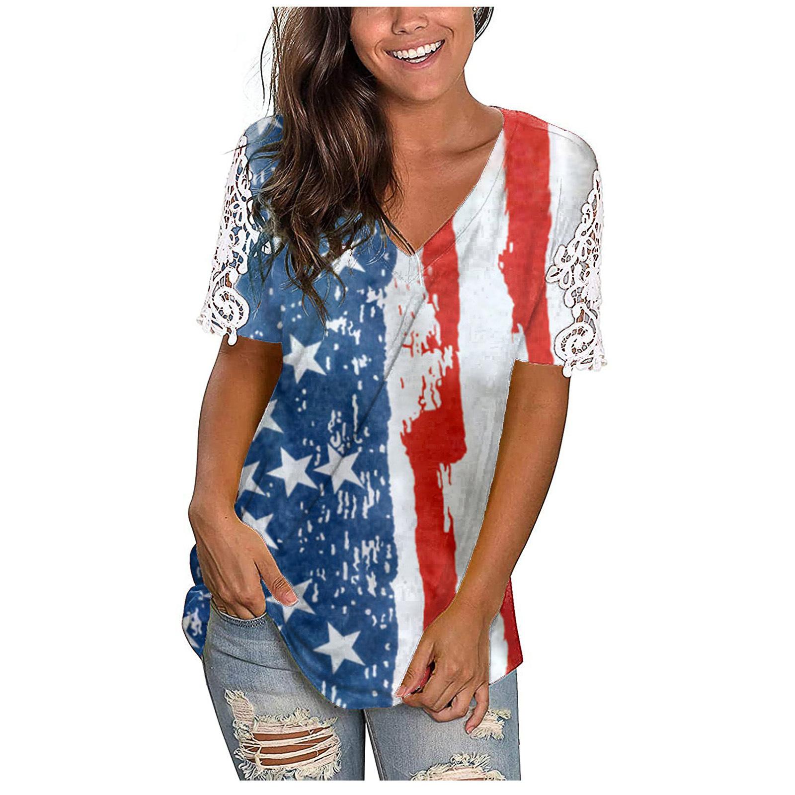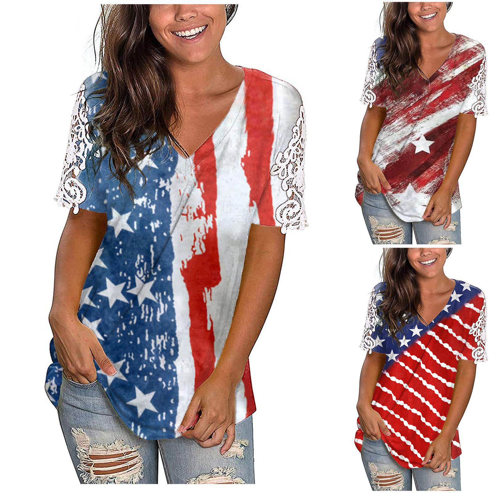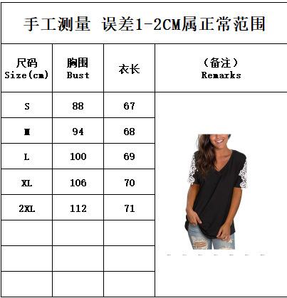 2025 Amazon Nueva Camiseta de Encaje de Manga Corta con Cuello en V para Mujer Top Holgado Casual para Mujer con Diseño de Parche