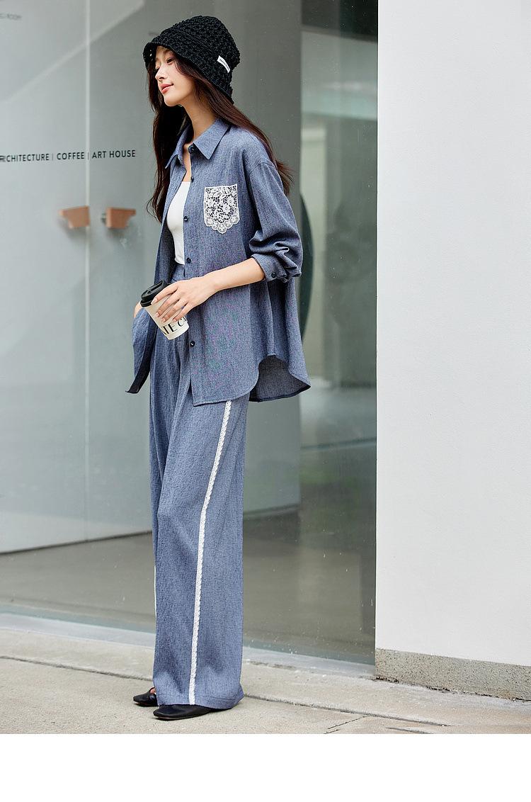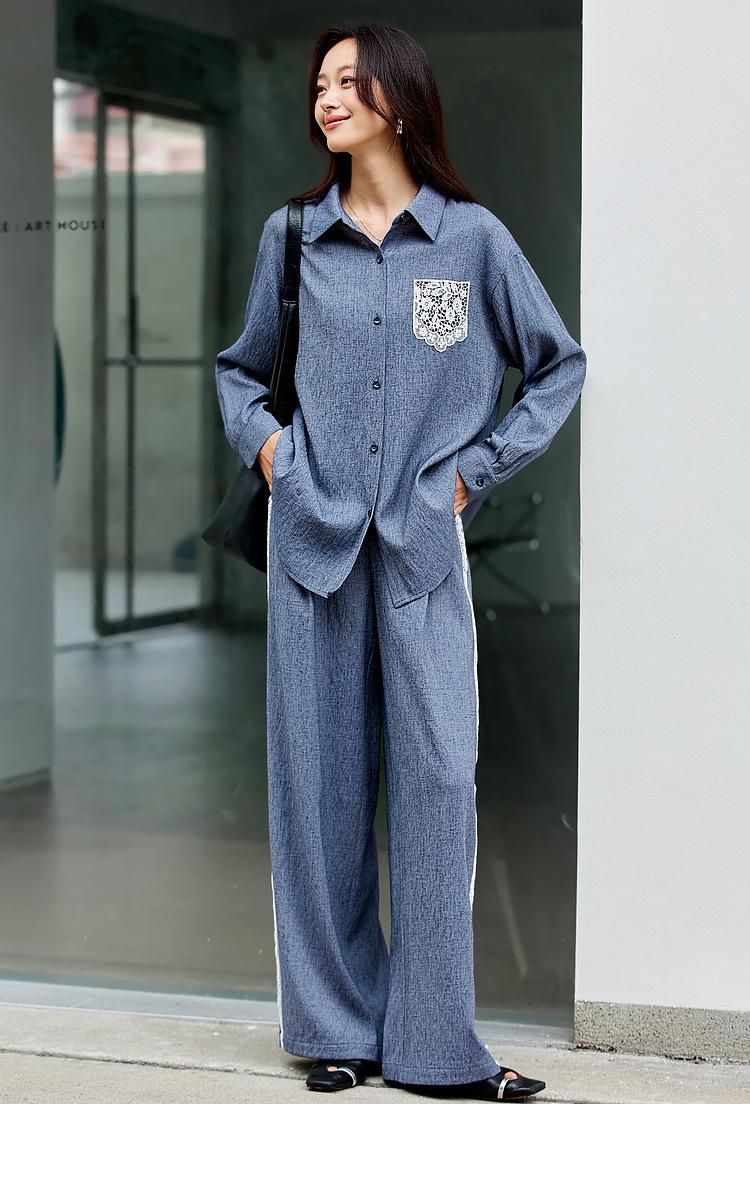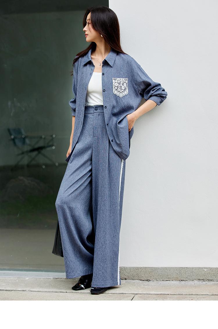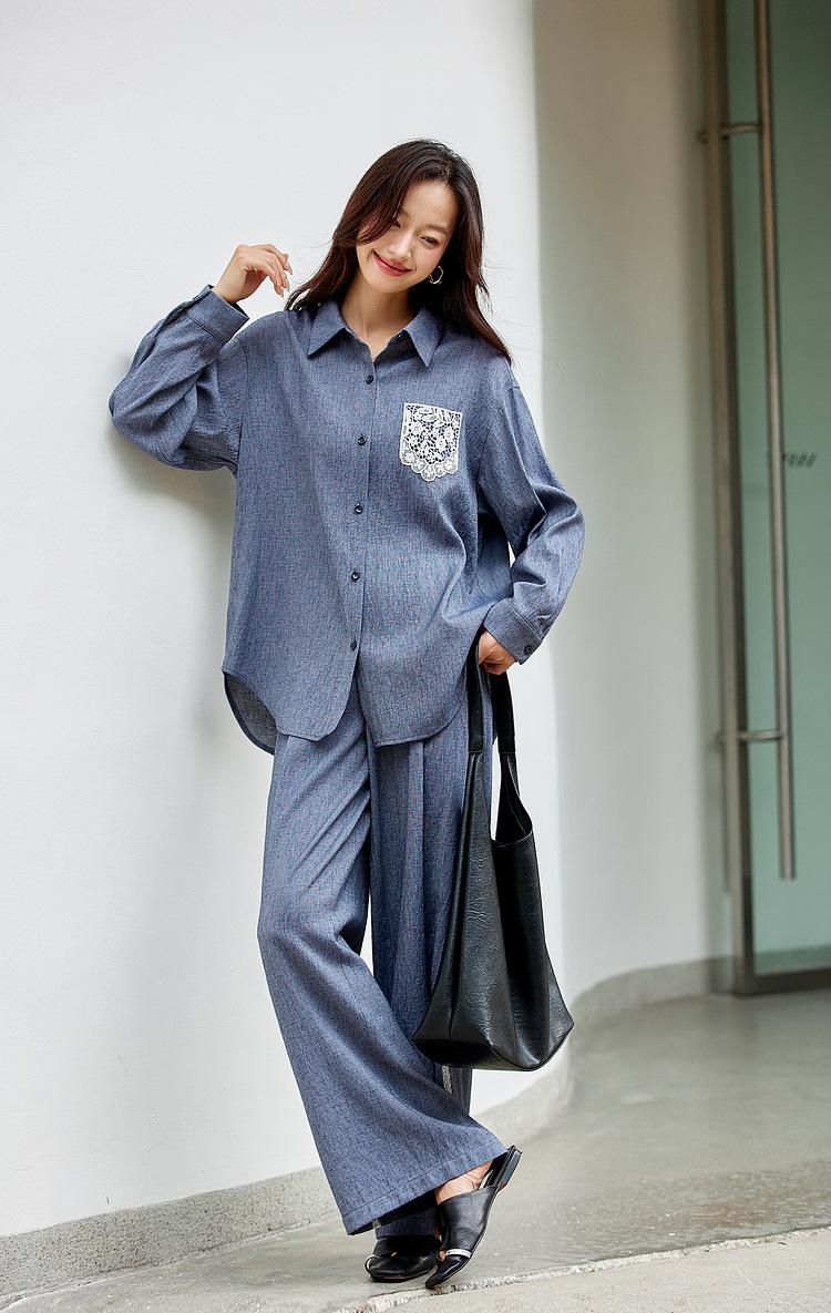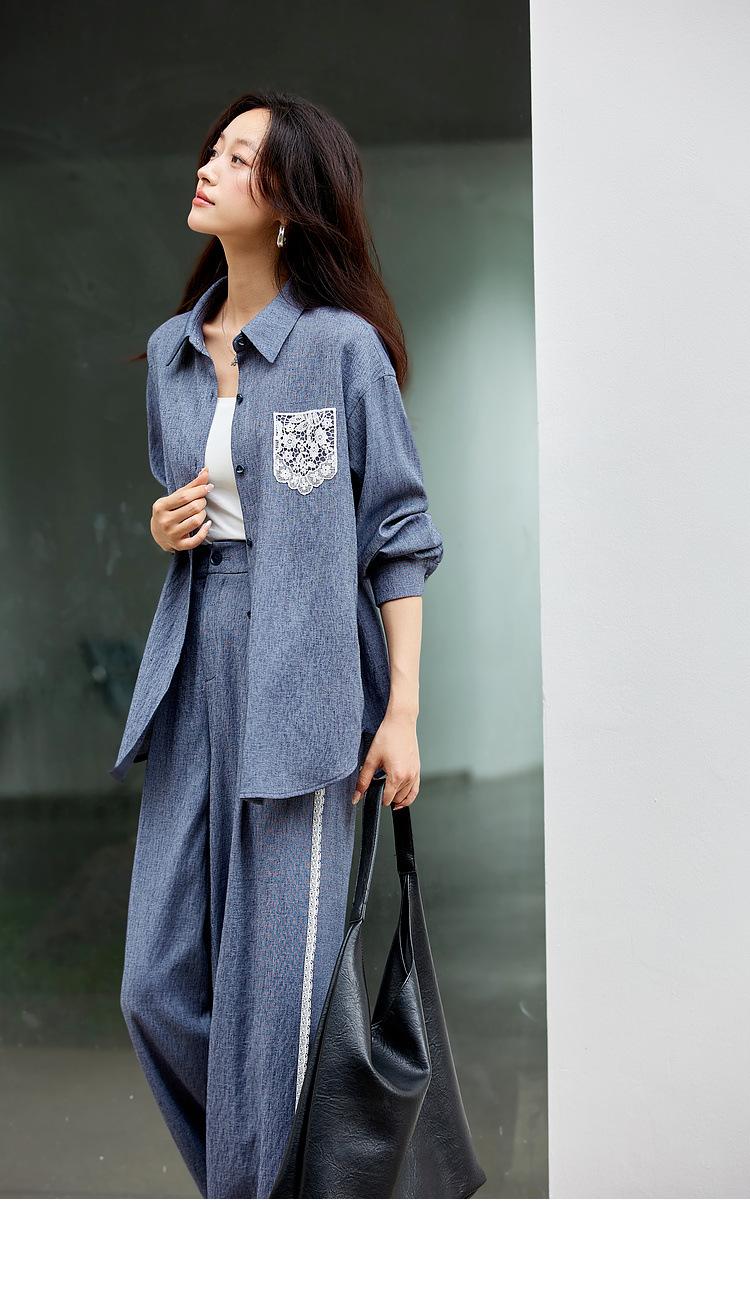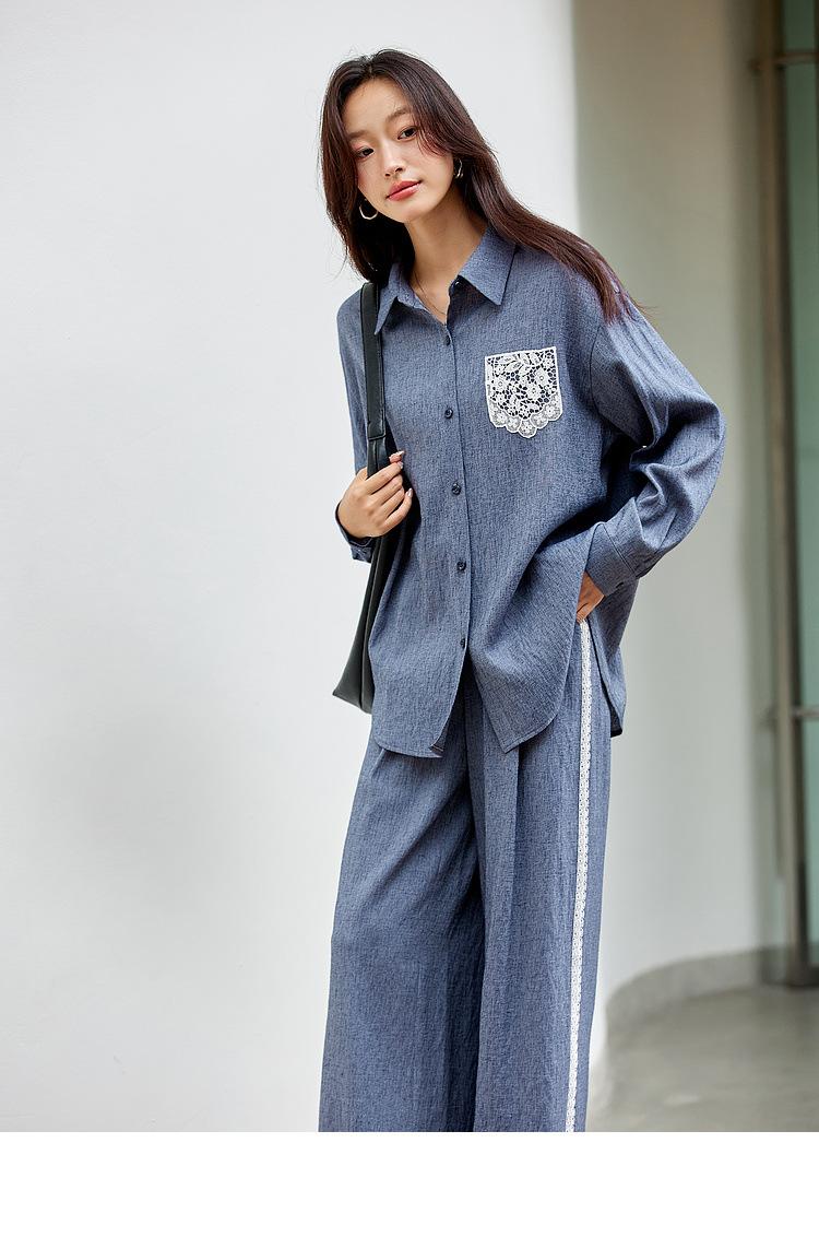 Zhenxi Nuevo Conjunto de Camisa de Encaje con Bolsillo y Cuello Vuelto y Pantalón Largo para Mujer, Conjunto Casual Completo de Dos Piezas SQ935