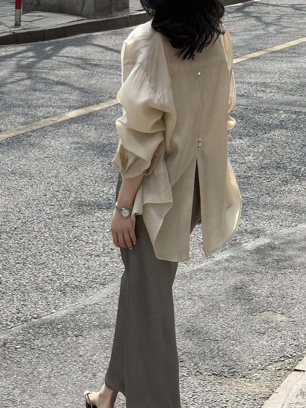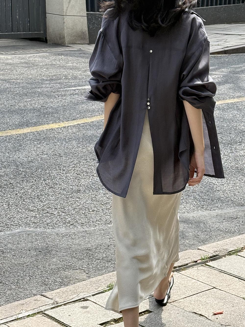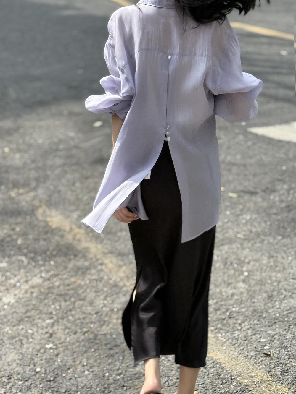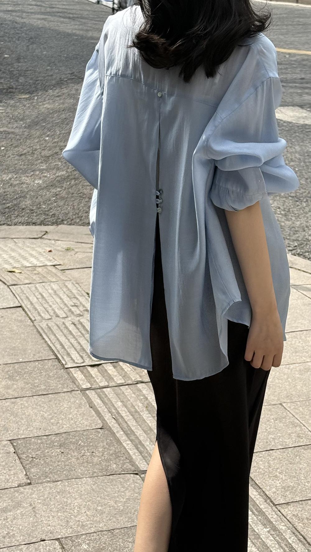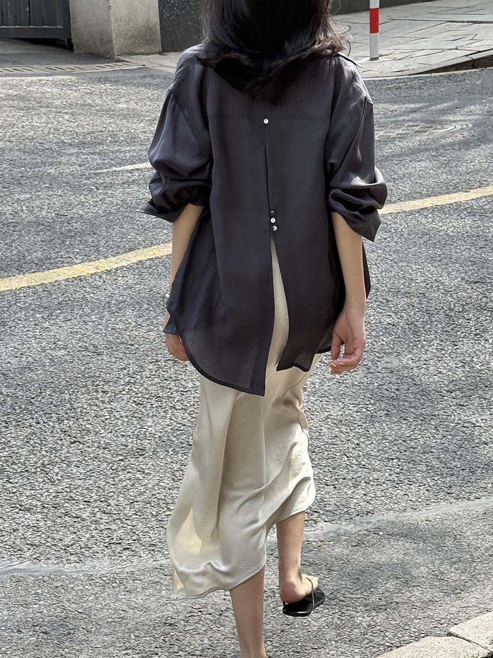 Camisa Tencel con Abertura Trasera para Mujer Verano Diseño Delgado Nicho Blusa Exterior Top Holgado Chaqueta Protección Solar