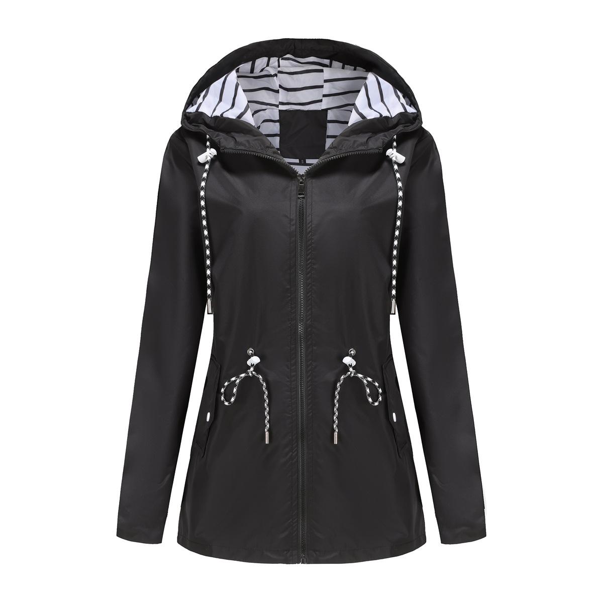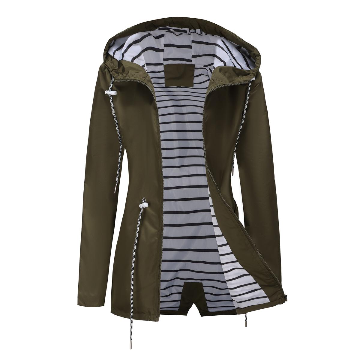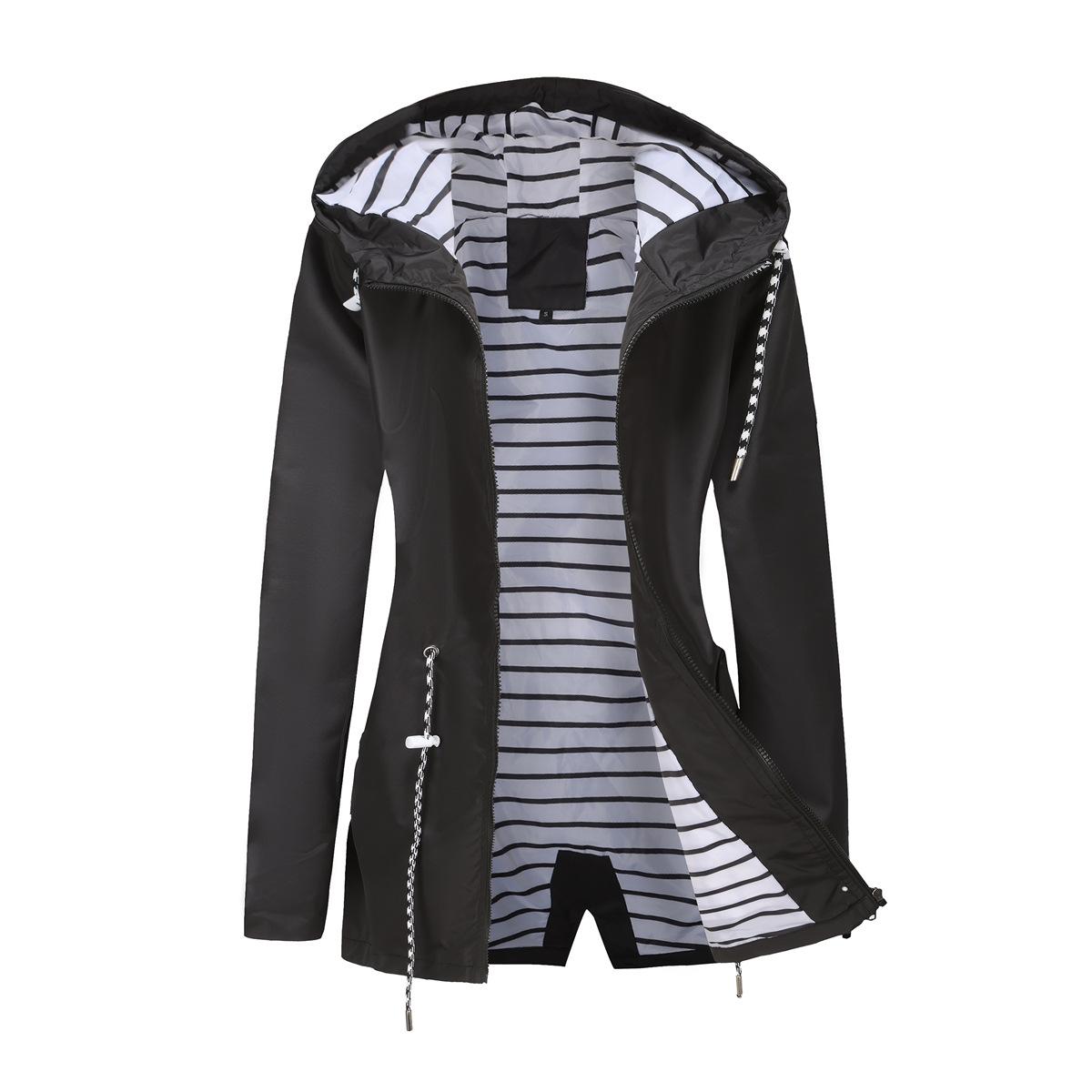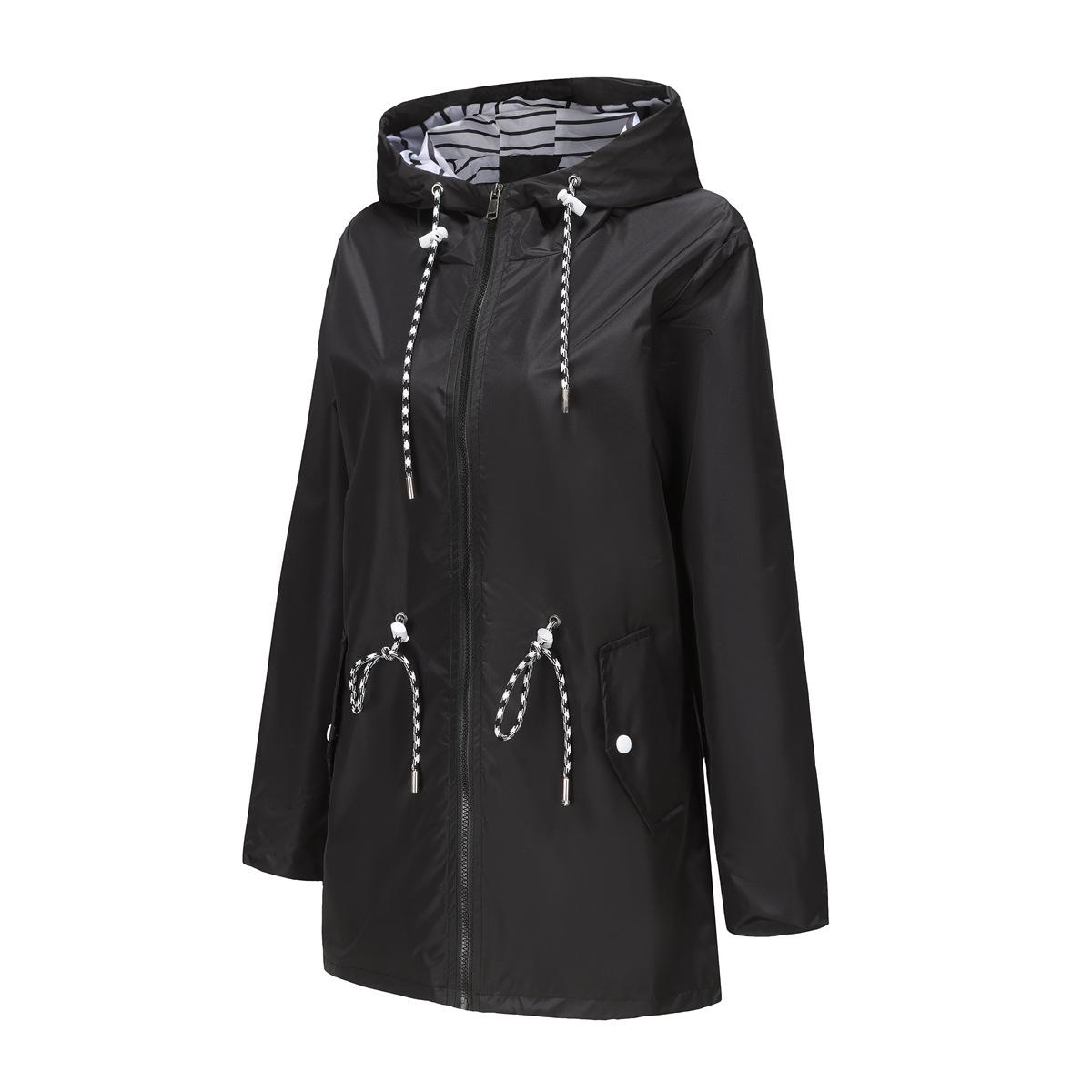 2024 Nuevo Cortavientos Europeo y Americano de Manga Larga Anti-salpicaduras de Largo Medio para Mujer con Capucha a Rayas Impermeable Talla Grande Transfronterizo Ropa de Mujer