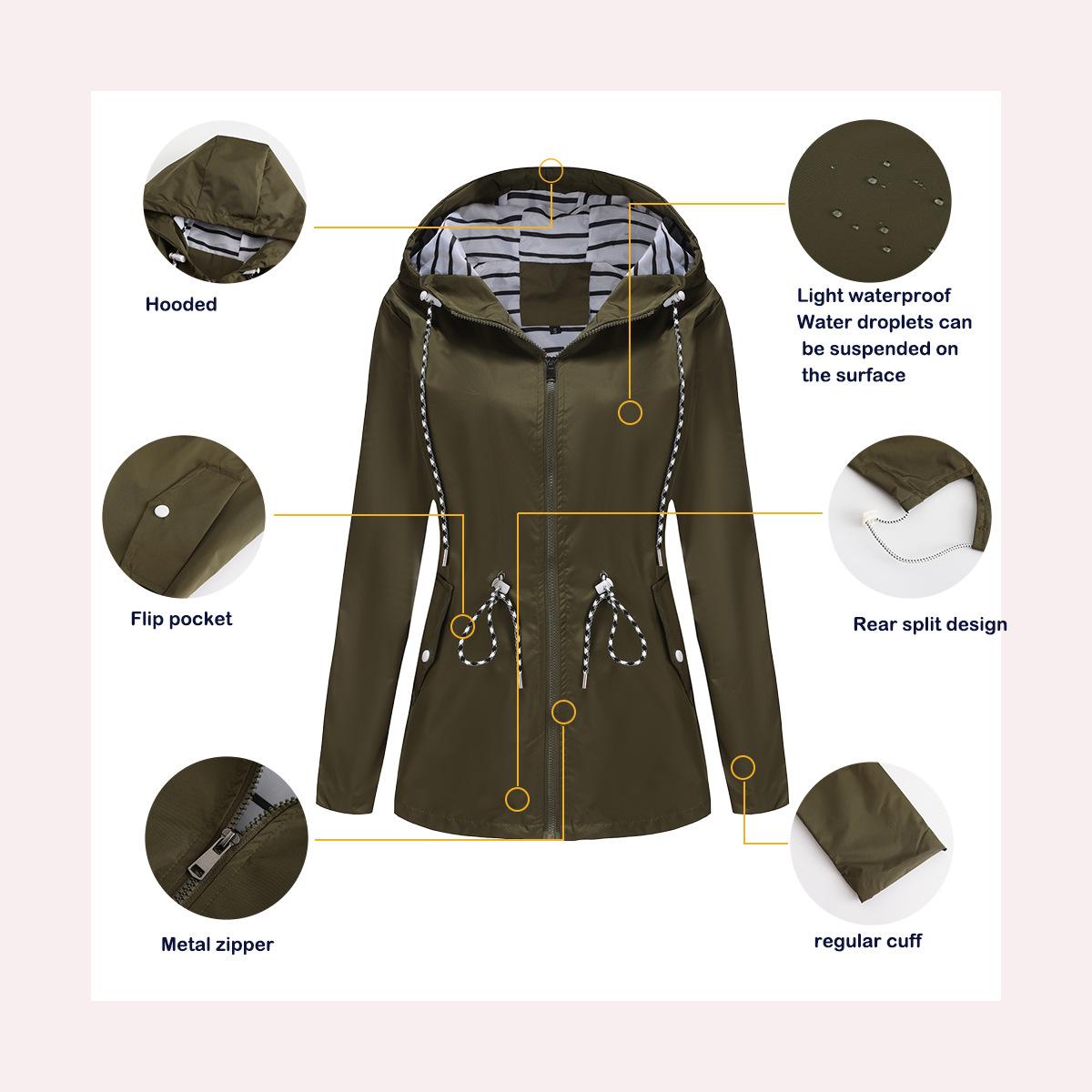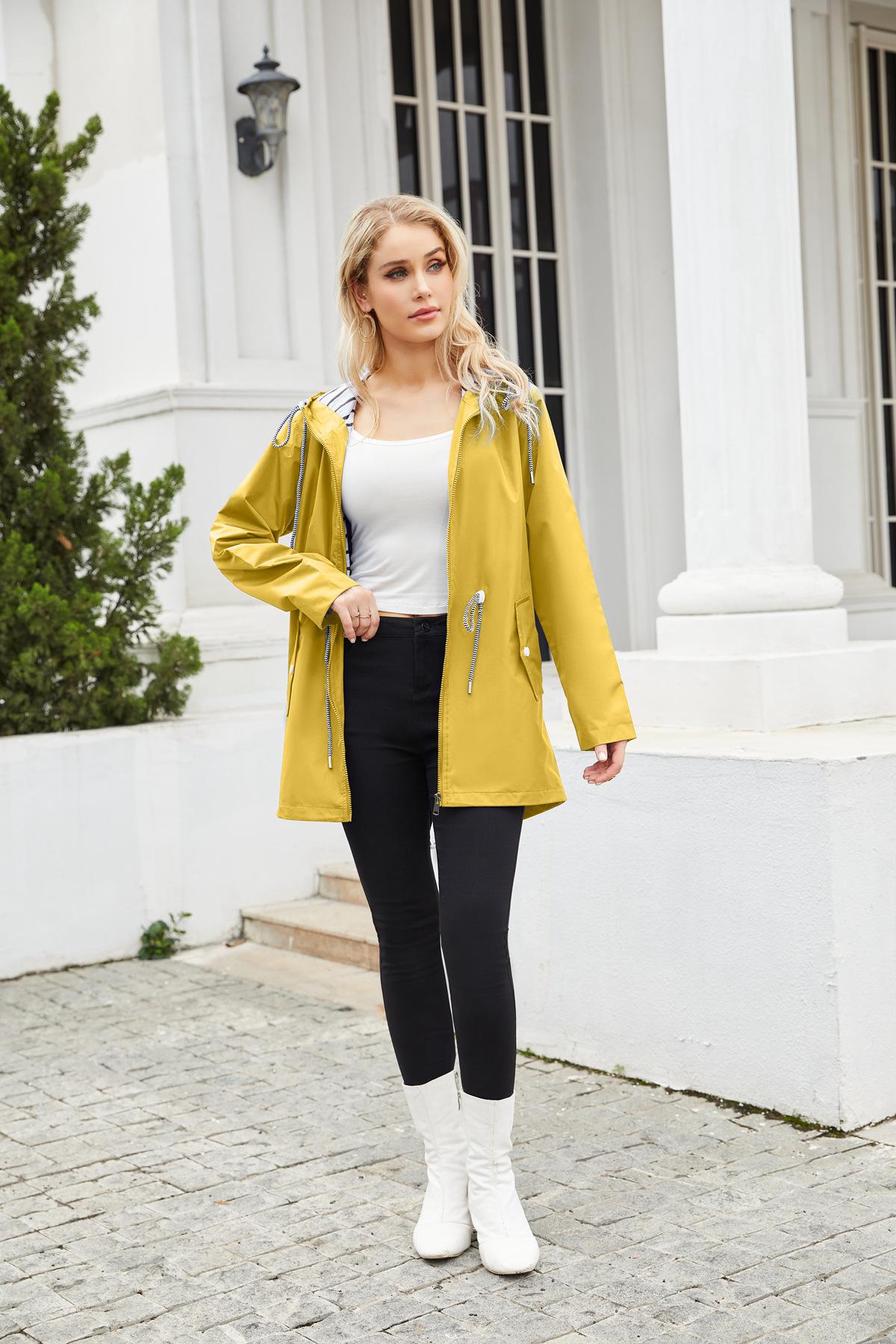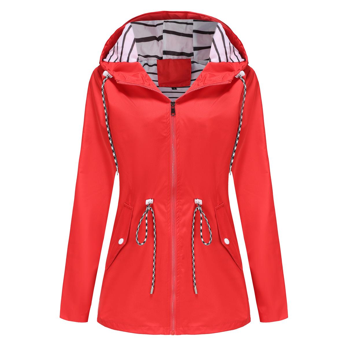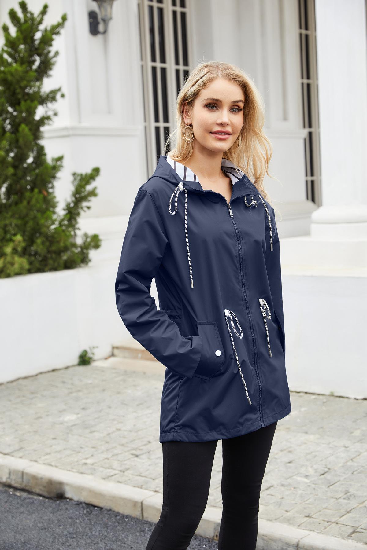 2024 Nuevo Cortavientos Europeo y Americano de Manga Larga Anti-salpicaduras de Largo Medio para Mujer con Capucha a Rayas Impermeable Talla Grande Transfronterizo Ropa de Mujer