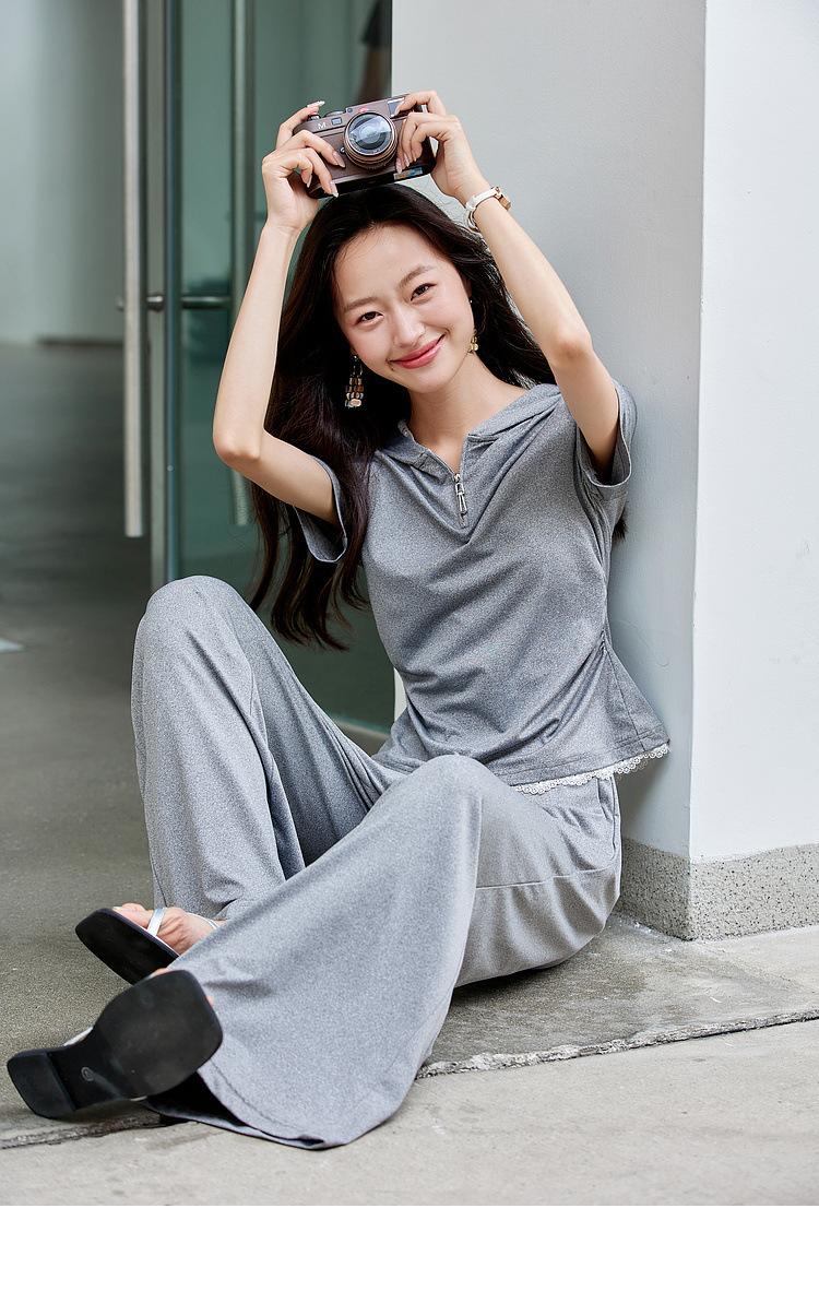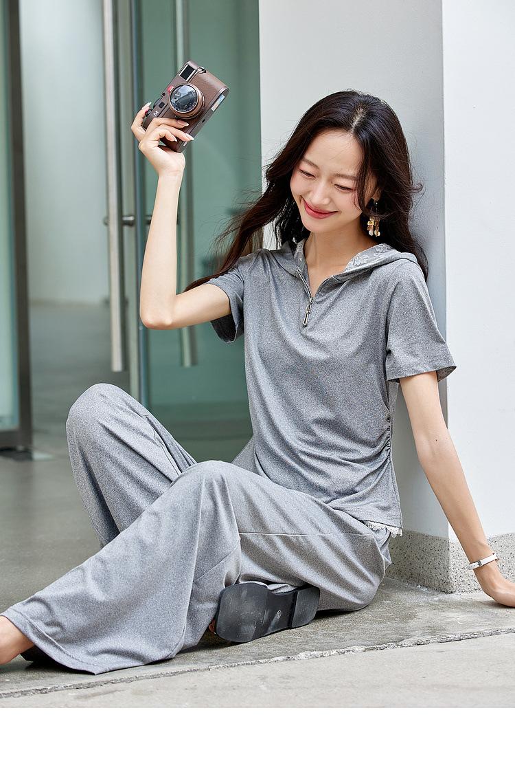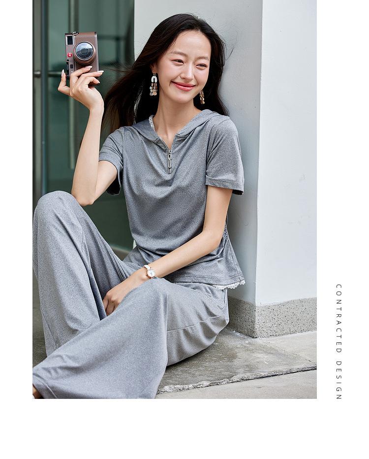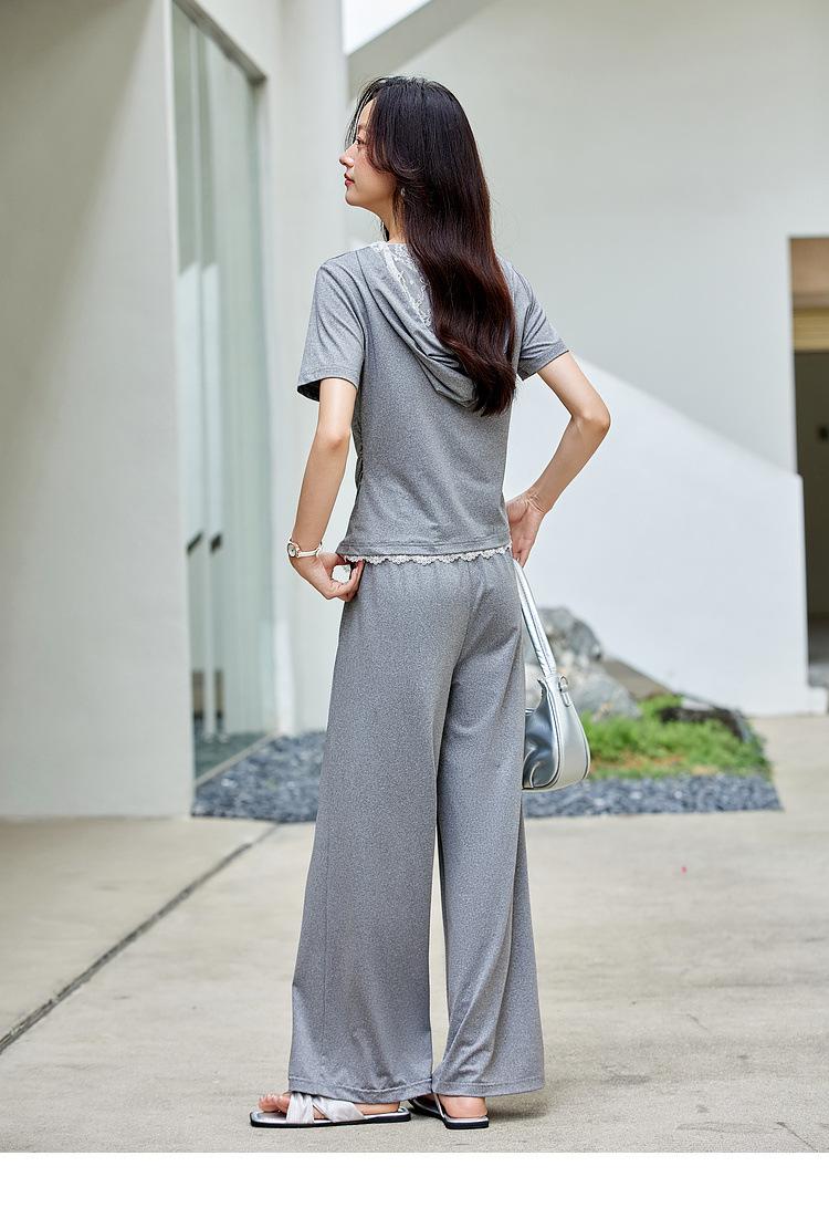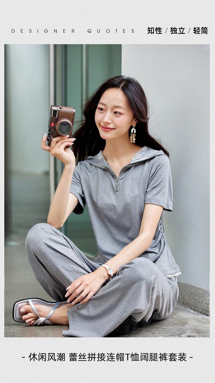 Conjunto de dos piezas casual femenino de Zhenxi con camiseta de manga corta con capucha y encaje y pantalones de pierna ancha Sq917