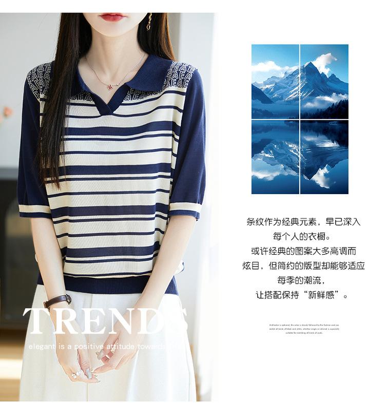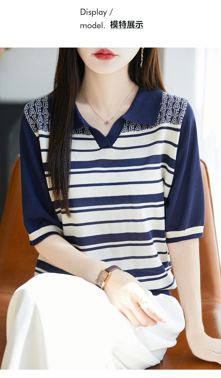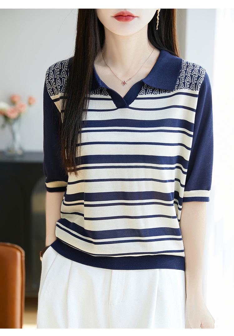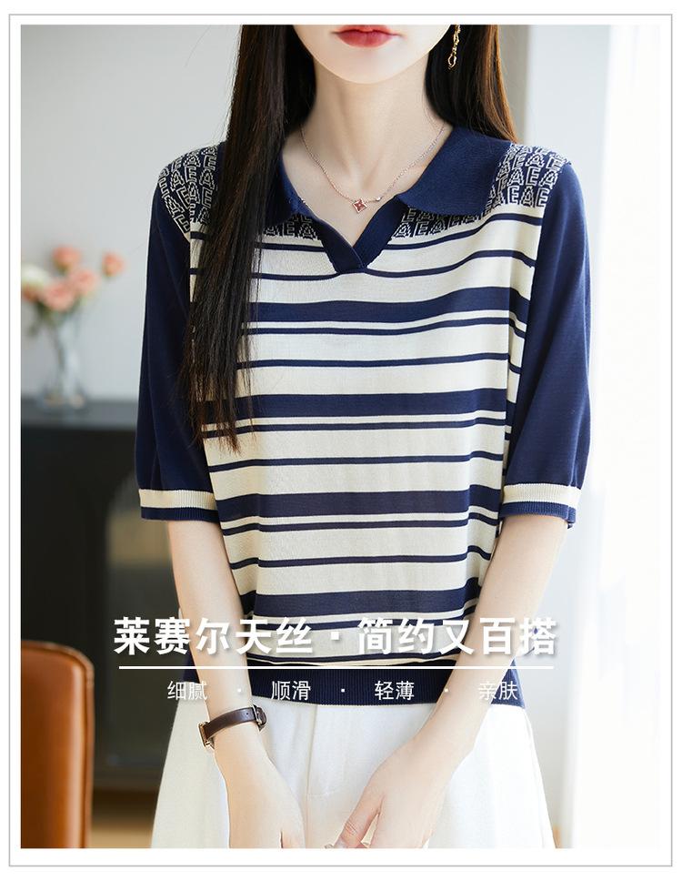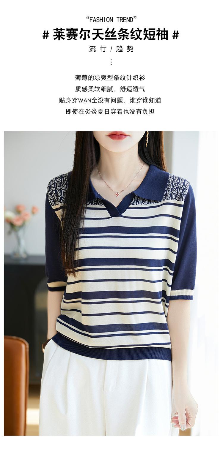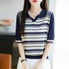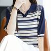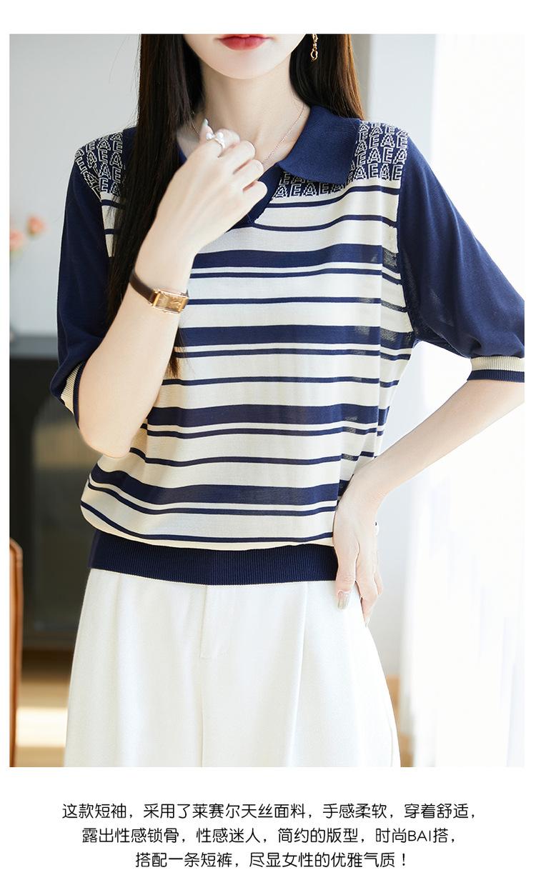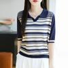2025 Nuevo Estilo de Verano Retro Tencel Lyocell Solapa Tejido de Punto Camiseta de Manga Corta para Mujer Top a Rayas con Bloques de Color