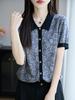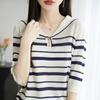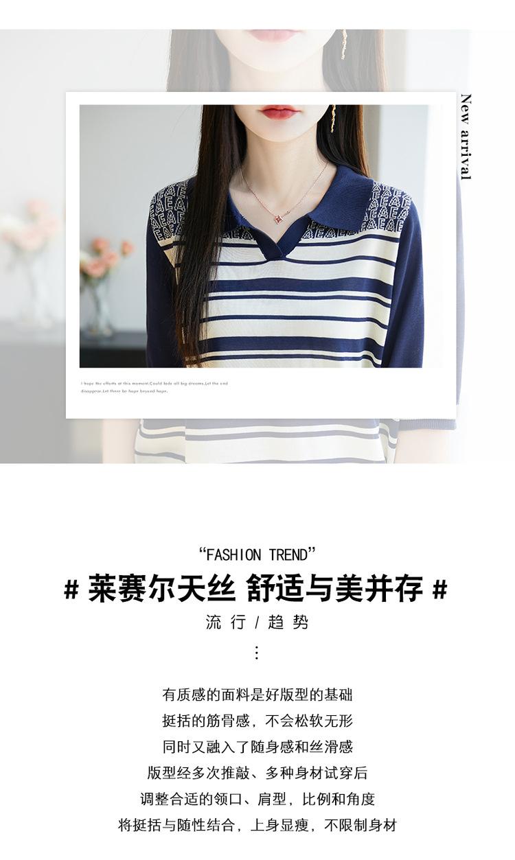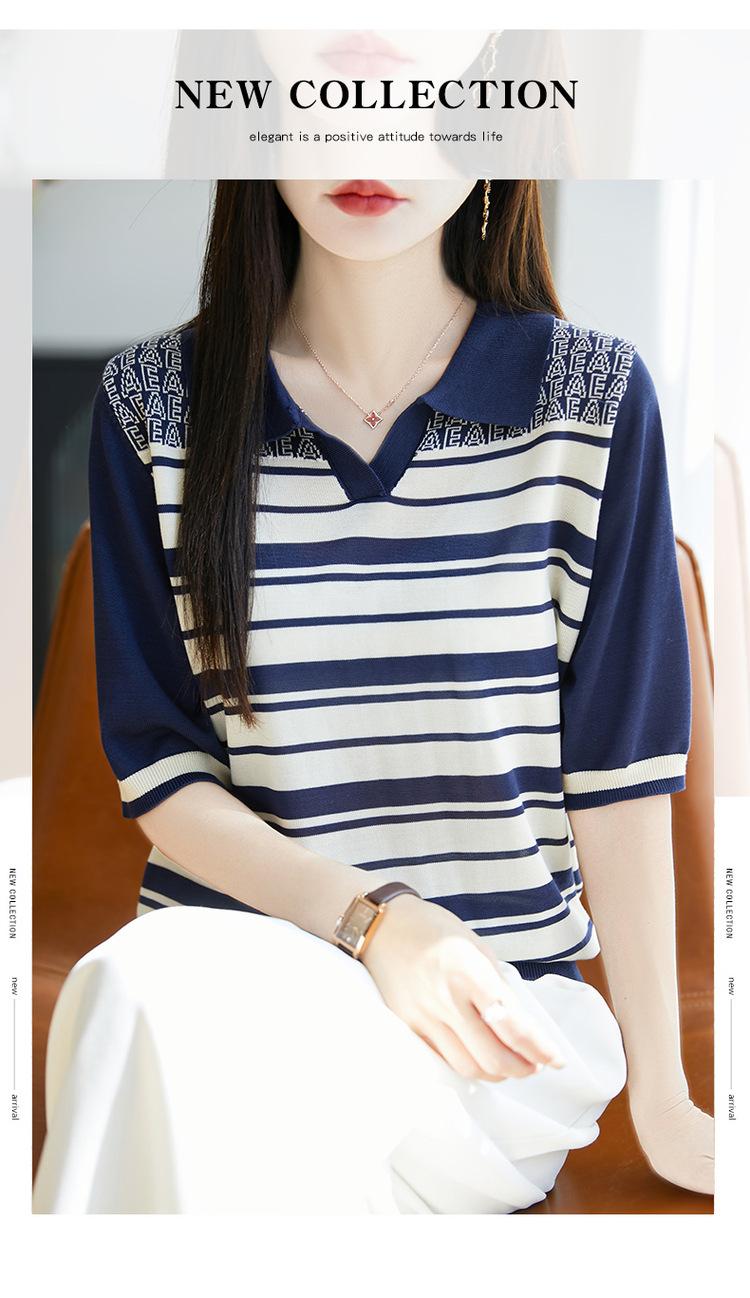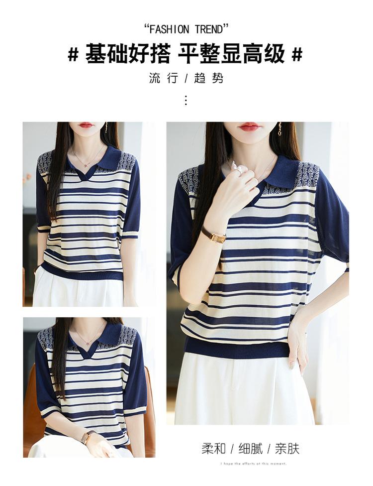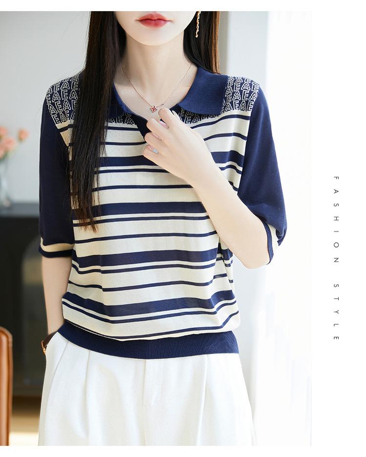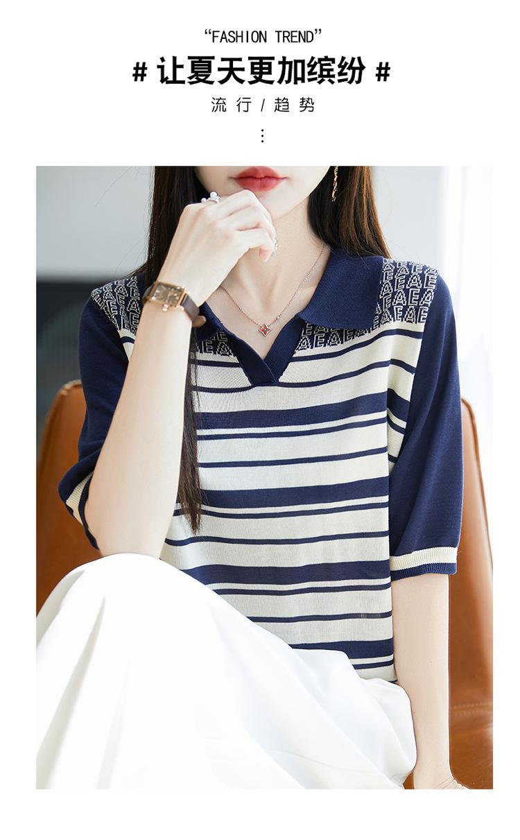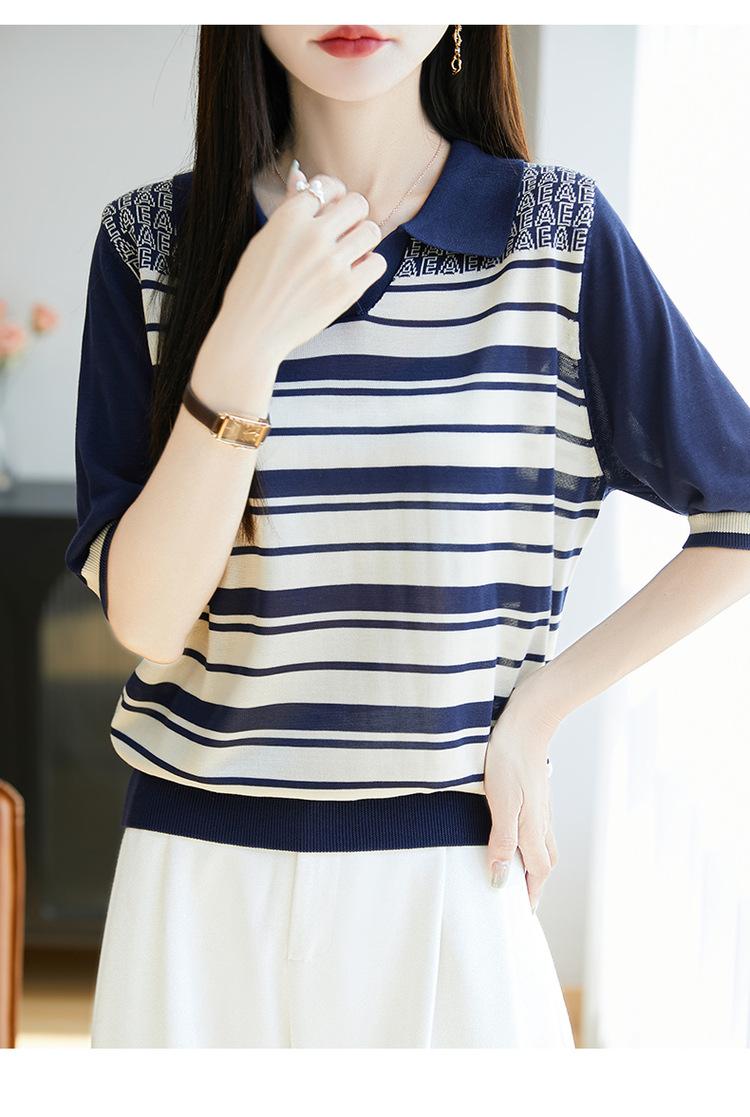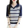 2025 Nuevo Estilo de Verano Retro Tencel Lyocell Solapa Tejido de Punto Camiseta de Manga Corta para Mujer Top a Rayas con Bloques de Color
