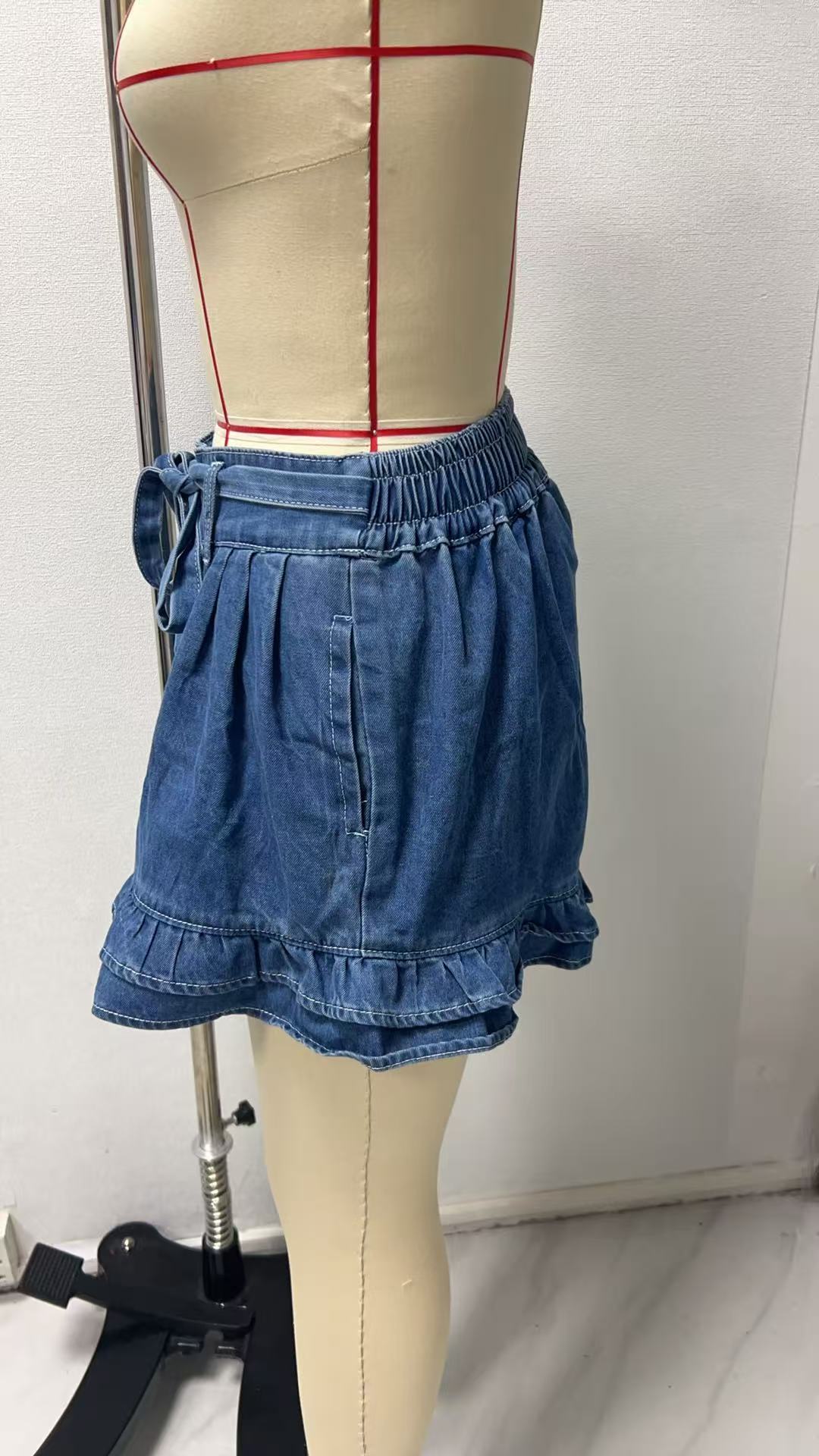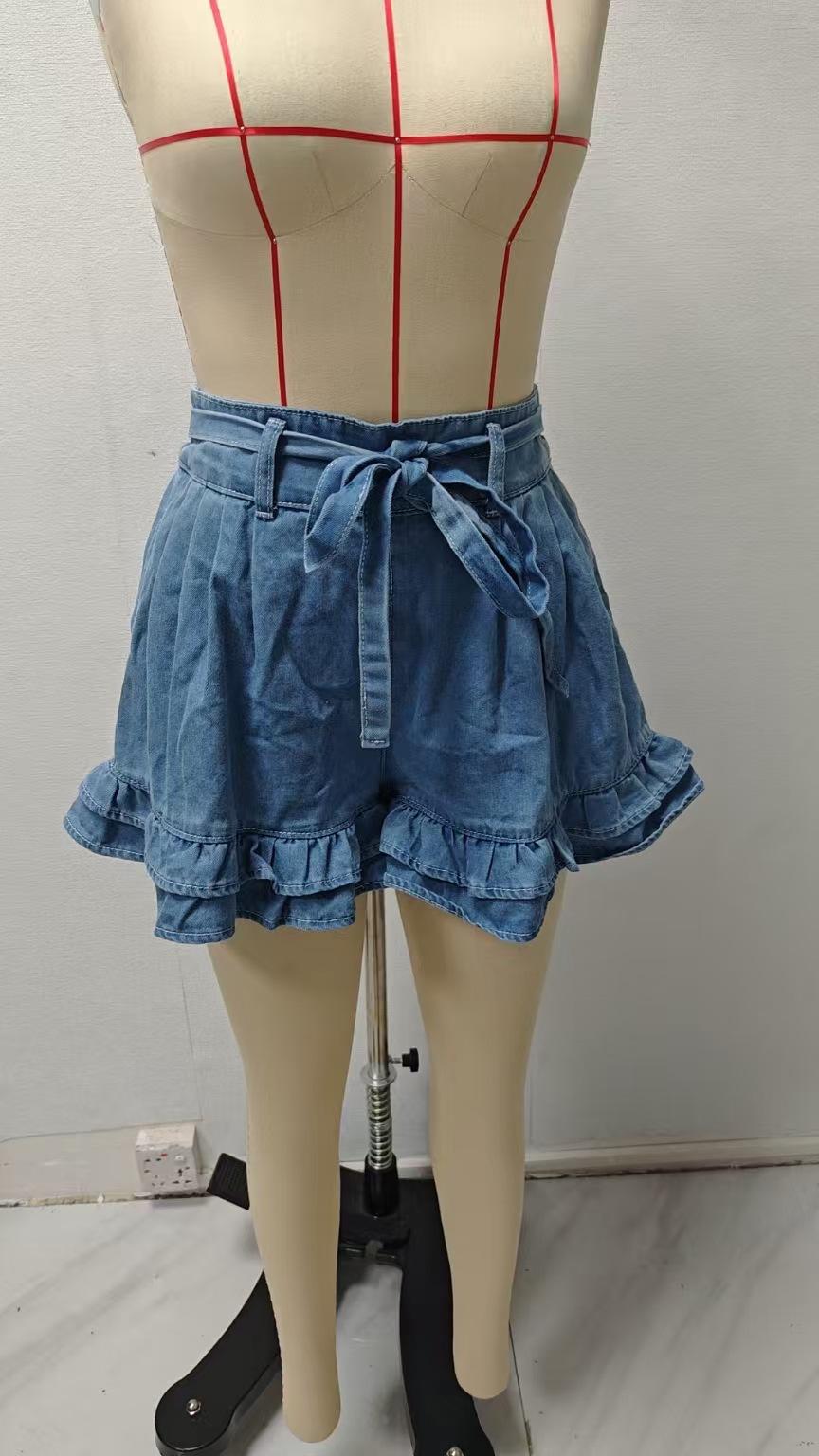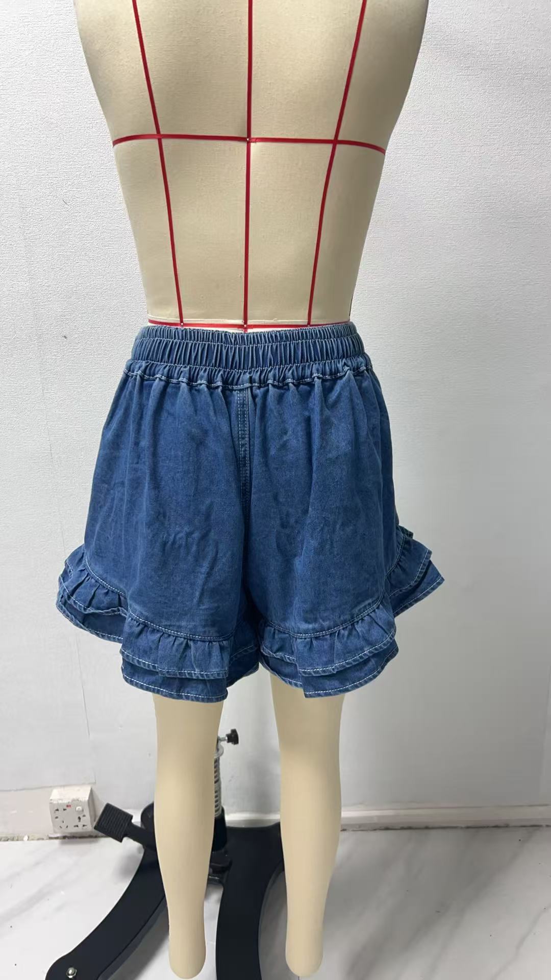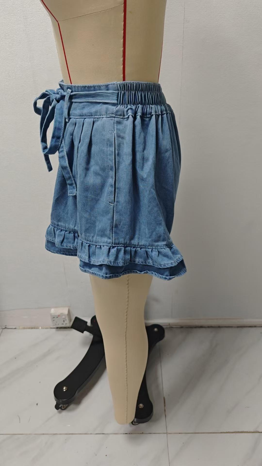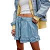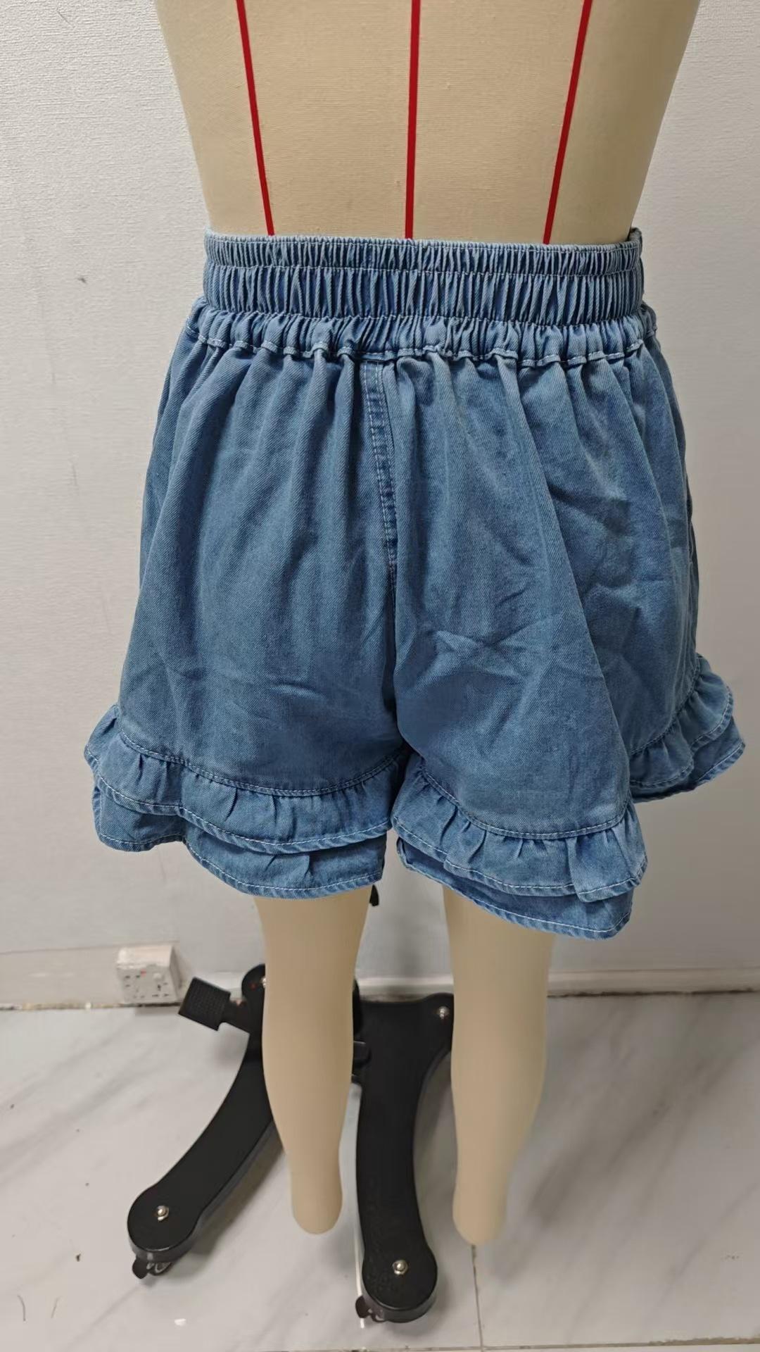 Exportación Transfronteriza 2025 Nuevos Shorts de Mezclilla Plisados con Encaje y Volantes de Cintura Elástica Media para Mujer