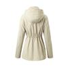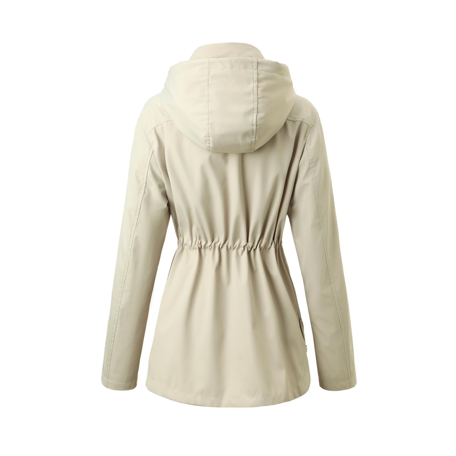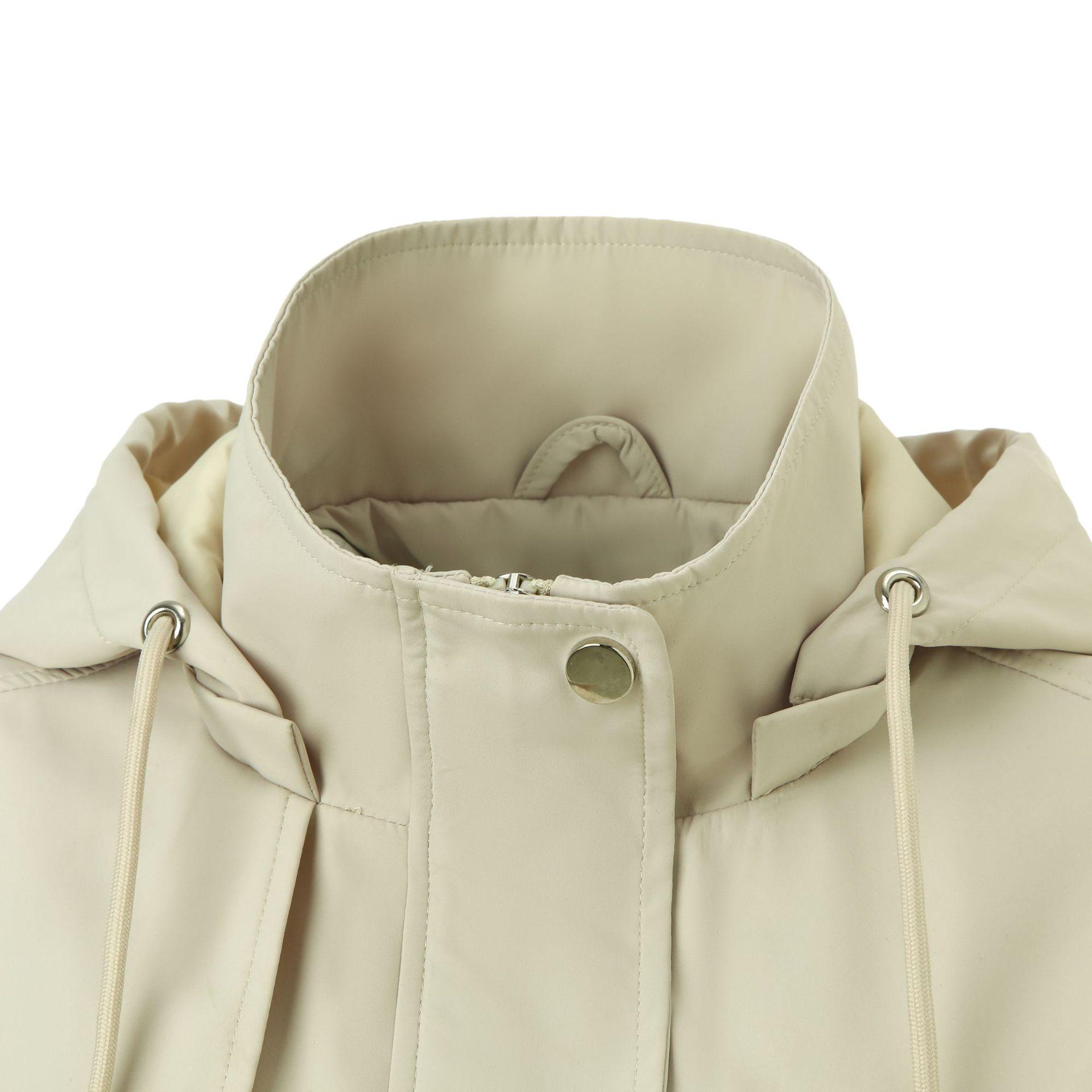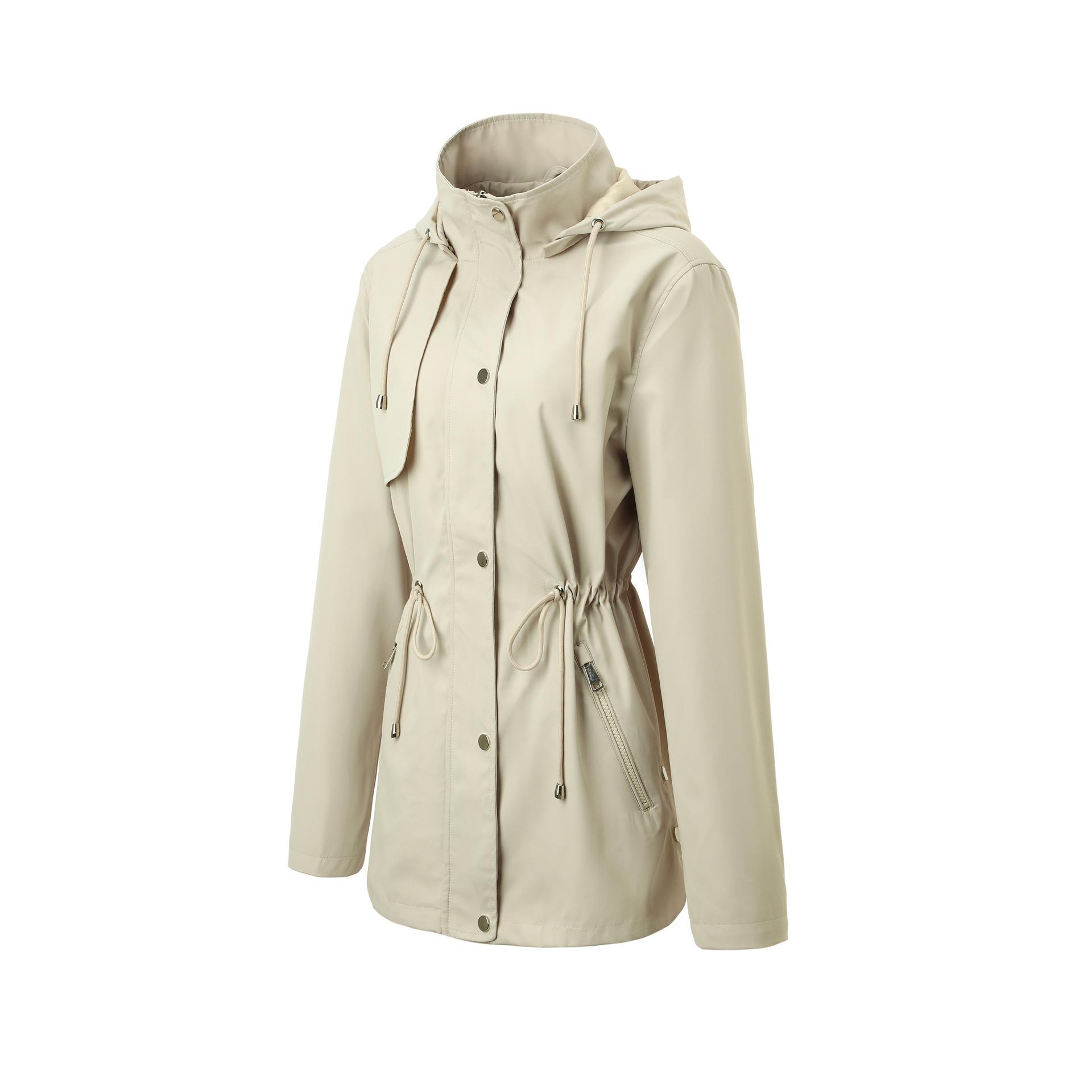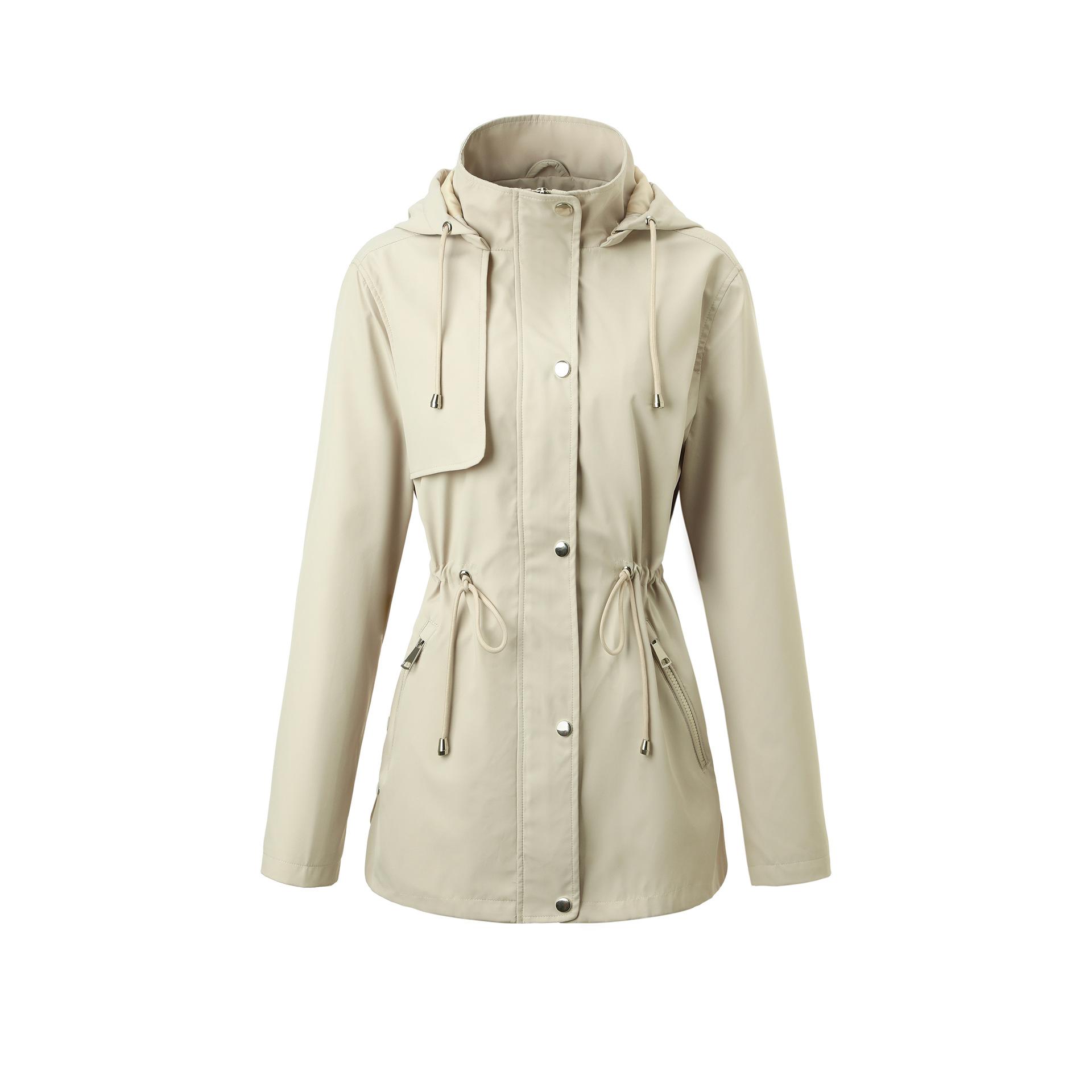 Abrigo trench beige de gran venta para mujer con capucha y solapa, doble tapeta con cremallera + cintura con cordón, tres colores en stock, fábrica directa al por mayor