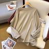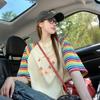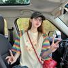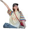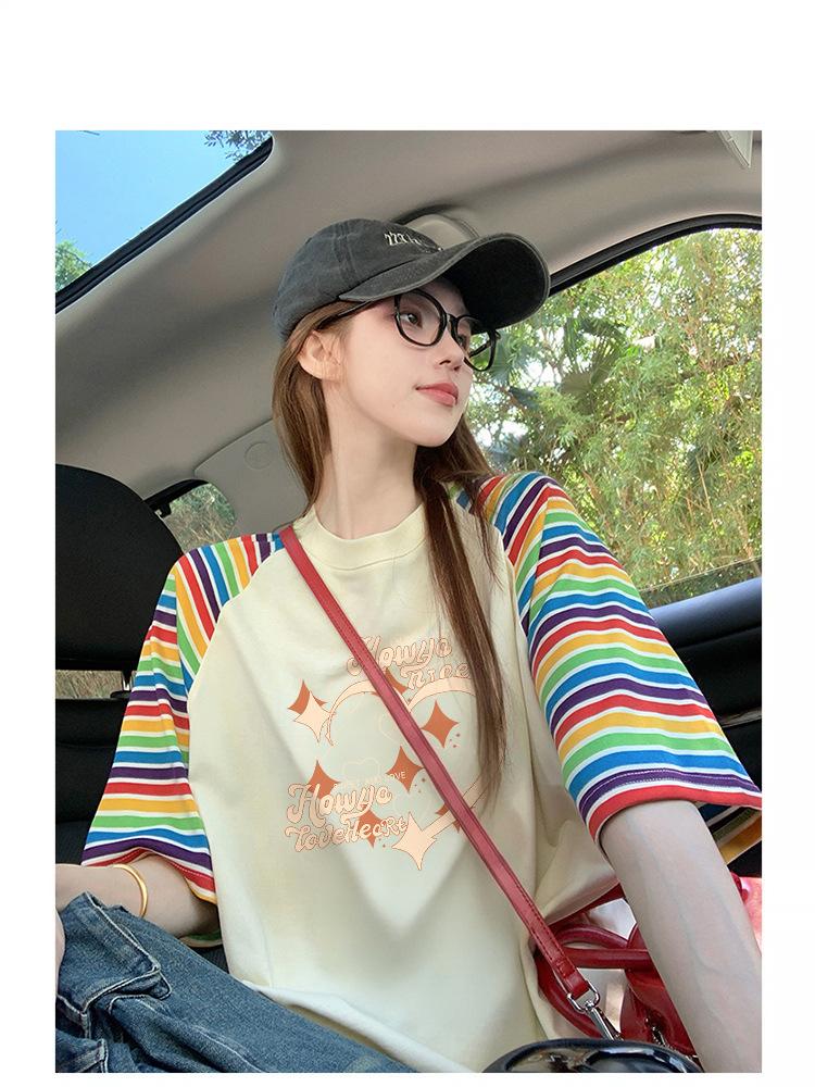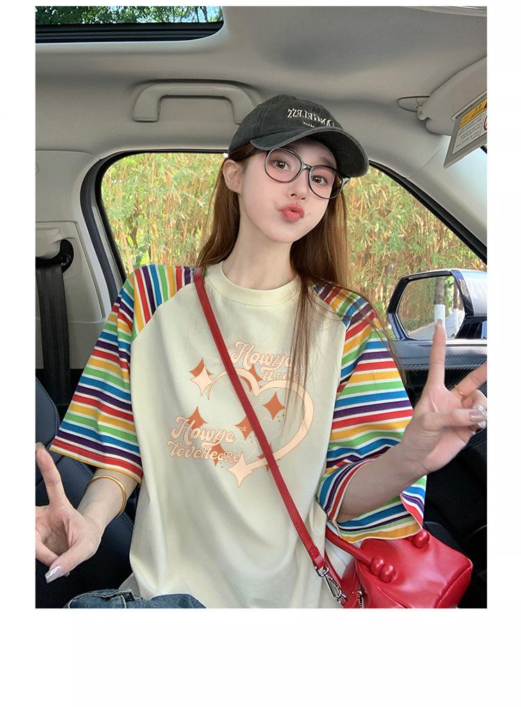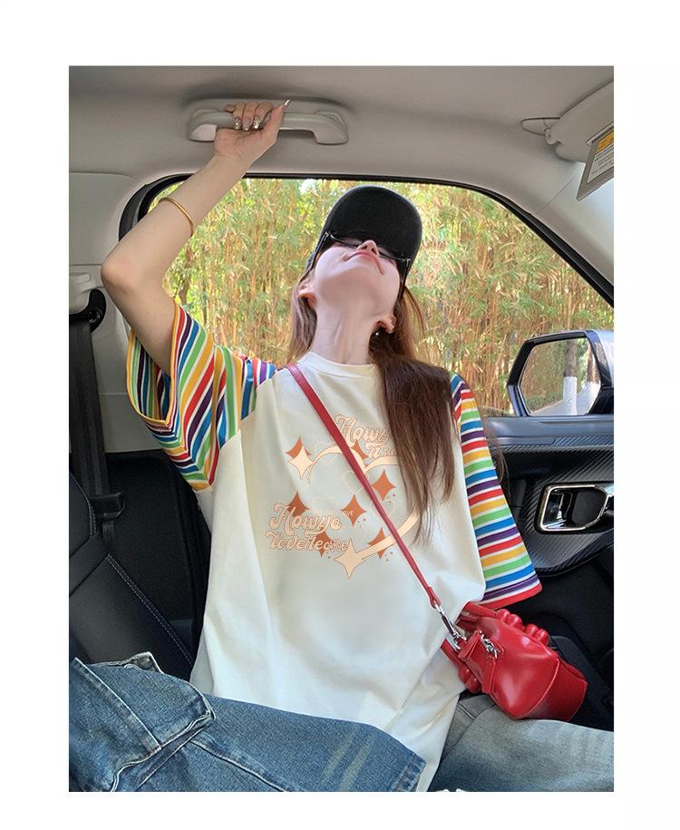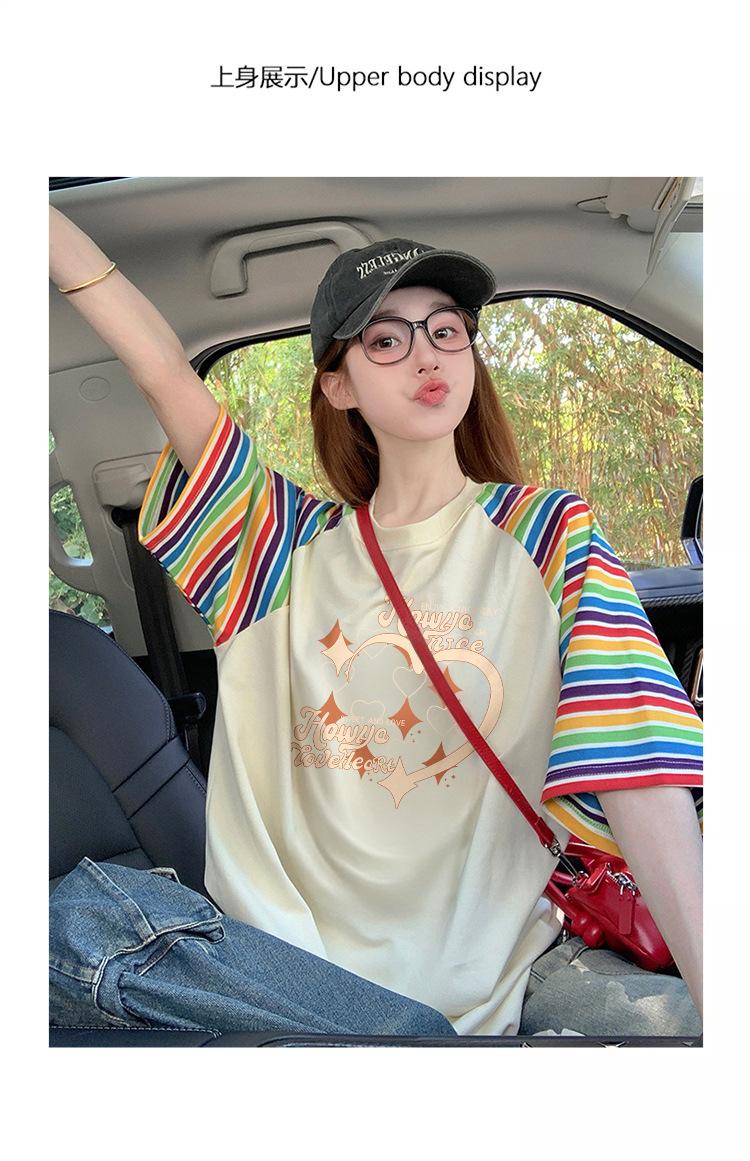 Playera de Algodón Puro de Largo Medio con Forma de Corazón de Estilo Perezoso para Mujer, Hermosas Mangas Raglán Coloridas a Rayas, Top Holgado Cubre-Carnes de Versión Grande