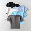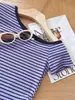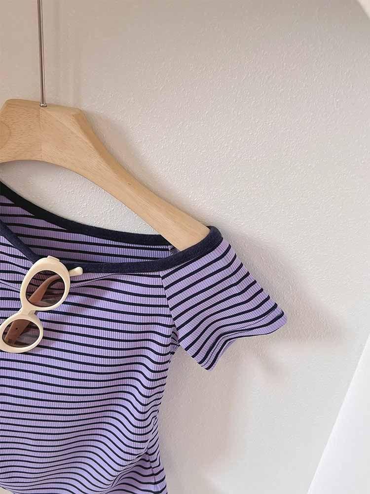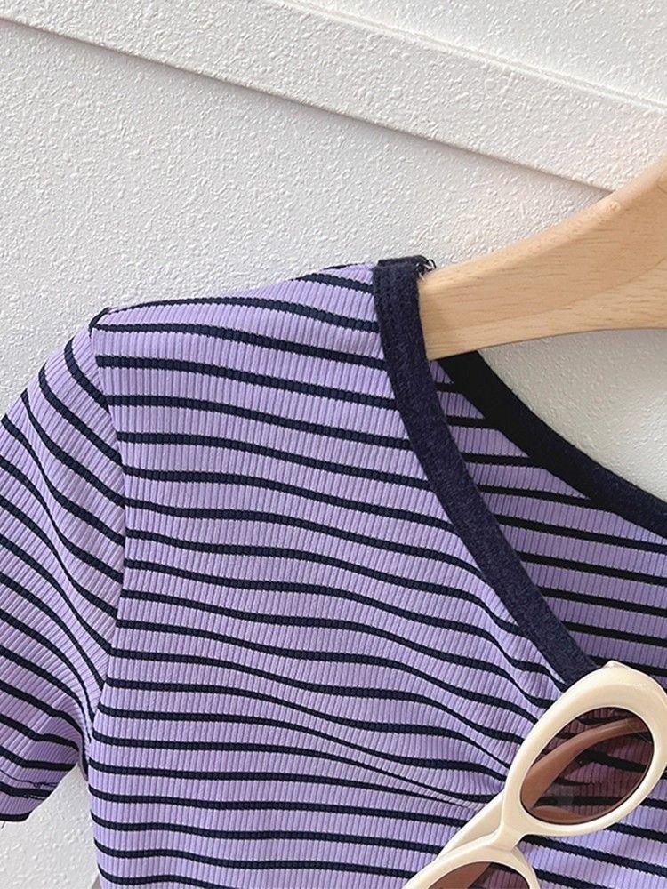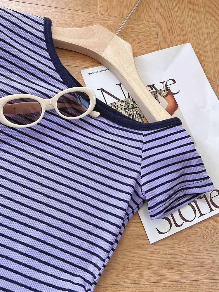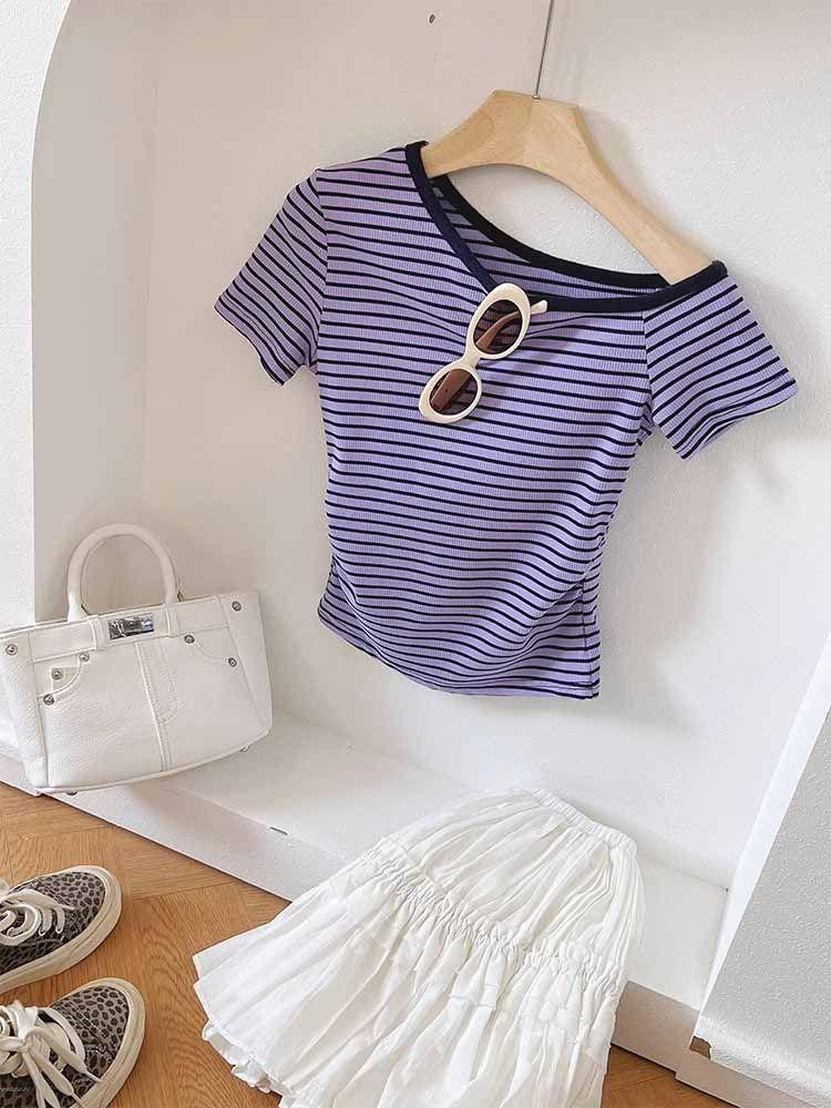 Playera Morada a Rayas de un Hombro Manga Corta para Mujer Verano 2025 Nuevo Estilo Hot Girl Adelgazante Corto Crop Top
