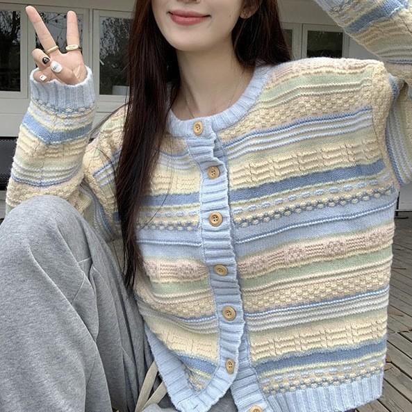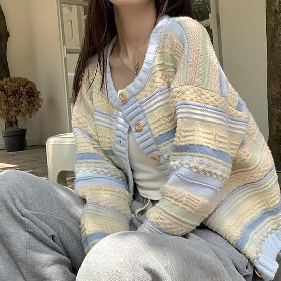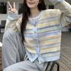 Principios de Otoño e Invierno 2025 Nuevo Estilo Coreano Ropa Exterior Suelta a Rayas Versátil Suéter de Punto Chaqueta Cárdigan Delgada para Mujer