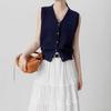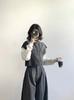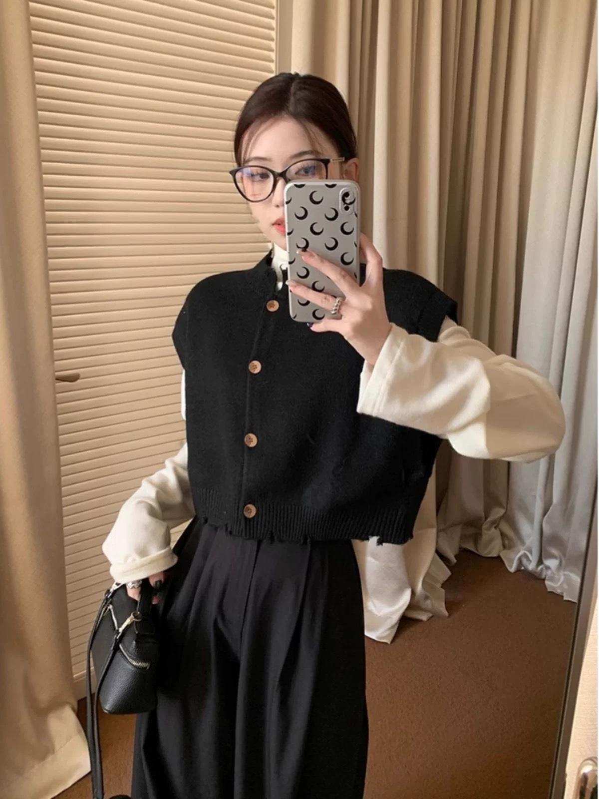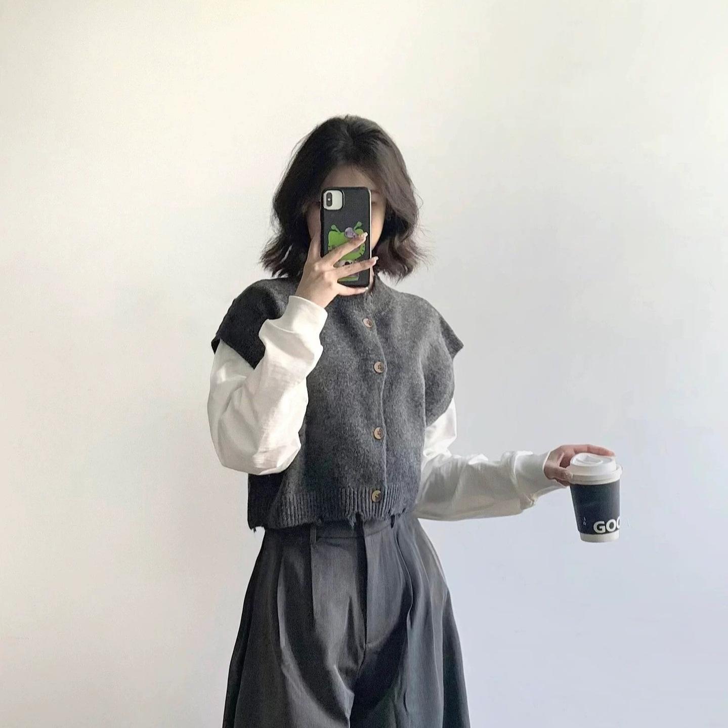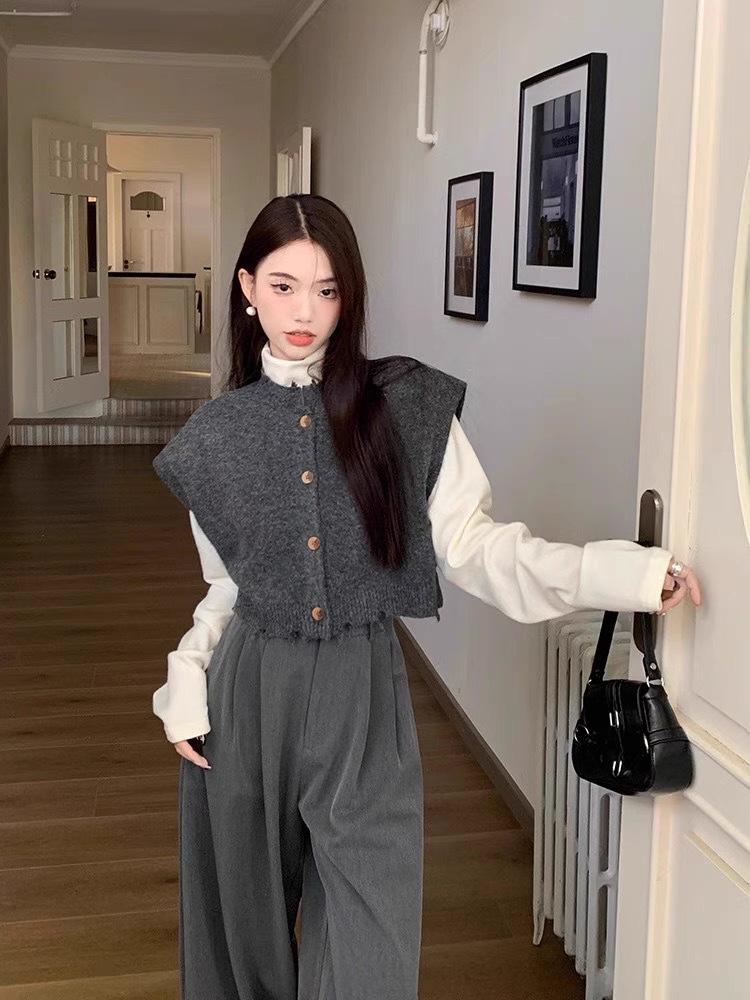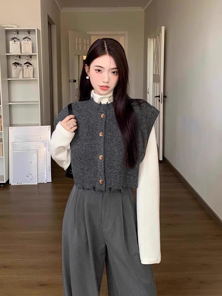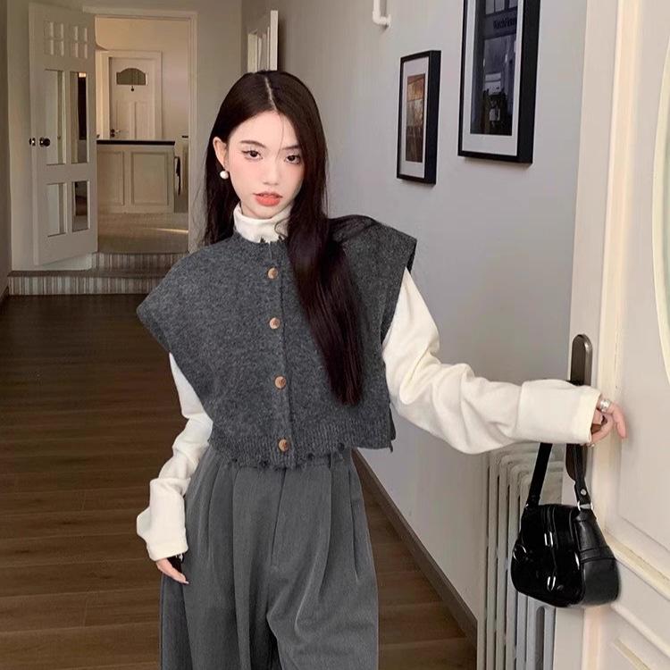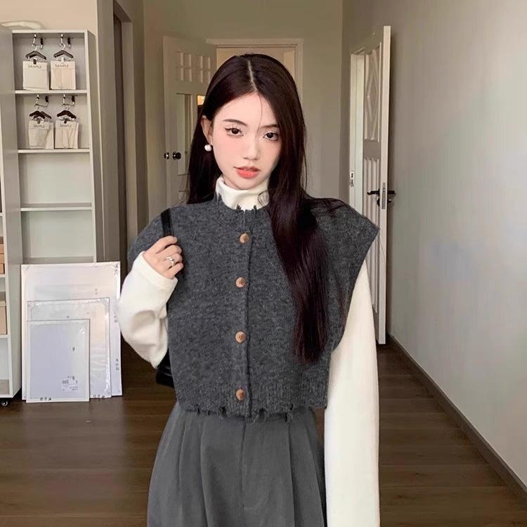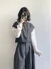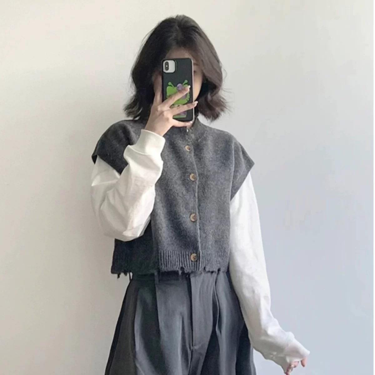 Principios de Otoño Chaleco Tejido en Capas Gris para Mujer Cárdigan de Punto Holgado con Temperamento Abrigo Corto sin Mangas Camiseta sin Mangas