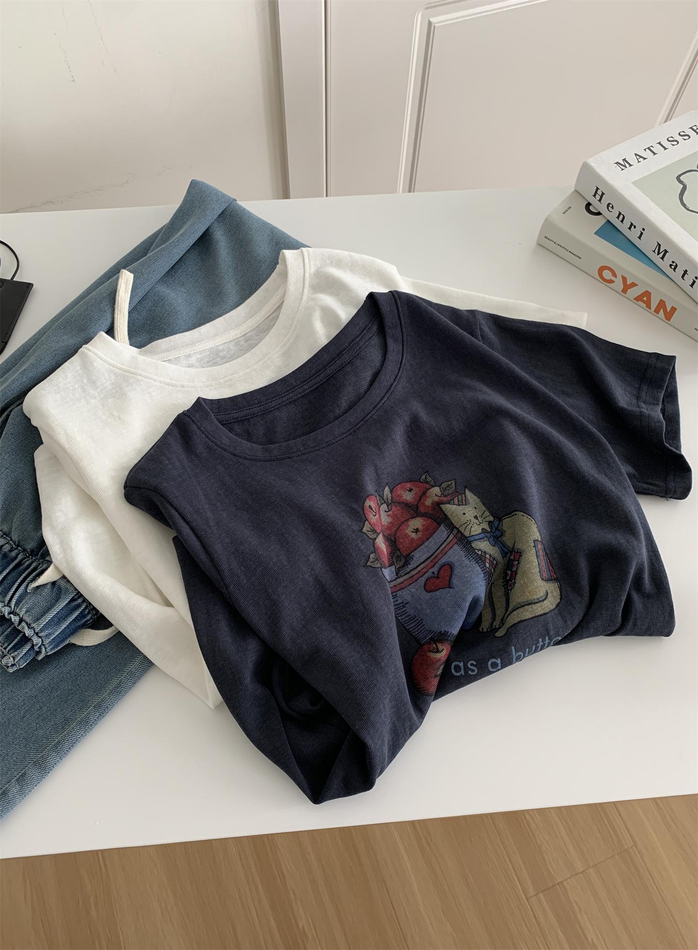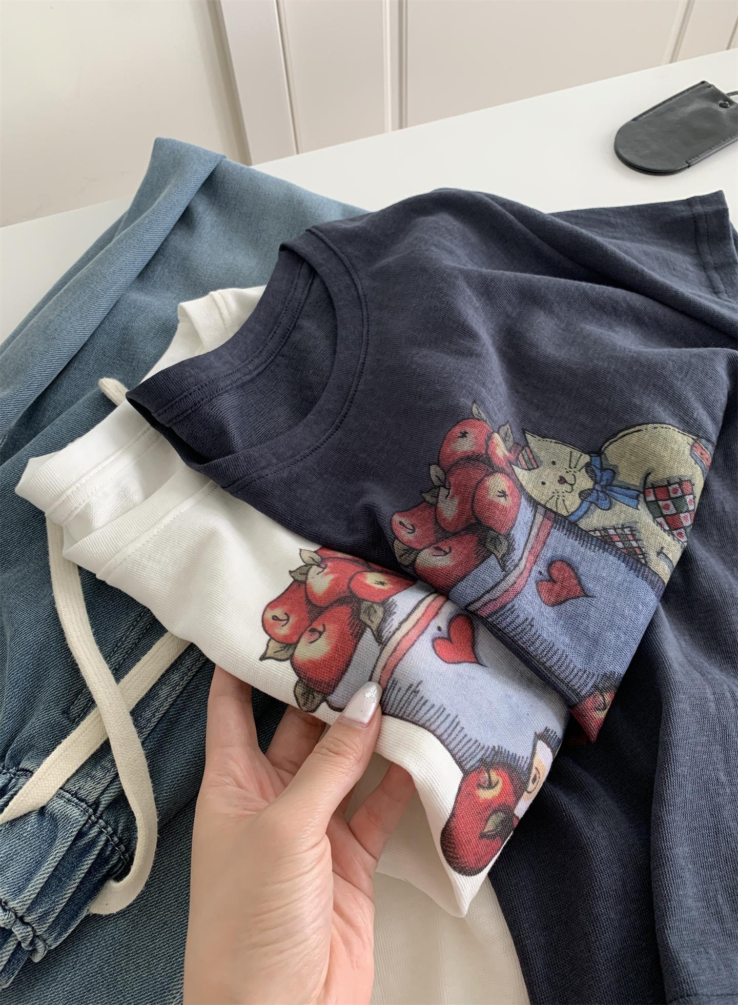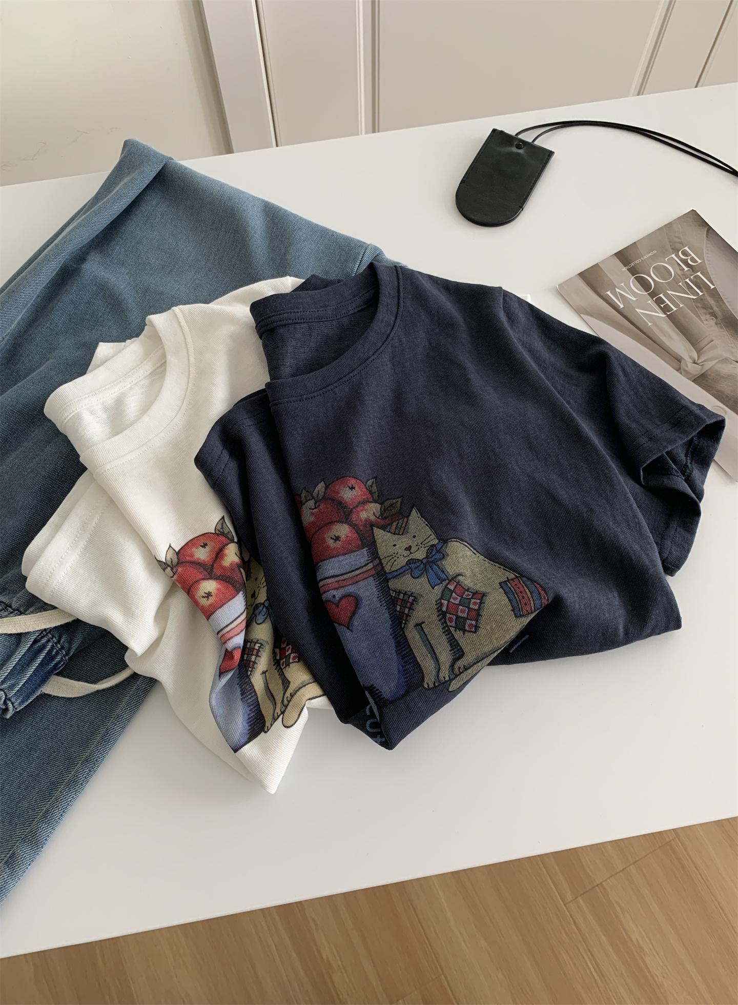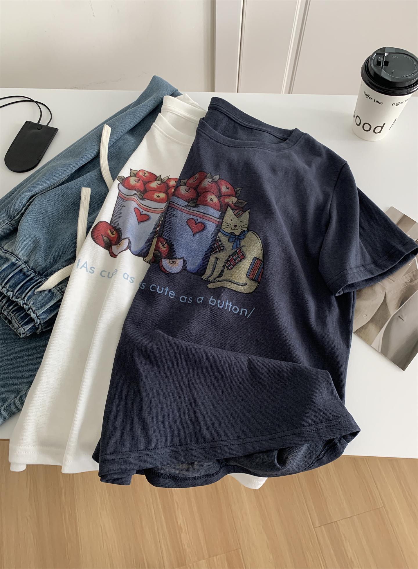 Camiseta de Verano Fina Estilo Coreano Reductor de Edad Estampado de Gato y Frutas para Mujer Algodón Copo de Nieve Suelta Cuello Redondo Manga Corta