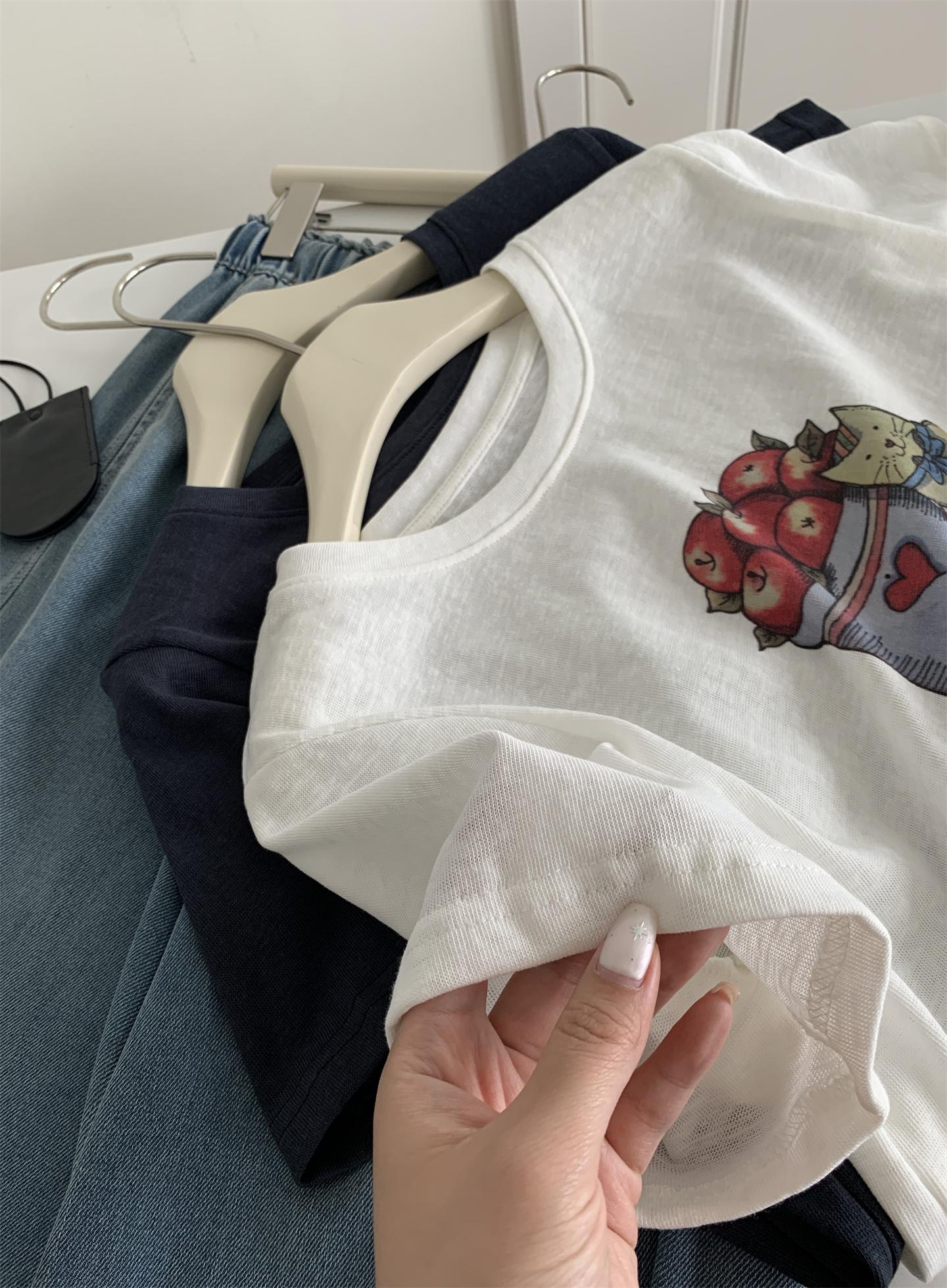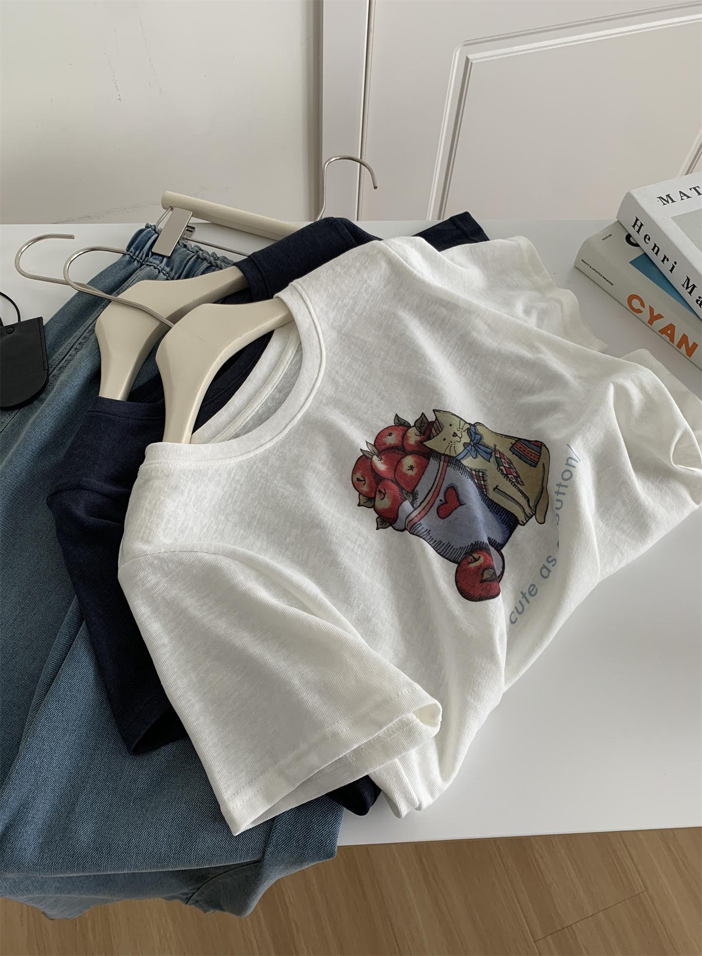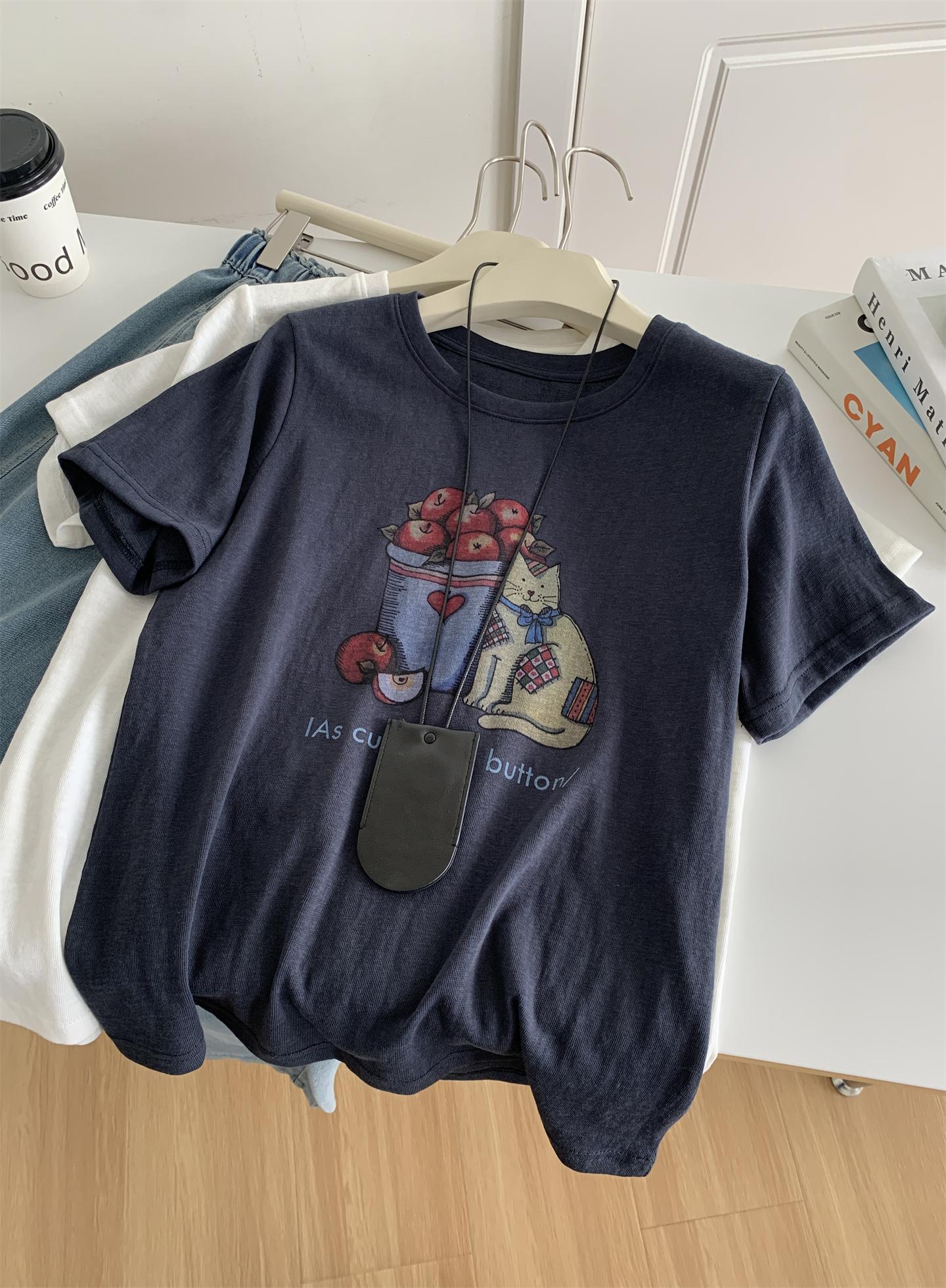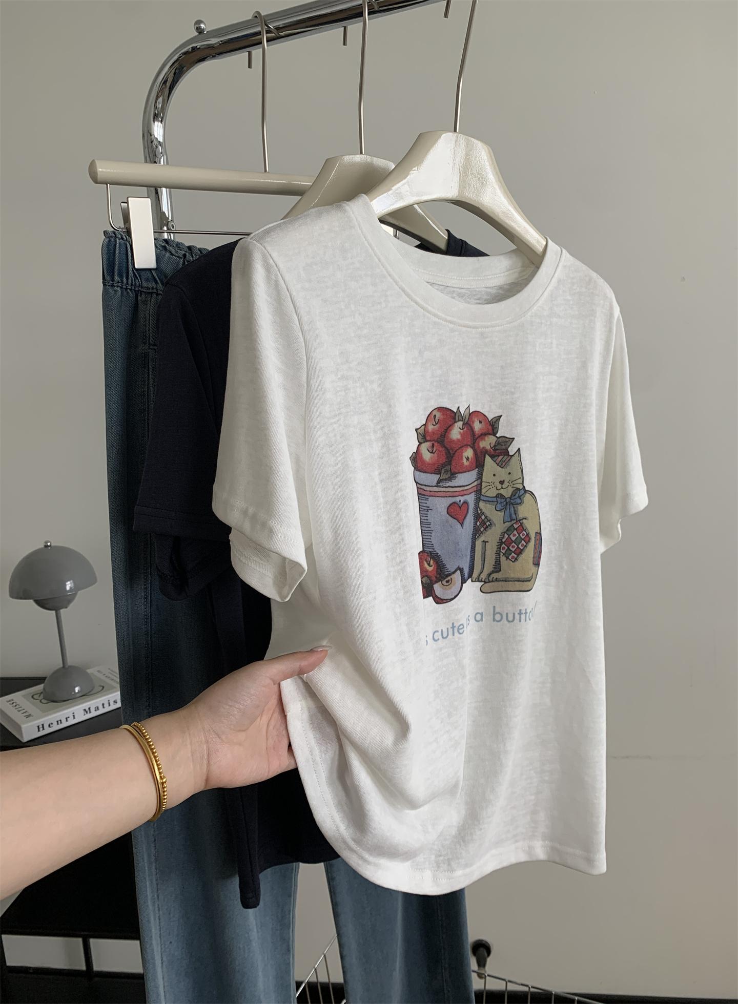 Camiseta de Verano Fina Estilo Coreano Reductor de Edad Estampado de Gato y Frutas para Mujer Algodón Copo de Nieve Suelta Cuello Redondo Manga Corta