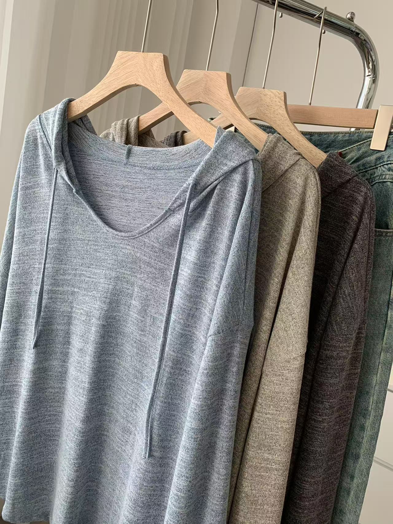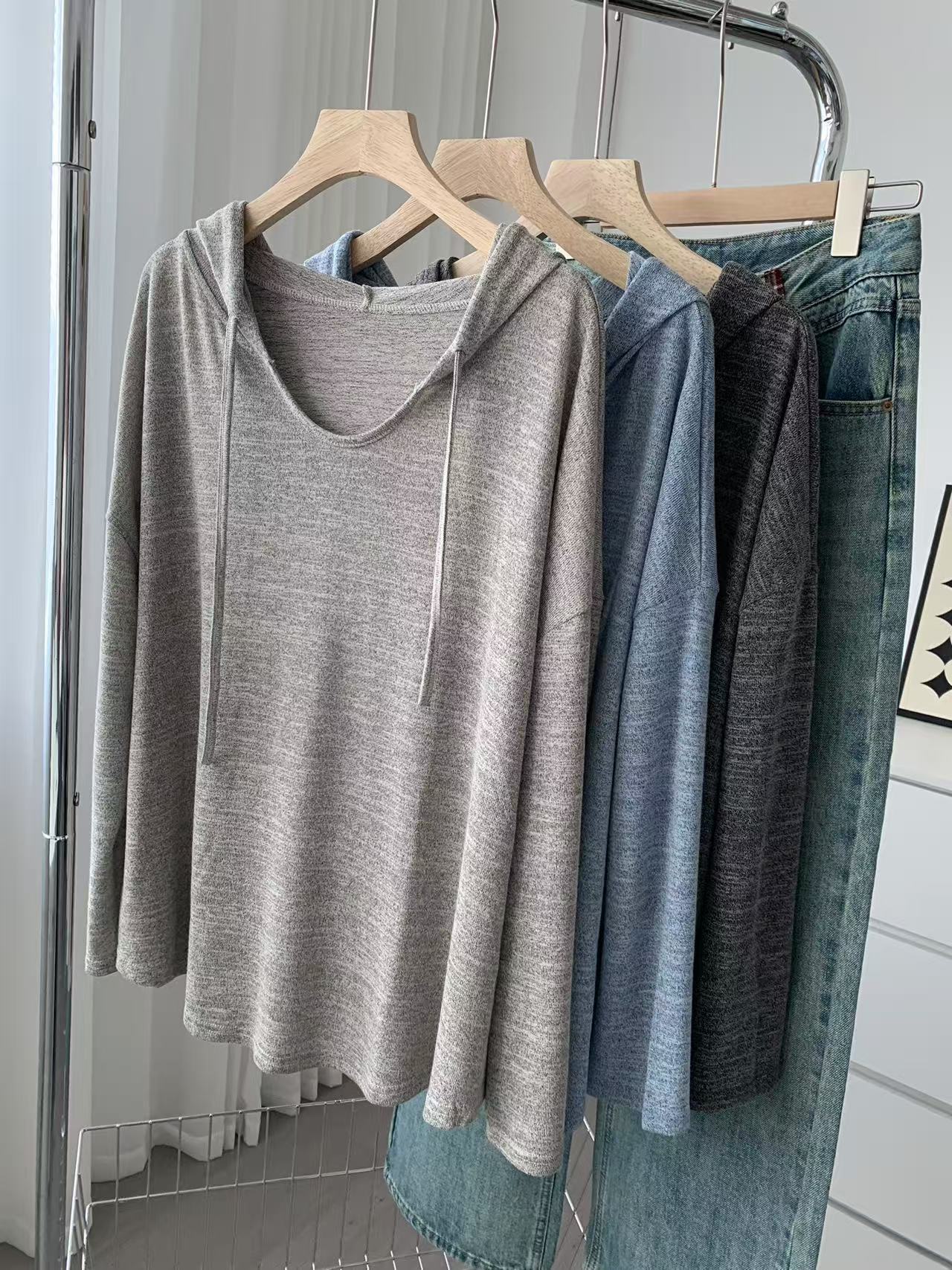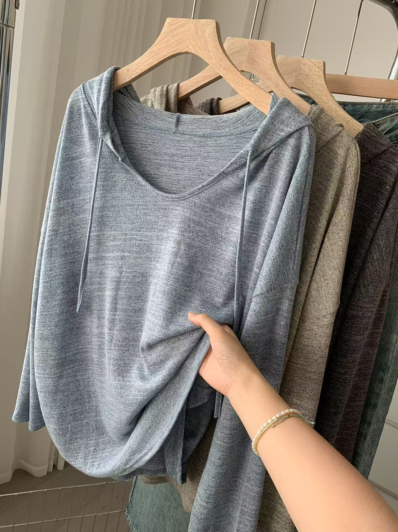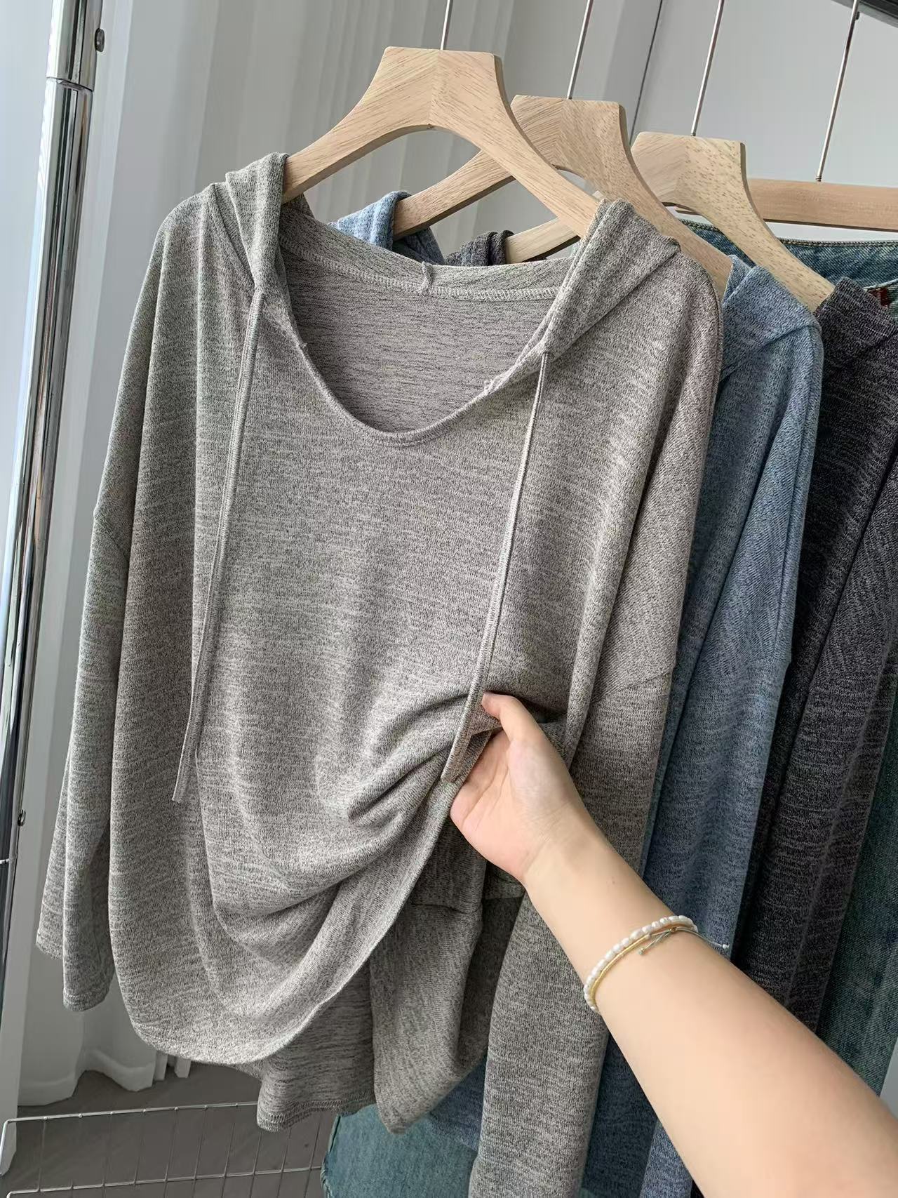 Sudadera holgada con capucha para mujer, estilo perezoso, cuello en U, con cordones, hombro caído, manga larga, color sólido, dobladillo arqueado, camiseta básica, sudadera delgada