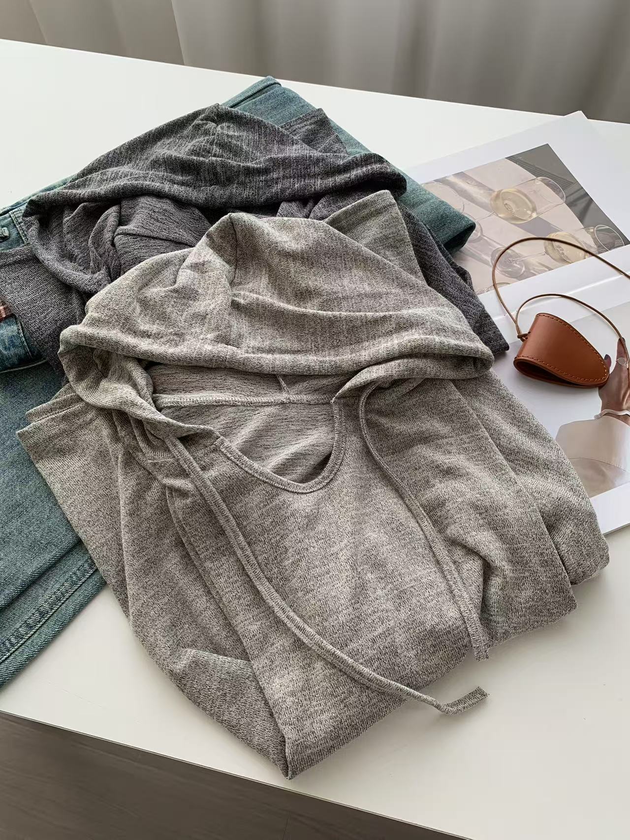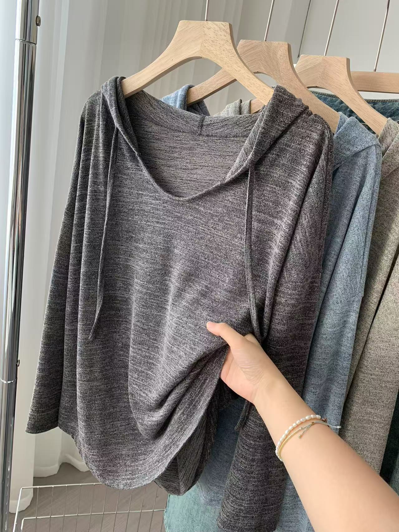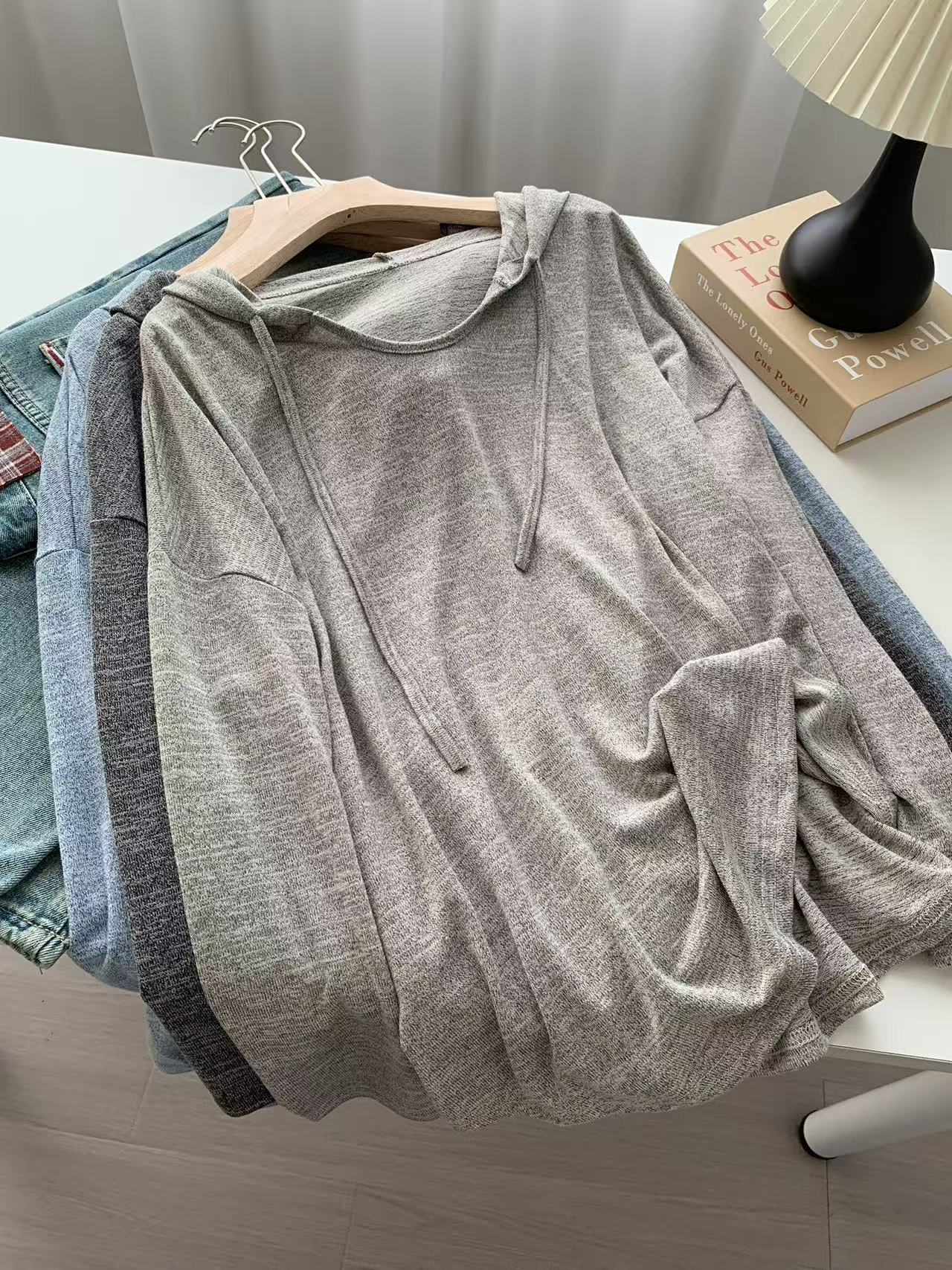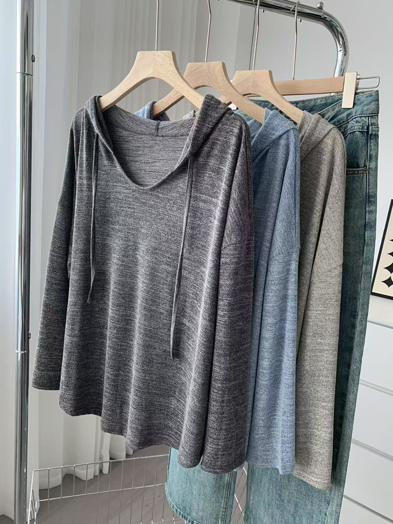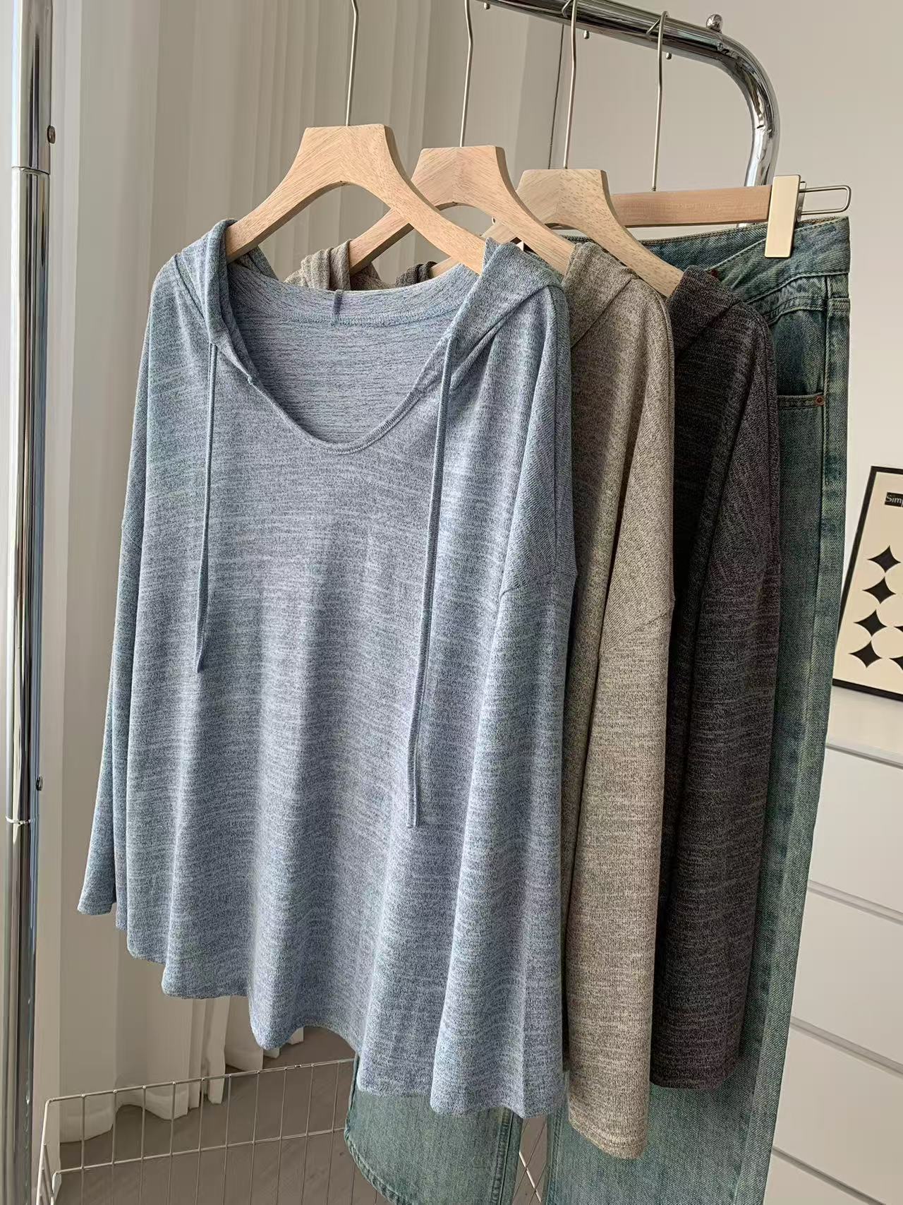 Sudadera holgada con capucha para mujer, estilo perezoso, cuello en U, con cordones, hombro caído, manga larga, color sólido, dobladillo arqueado, camiseta básica, sudadera delgada