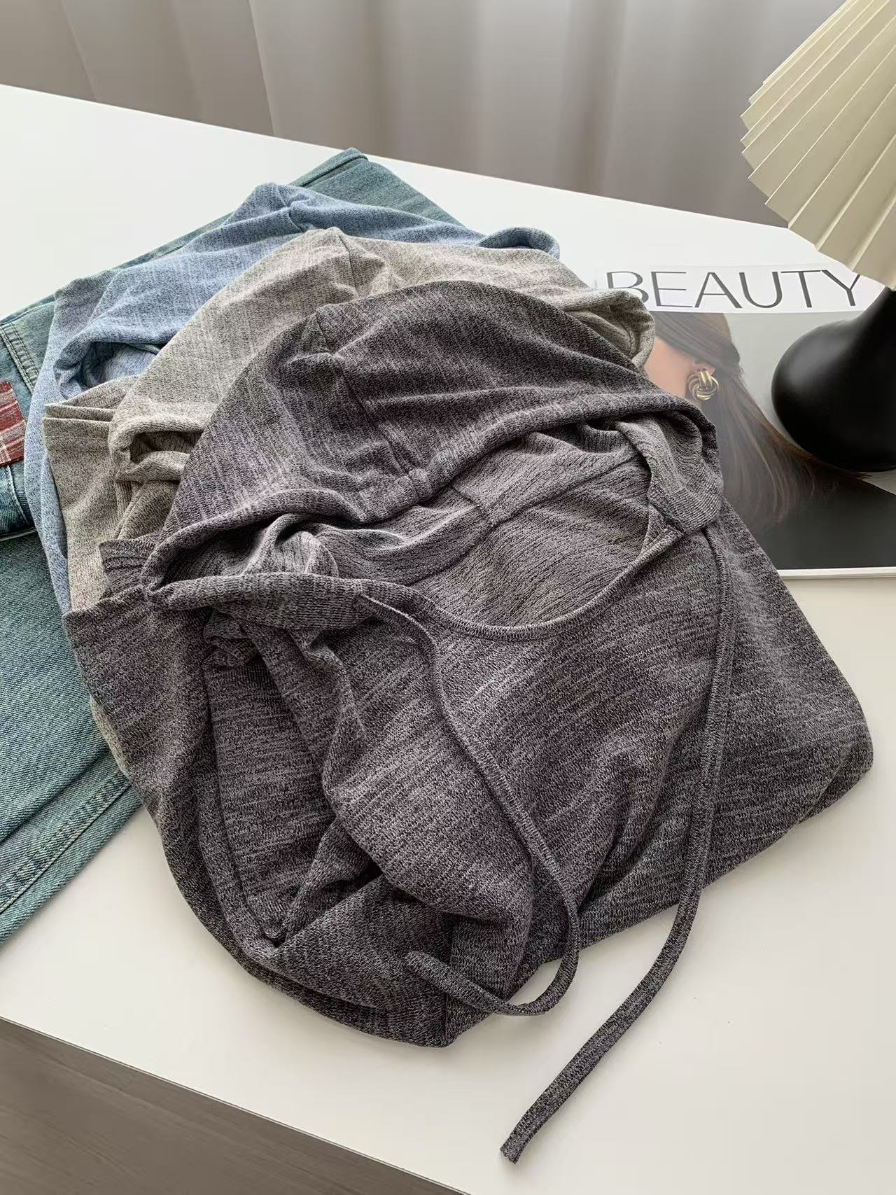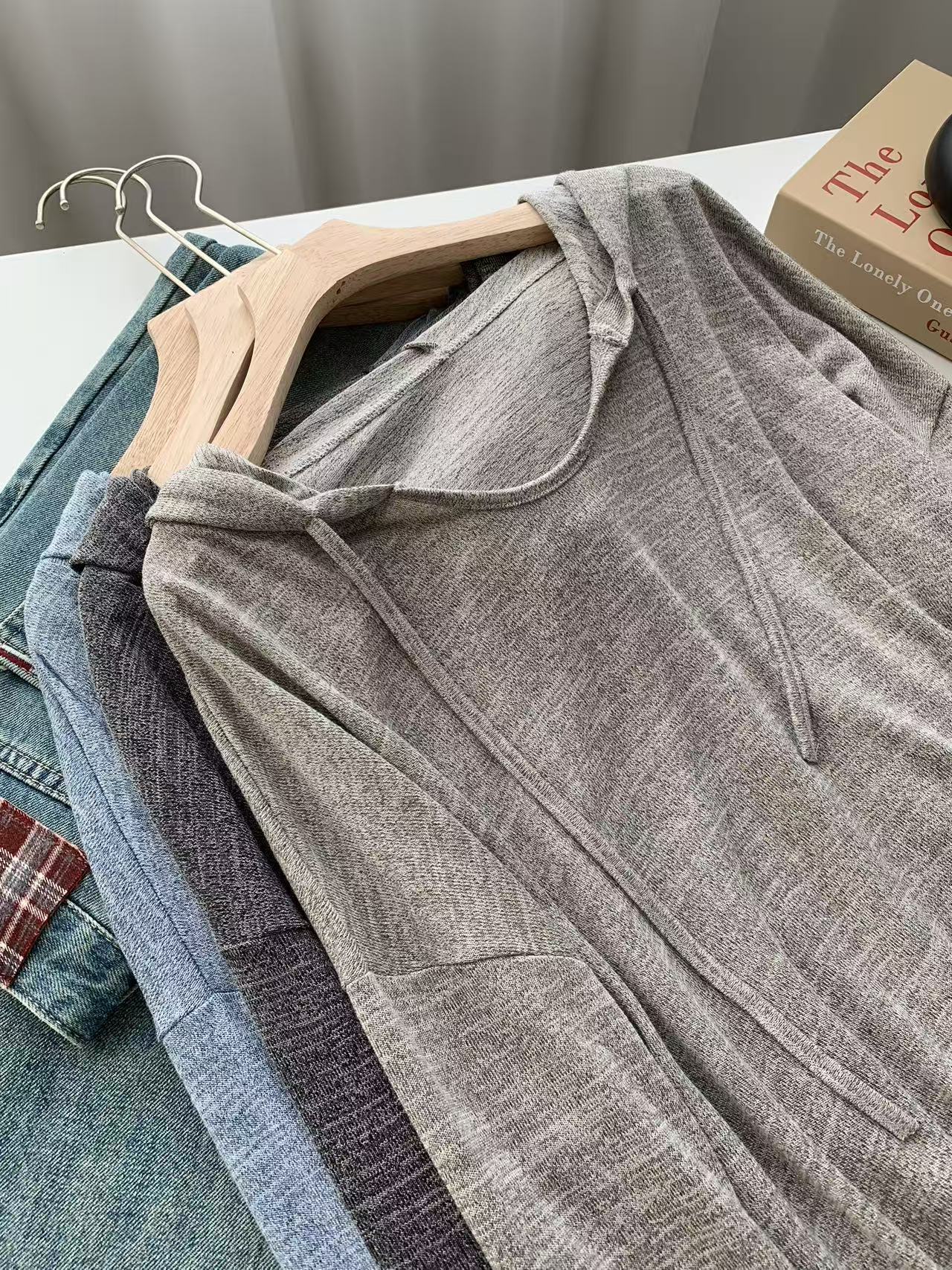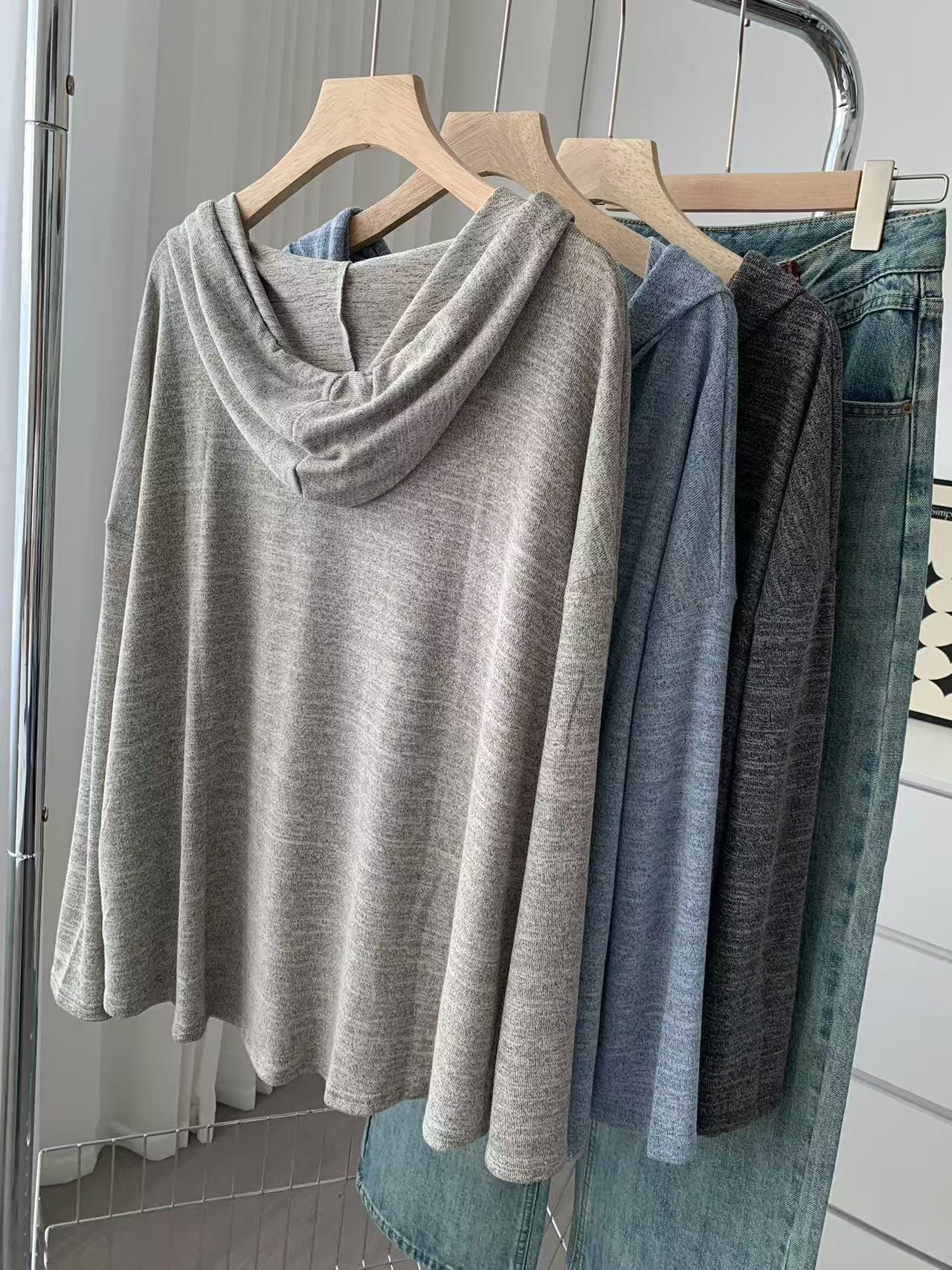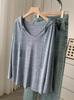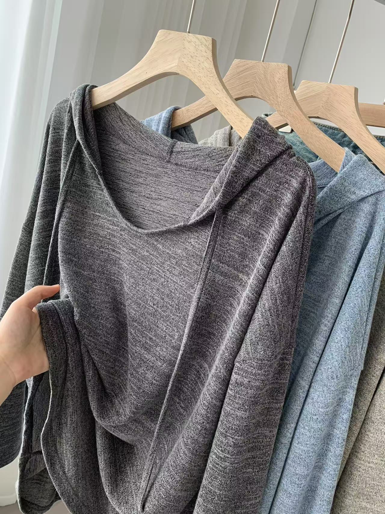 Sudadera holgada con capucha para mujer, estilo perezoso, cuello en U, con cordones, hombro caído, manga larga, color sólido, dobladillo arqueado, camiseta básica, sudadera delgada